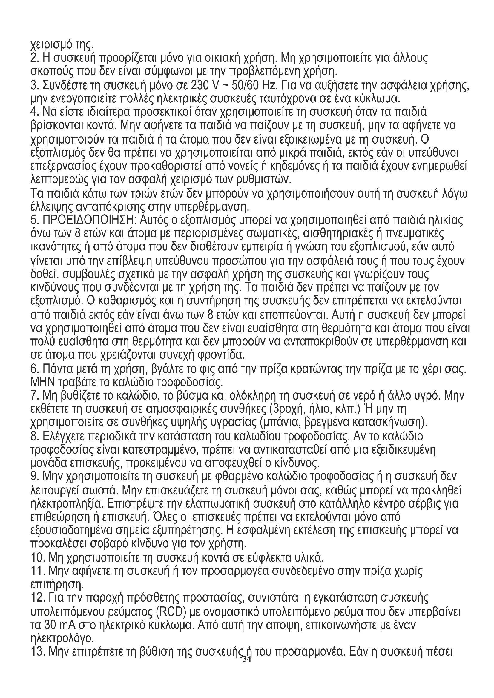 άνω των 8 ετών και άτομα με περιορισμένες σωματικές, αισθητηριακές ή πνευματικές ικανότητες ή από άτομα που δεν διαθέτουν εμπειρία ή γνώση του εξοπλισμού, εάν αυτό γίνεται υπό την επίβλεψη υπεύθυνου προσώπου για την ασφάλειά τους ή που τους έχουν δοθεί. συμβουλές σχετικά με την ασφαλή χρήση της συσκευής και γνωρίζουν τους κινδύνους που συνδέονται με τη χρήση της. Τα παιδιά δεν πρέπει να παίζουν με τον εξοπλισμό. Ο καθαρισμός και η συντήρηση της συσκευής δεν επιτρέπεται να εκτελούνται από παιδιά εκτός εάν είναι άνω των 8 ετών και εποπτεύονται. Αυτή η συσκευή δεν μπορεί να χρησιμοποιηθεί από άτομα που δεν είναι ευαίσθητα στη θερμότητα και άτομα που είναι πολύ ευαίσθητα στη θερμότητα και δεν μπορούν να ανταποκριθούν σε υπερθέρμανση και σε άτομα που χρειάζονται συνεχή φροντίδα.