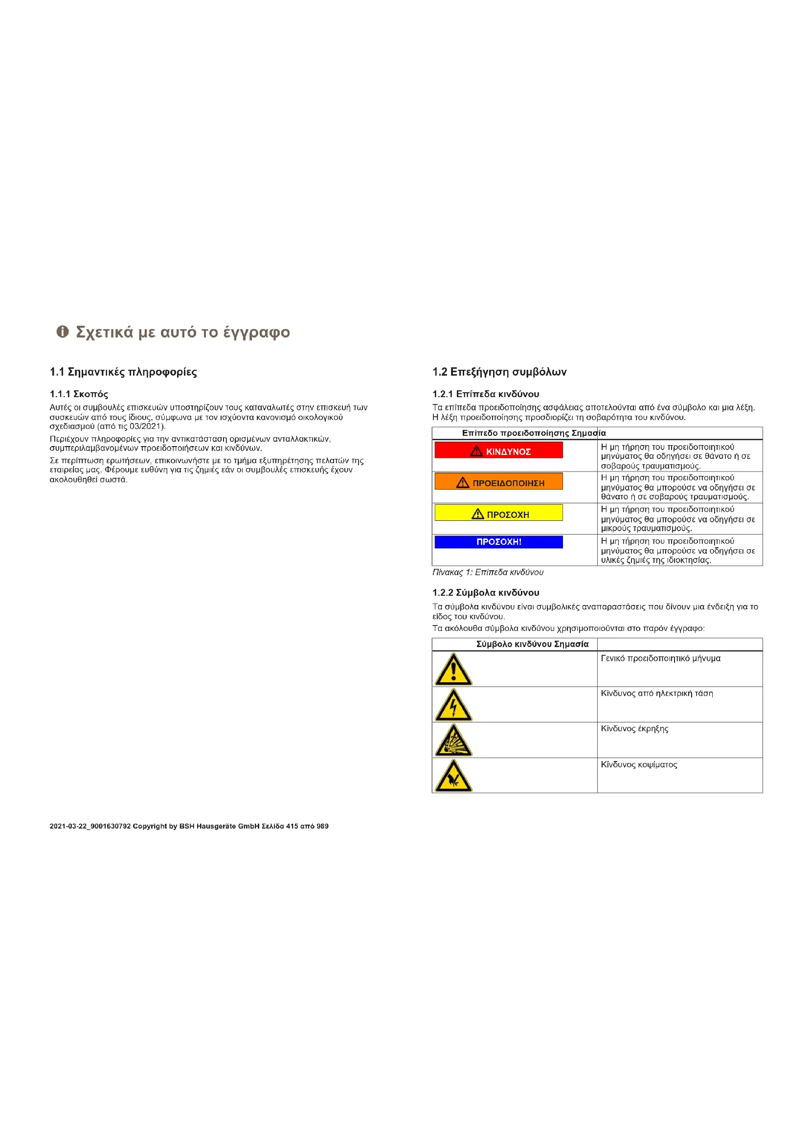 Ταυτοποίηση απαραίτητων εργαλείων Ταυτοποίηση απαραίτητων προϋποθέσεων Ταυτοποίηση μιας συνθήκης (αν ..., κατόπιν ...) Ταυτοποίηση αποτελέσματος Έναρξη Ταυτοποίηση ενός πλήκτρου ή κουμπιού [00123456] Ταυτοποίηση ενός κωδικού ανταλλακτικού Κατάσταση Ταυτοποίηση εμφανιζόμενου κειμένου/ παραθύρου (στην οθόνη της συσκευής) Πίνακας3: Γενικά σύμβολα Σχετικά με αυτό το έγγραφο 2021-03-22_9001630792 Copyright by BSH Hausgeräte GmbH Σελίδα416από989Ασφάλεια