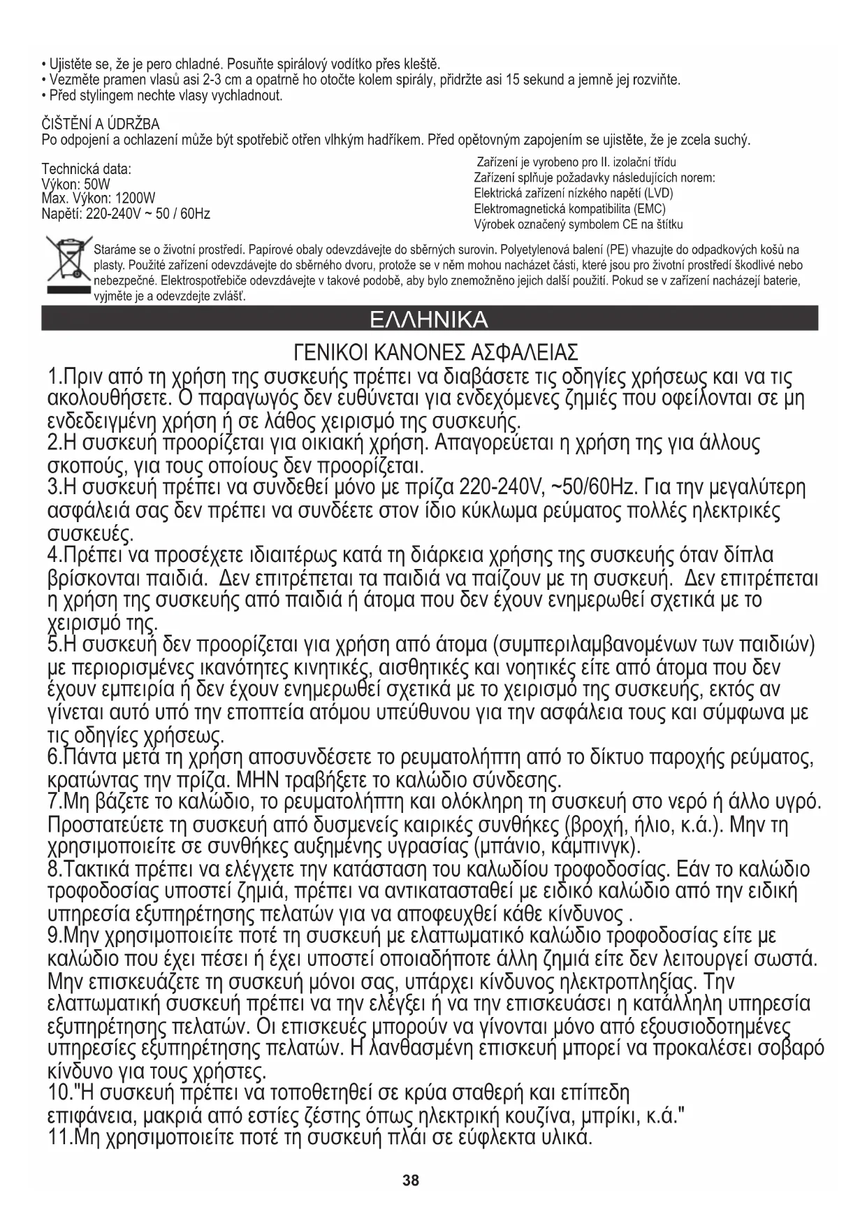 5.Η συσκευή δεν προορίζεται για χρήση από άτομα (συμπεριλαμβανομένων των παιδιών) με περιορισμένες ικανότητες κινητικές, αισθητικές και νοητικές είτε από άτομα που δεν έχουν εμπειρία ή δεν έχουν ενημερωθεί σχετικά με το χειρισμό της συσκευής, εκτός αν γίνεται αυτό υπό την εποπτεία ατόμου υπεύθυνου για την ασφάλεια τους και σύμφωνα με τις οδηγίες χρήσεως. 8.Τακτικά πρέπει να ελέγχετε την κατάσταση του καλωδίου τροφοδοσίας. Εάν το καλώδιο τροφοδοσίας υποστεί ζημιά, πρέπει να αντικατασταθεί με ειδικό καλώδιο από την ειδική υπηρεσία εξυπηρέτησης πελατών για να αποφευχθεί κάθε κίνδυνος . 1.Πριν από τη χρήση της συσκευής πρέπει να διαβάσετε τις οδηγίες χρήσεως και να τις ακολουθήσετε. Ο παραγωγός δεν ευθύνεται για ενδεχόμενες ζημιές που οφείλονται σε μη ενδεδειγμένη χρήση ή σε λάθος χειρισμό της συσκευής. 2.Η συσκευή προορίζεται για οικιακή χρήση. Απαγορεύεται η χρήση της για άλλους σκοπούς, για τους οποίους δεν προορίζεται. 4.Πρέπει να προσέχετε ιδιαιτέρως κατά τη διάρκεια χρήσης της συσκευής όταν δίπλα βρίσκονται παιδιά. Δεν επιτρέπεται τα παιδιά να παίζουν με τη συσκευή. Δεν επιτρέπεται η χρήση της συσκευής από παιδιά ή άτομα που δεν έχουν ενημερωθεί σχετικά με το χειρισμό της. 6.Πάντα μετά τη χρήση αποσυνδέσετε το ρευματολήπτη από το δίκτυο παροχής ρεύματος, κρατώντας την πρίζα. ΜΗΝ τραβήξετε το καλώδιο σύνδεσης. 7.Μη βάζετε το καλώδιο, το ρευματολήπτη και ολόκληρη τη συσκευή στο νερό ή άλλο υγρό. Προστατεύετε τη συσκευή από δυσμενείς καιρικές συνθήκες (βροχή, ήλιο, κ.ά.). Μην τη χρησιμοποιείτε σε συνθήκες αυξημένης υγρασίας (μπάνιο, κάμπινγκ). επιφάνεια, μακριά από εστίες ζέστης όπως ηλεκτρική κουζίνα, μπρίκι, κ.ά." 11.Μη χρησιμοποιείτε ποτέ τη συσκευή πλάι σε εύφλεκτα υλικά. 10."Η συσκευή πρέπει να τοποθετηθεί σε κρύα σταθερή και επίπεδη 9.Μην χρησιμοποιείτε ποτέ τη συσκευή με ελαττωματικό καλώδιο τροφοδοσίας είτε με καλώδιο που έχει πέσει ή έχει υποστεί οποιαδήποτε άλλη ζημιά είτε δεν λειτουργεί σωστά. Μην επισκευάζετε τη συσκευή μόνοι σας, υπάρχει κίνδυνος ηλεκτροπληξίας. Την ελαττωματική συσκευή πρέπει να την ελέγξει ή να την επισκευάσει η κατάλληλη υπηρεσία εξυπηρέτησης πελατών. Οι επισκευές μπορούν να γίνονται μόνο από εξουσιοδοτημένες υπηρεσίες εξυπηρέτησης πελατών. Η λανθασμένη επισκευή μπορεί να προκαλέσει σοβαρό κίνδυνο για τους χρήστες.