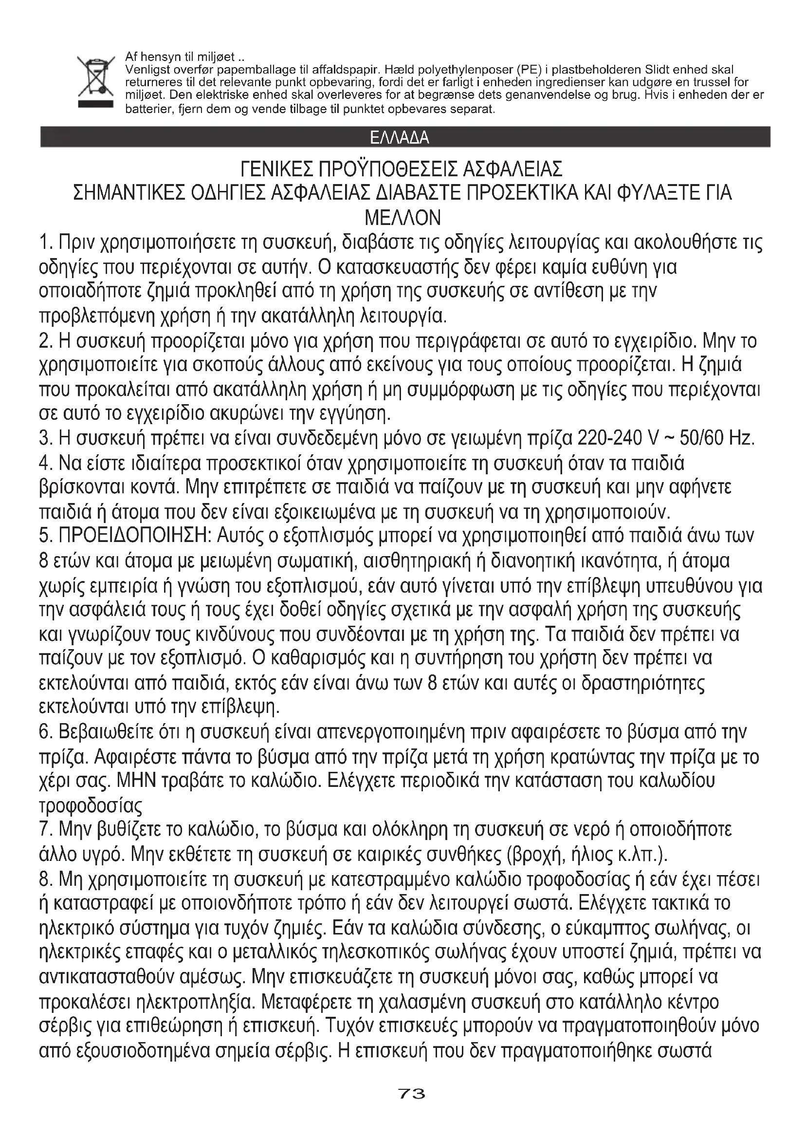 8 ετών και άτομα με μειωμένη σωματική, αισθητηριακή ή διανοητική ικανότητα, ή άτομα χωρίς εμπειρία ή γνώση του εξοπλισμού, εάν αυτό γίνεται υπό την επίβλεψη υπευθύνου για την ασφάλειά τους ή τους έχει δοθεί οδηγίες σχετικά με την ασφαλή χρήση της συσκευής και γνωρίζουν τους κινδύνους που συνδέονται με τη χρήση της. Τα παιδιά δεν πρέπει να παίζουν με τον εξοπλισμό. Ο καθαρισμός και η συντήρηση του χρήστη δεν πρέπει να εκτελούνται από παιδιά, εκτός εάν είναι άνω των 8 ετών και αυτές οι δραστηριότητες εκτελούνται υπό την επίβλεψη.