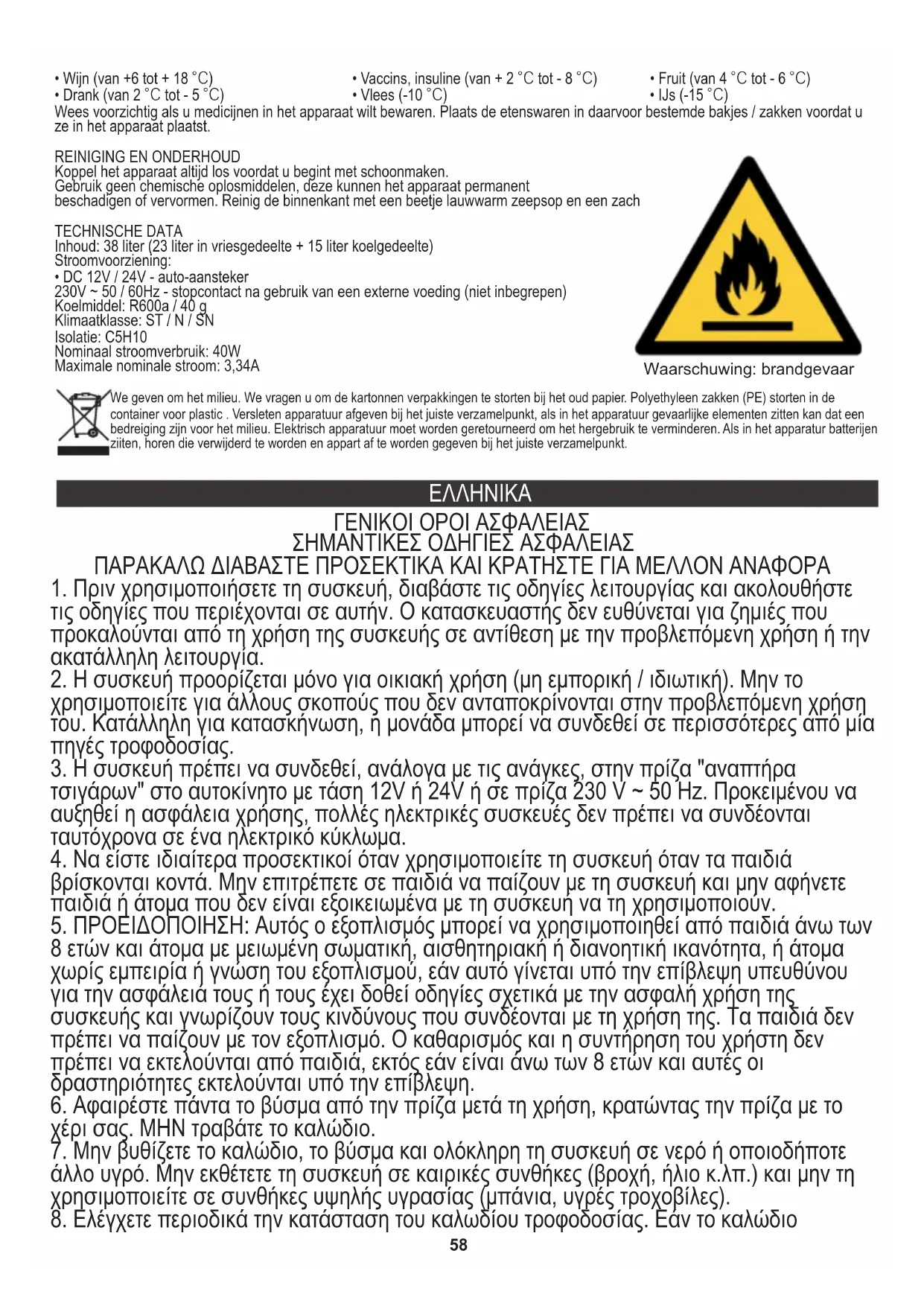 - Drank (van 2 ℃ tot - 5 ℃) • Vlees (-10 ℃) • IJs (-15 ℃) Waarschuwing: brandgevaar59 ρεύματος είναι κατεστραμμένο, θα πρέπει να αντικατασταθεί από εξειδικευμένο συνεργείο επισκευής για να αποφευχθεί ο κίνδυνος.