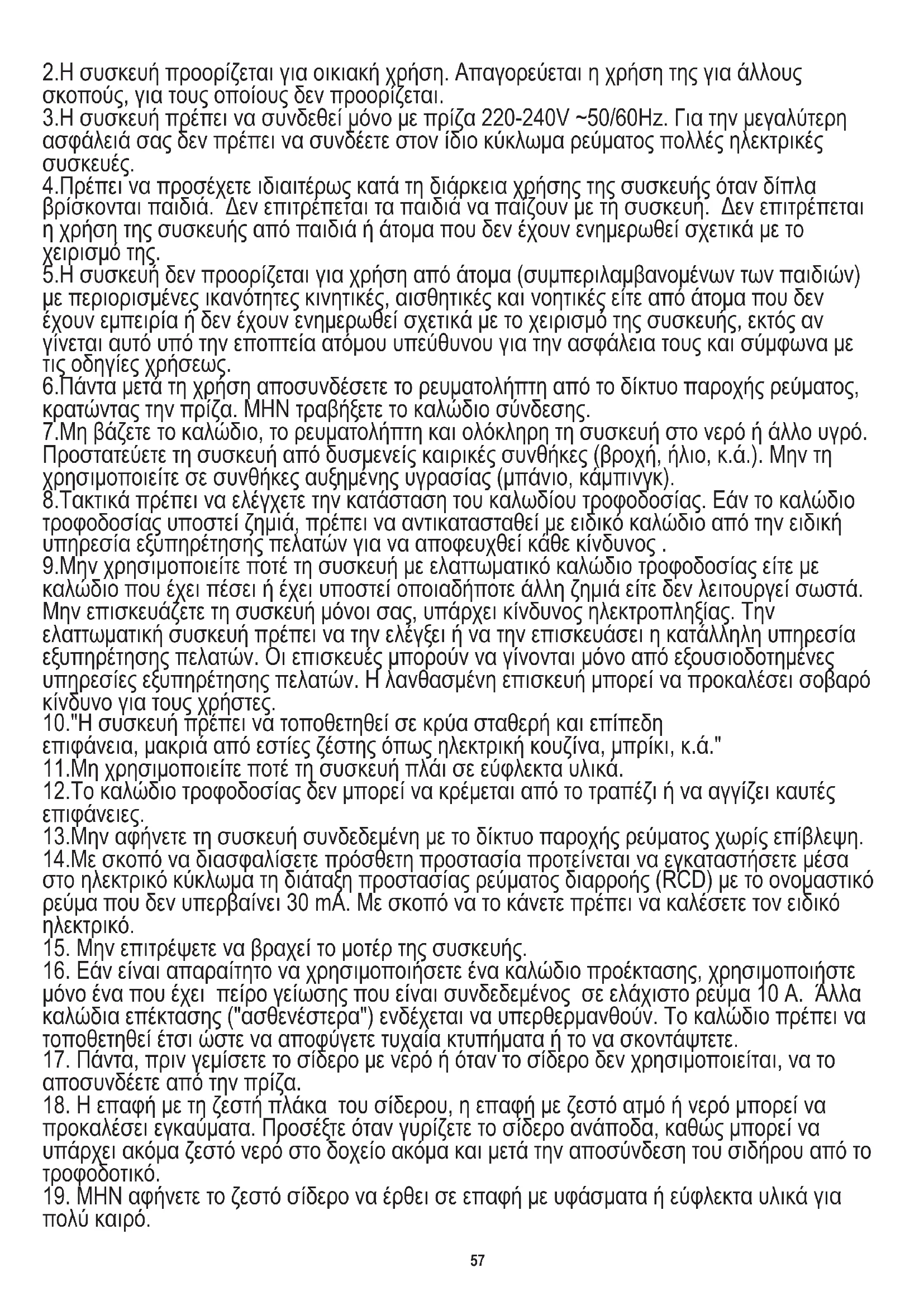 19. ΜΗΝ αφήνετε το ζεστό σίδερο να έρθει σε επαφή με υφάσματα ή εύφλεκτα υλικά για