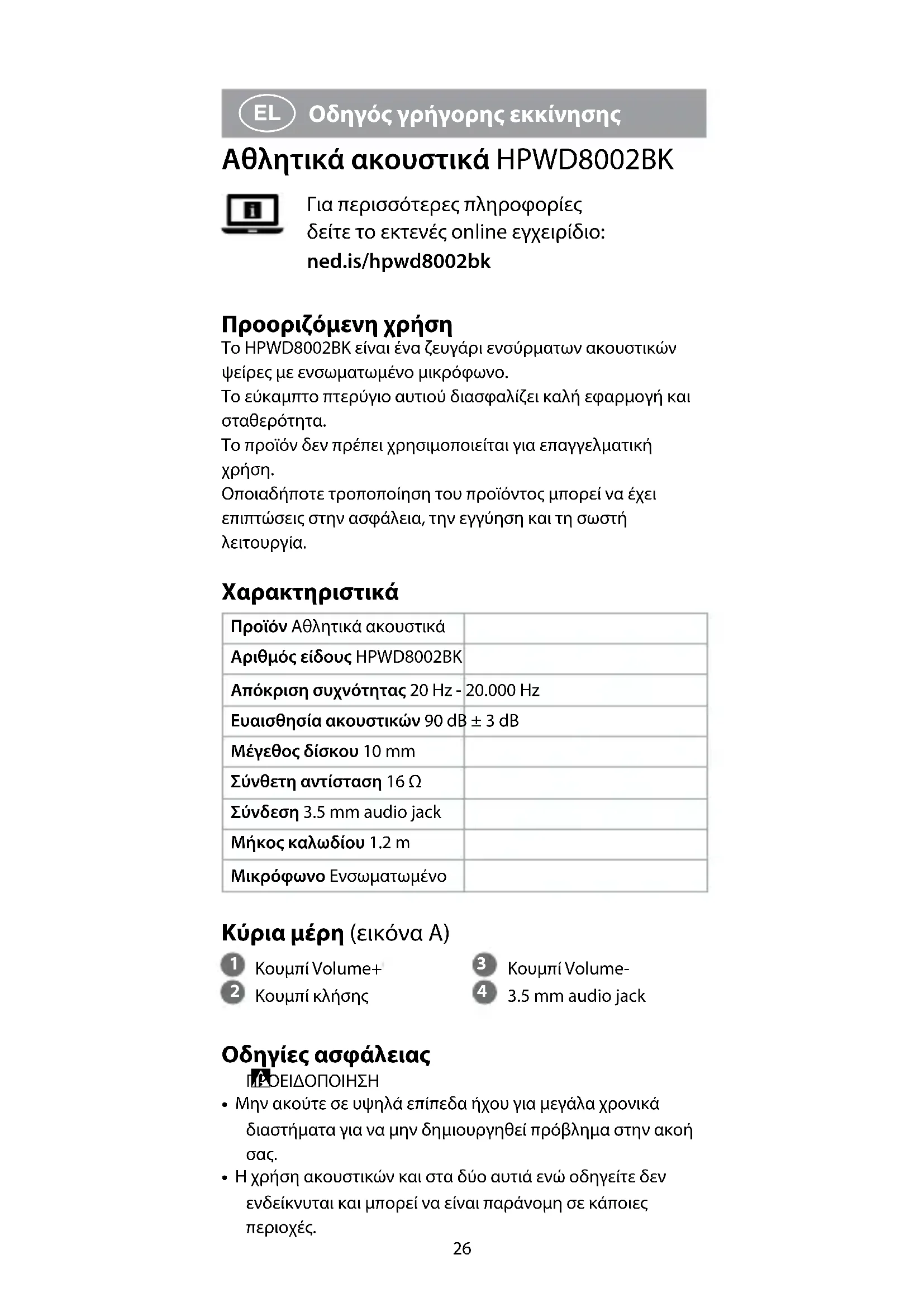 Οδηγός γρήγορης εκκίνησης Αθλητικά ακουστικά HPWD8002BK Για περισσότερες πληροφορίες δείτε το εκτενές online εγχειρίδιο: ned.is/hpwd8002bk Προοριζόμενη χρήση Το HPWD8002BK είναι ένα ζευγάρι ενσύρματων ακουστικών ψείρες με ενσωματωμένο μικρόφωνο.Το εύκαμπτο πτερύγιο αυτιού διασφαλίζει καλή εφαρμογή και σταθερότητα.Το προϊόν δεν πρέπει χρησιμοποιείται για επαγγελματική χρήση.Οποιαδήποτε τροποποίηση του προϊόντος μπορεί να έχει επιπτώσεις στην ασφάλεια, την εγγύηση και τη σωστή λειτουργία. Χαρακτηριστικά Προϊόν Αθλητικά ακουστικάΑριθμός είδους HPWD8002BKΑπόκριση συχνότητας 20 Hz - 20.000 HzΕυαισθησία ακουστικών 90 dB ± 3 dBΜέγεθος δίσκου 10 mmΣύνθετη αντίσταση 16 ΩΣύνδεση 3.5 mm audio jackΜήκος καλωδίου 1.2 mΜικρόφωνο Ενσωματωμένο Κύρια μέρη (εικόνα A)