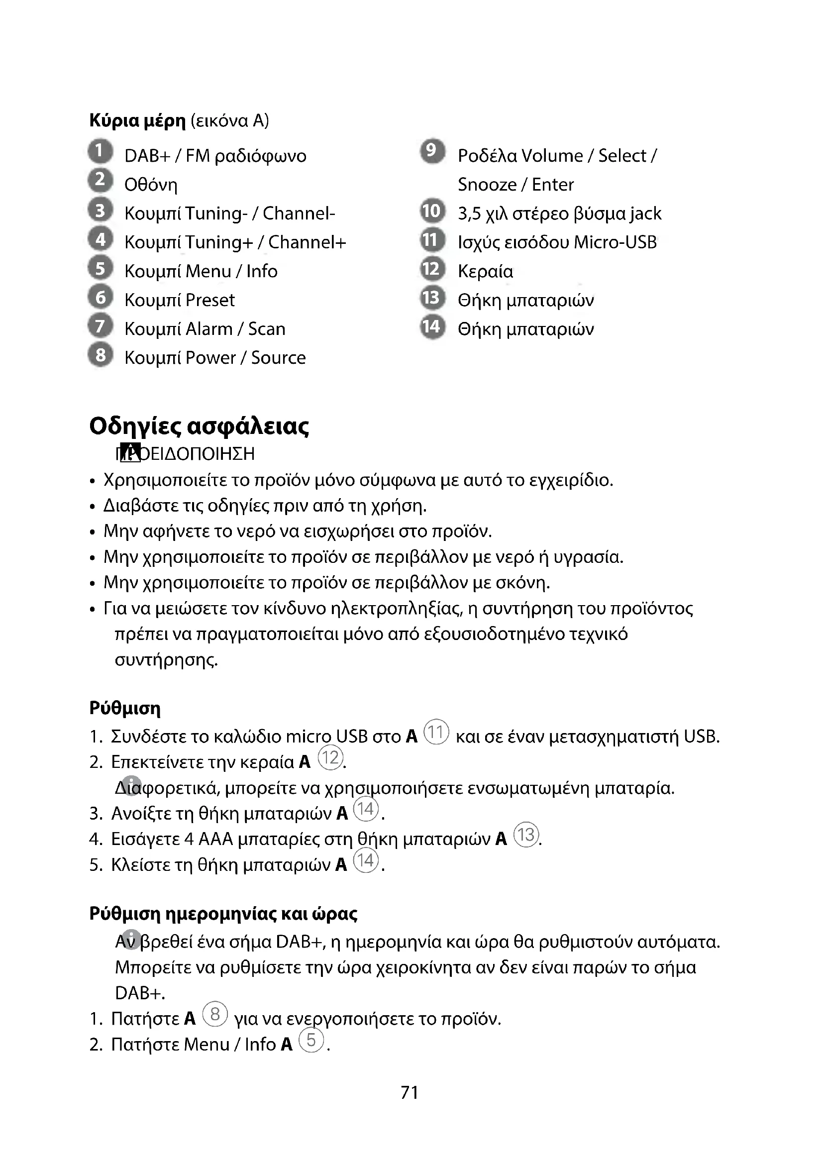 Οδηγός γρήγορης εκκίνησης DAB+ / FM ραδιόφωνο RDDB1000BK Για περισσότερες πληροφορίες δείτε το εκτενές online εγχειρίδιο: ned.is/rddb1000bk Προοριζόμενη χρήση Το προϊόν προορίζεται αποκλειστικά σαν ραδιόφωνο με ξυπνητήρι. Οποιαδήποτε τροποποίηση του προϊόντος μπορεί να έχει επιπτώσεις στην ασφάλεια, την εγγύηση και τη σωστή λειτουργία.71 Κύρια μέρη (εικόνα A)