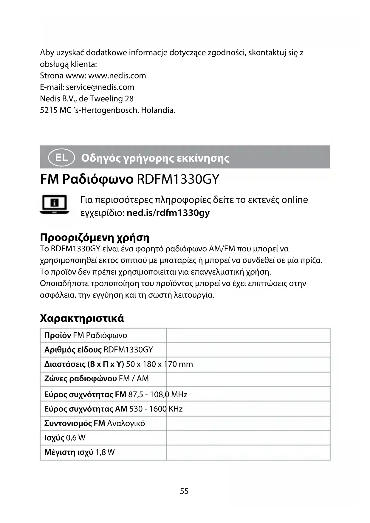 , το οποίο κατασκευάζεται στην Κίνα, έχει ελεγχθεί σύμφωνα με όλα τα σχετικά πρότυπα και κανονισμούς της ΕΚ και ότι όλοι οι έλεγχοι έχει ολοκληρωθεί με επιτυχία. Η δήλωση συμμόρφωσης περιλαμβάνει αλλά δεν περιορίζεται στον κανονισμό RED 2014/53/EU.59 Το πλήρες κείμενο της δήλωσης συμμόρφωσης (και το δελτίο ασφάλεια όπου ισχύει) υπάρχει και είναι διαθέσιμο προς λήψη στο: nedis.gr/rdfm1330gy#support Για περισσότερες πληροφορίες σχετικά με τη δήλωση συμμόρφωσης, επικοινωνήστε με την υπηρεσία εξυπηρέτησης πελατών: Web: www.nedis.com E-mail: service@nedis.com Nedis B.V., de Tweeling 28 5215 MC ’s-Hertogenbosch, the Netherlands