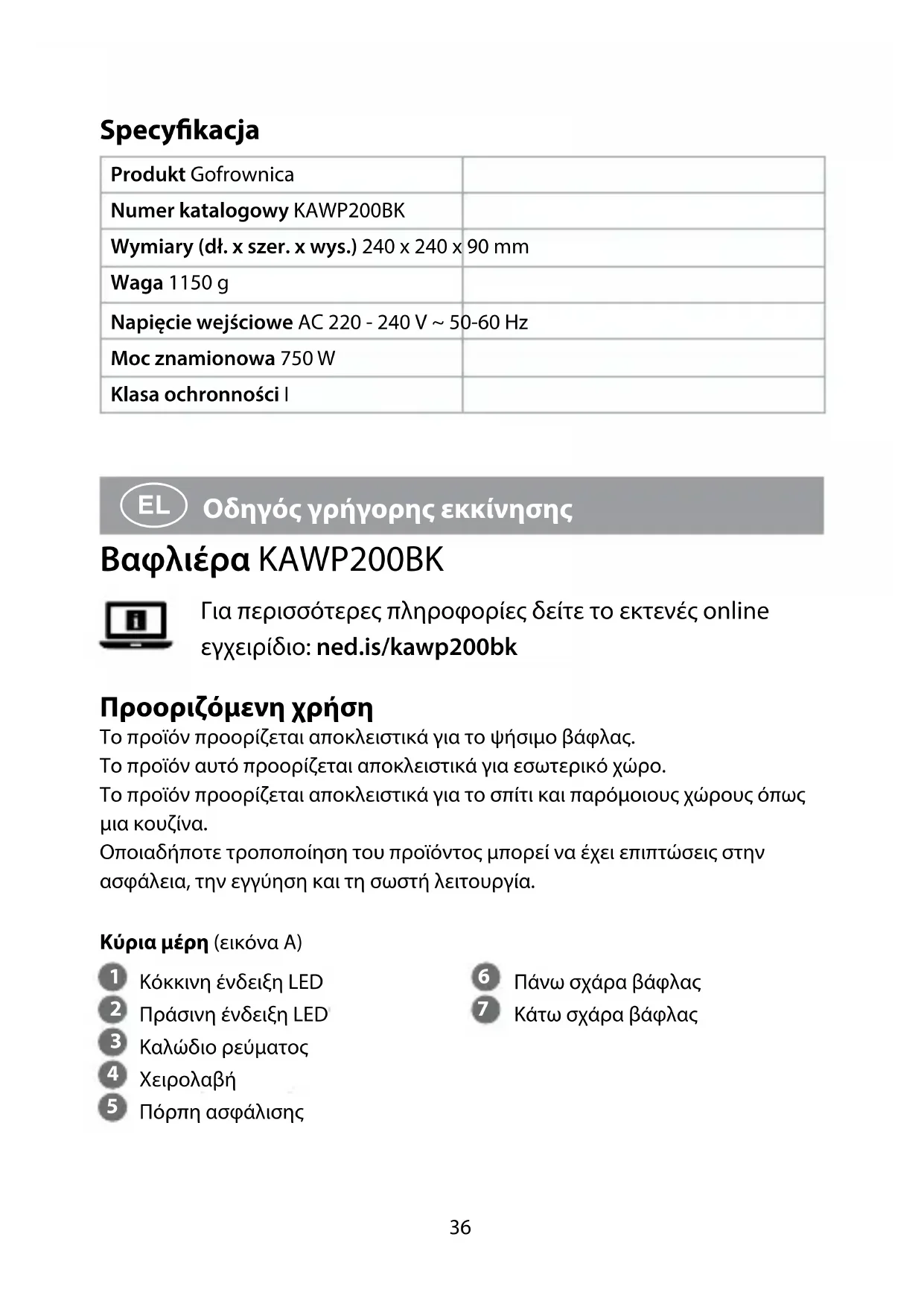 Οδηγός γρήγορης εκκίνησης Βαφλιέρα KAWP200BK Για περισσότερες πληροφορίες δείτε το εκτενές online εγχειρίδιο: ned.is/kawp200bk Προοριζόμενη χρήση Το προϊόν προορίζεται αποκλειστικά για το ψήσιμο βάφλας. Το προϊόν αυτό προορίζεται αποκλειστικά για εσωτερικό χώρο. Το προϊόν προορίζεται αποκλειστικά για το σπίτι και παρόμοιους χώρους όπως μια κουζίνα. Οποιαδήποτε τροποποίηση του προϊόντος μπορεί να έχει επιπτώσεις στην ασφάλεια, την εγγύηση και τη σωστή λειτουργία. Κύρια μέρη (εικόνα A)