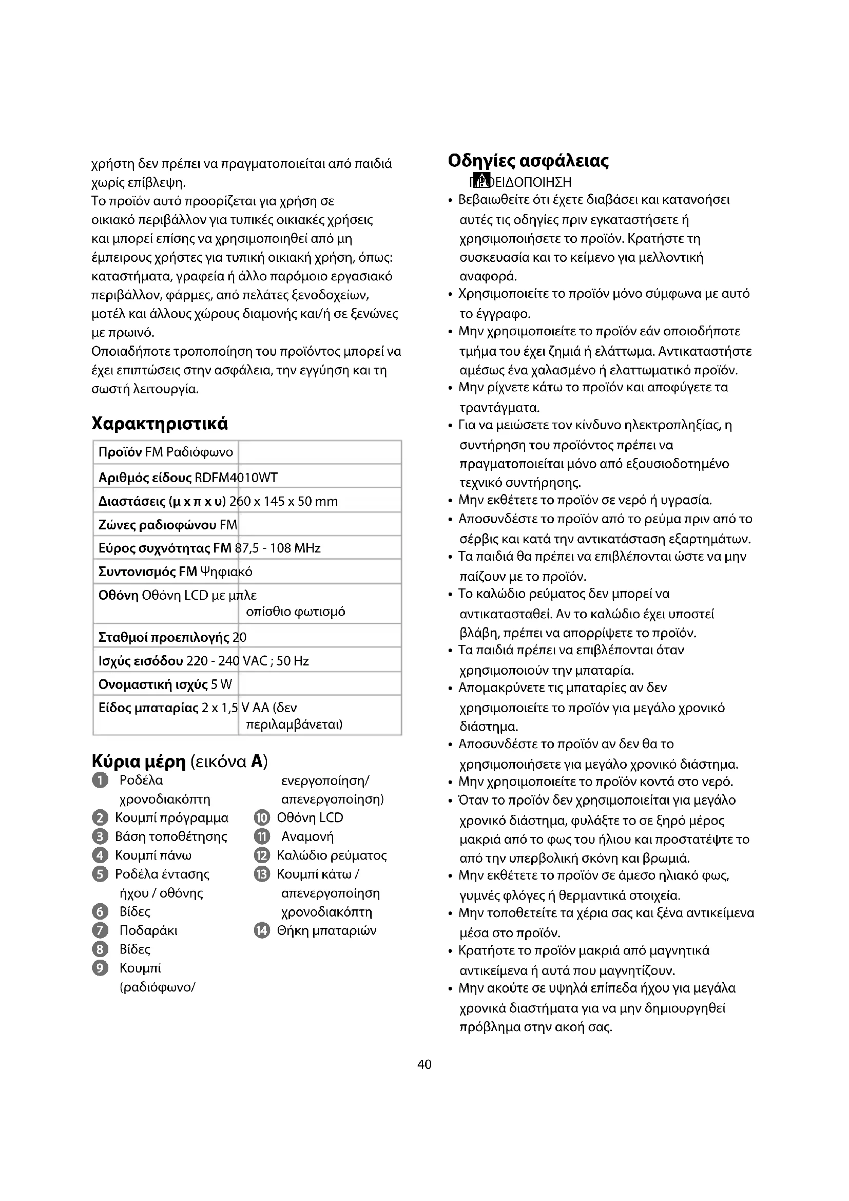 Οποιαδήποτε τροποποίηση του προϊόντος μπορεί να έχει επιπτώσεις στην ασφάλεια, την εγγύηση και τη σωστή λειτουργία. Χαρακτηριστικά Προϊόν FM Ραδιόφωνο Αριθμός είδους RDFM4010WT Διαστάσεις (μ x π x υ) 260 x 145 x 50 mm Ζώνες ραδιοφώνου FM Εύρος συχνότητας FM 87,5 - 108 MHz Συντονισμός FM Ψηφιακό Οθόνη Οθόνη LCD με μπλε οπίσθιο φωτισμό Σταθμοί προεπιλογής 20 Ισχύς εισόδου 220 - 240 VAC ; 50 Hz Ονομαστική ισχύς 5 W Είδος μπαταρίας 2 x 1,5 V AA (δεν περιλαμβάνεται) Κύρια μέρη (εικόνα A) 1 Ροδέλα χρονοδιακόπτη 2 Κουμπί πρόγραμμα 3 Βάση τοποθέτησης 4 Κουμπί πάνω 5 Ροδέλα έντασης ήχου / οθόνης 6 Βίδες 7 Ποδαράκι 8 Βίδες 9 Κουμπί (ραδιόφωνο/ ενεργοποίηση/ απενεργοποίηση) q Οθόνη LCD w Αναμονή e Καλώδιο ρεύματος r Κουμπί κάτω / απενεργοποίηση χρονοδιακόπτη t Θήκη μπαταριών41