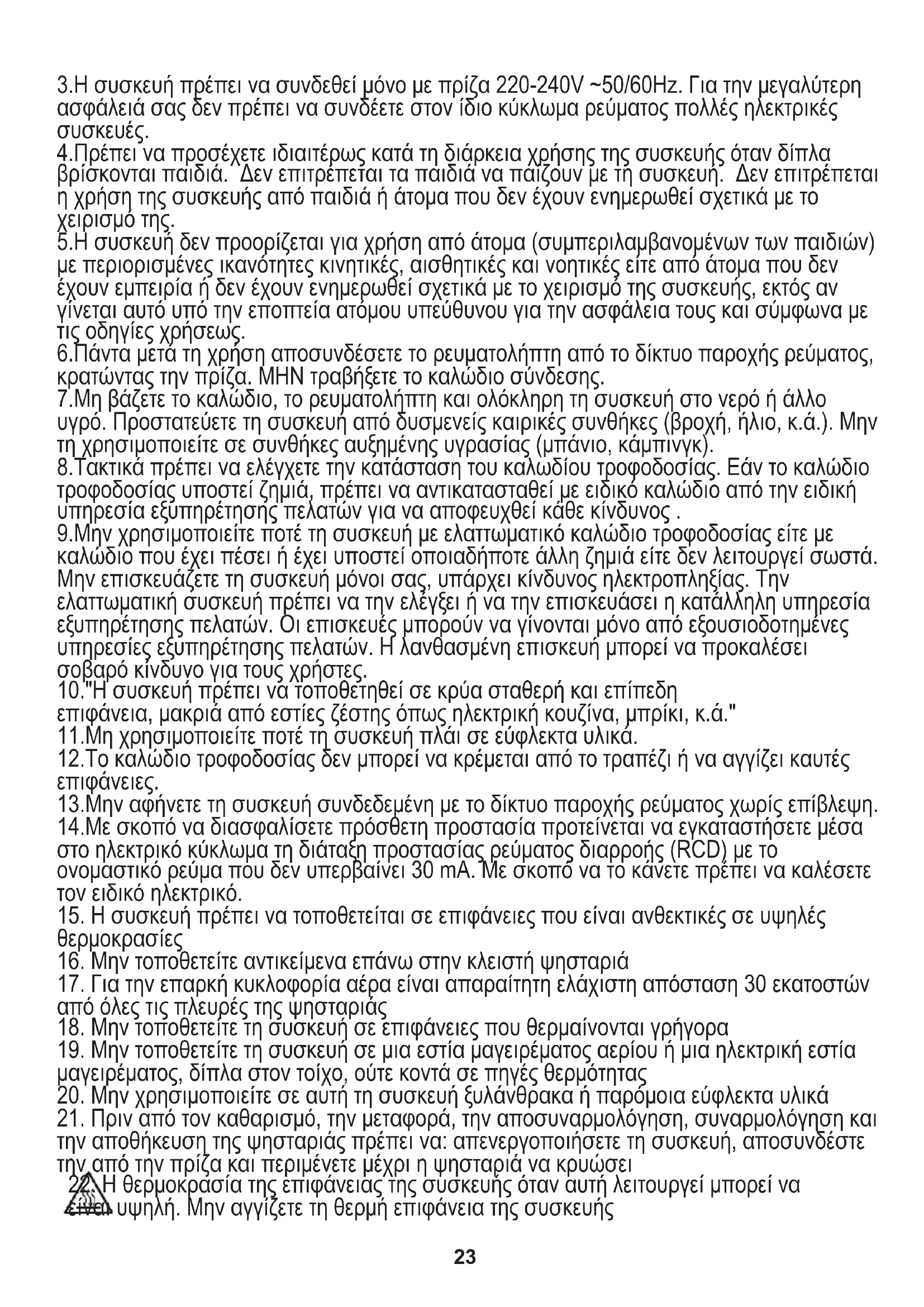 1.Πριν από τη χρήση της συσκευής πρέπει να διαβάσετε τις οδηγίες χρήσεως και να τις ακολουθήσετε. Ο παραγωγός δεν ευθύνεται για ενδεχόμενες ζημιές που οφείλονται σε μη ενδεδειγμένη χρήση ή σε λάθος χειρισμό της συσκευής. 2.Η συσκευή προορίζεται για οικιακή χρήση. Απαγορεύεται η χρήση της για άλλους σκοπούς, για τους οποίους δεν προορίζεται. ΓΕΝΙΚΟΙ ΚΑΝΟΝΕΣ ΑΣΦΑΛΕΙΑΣ23 3.Η συσκευή πρέπει να συνδεθεί μόνο με πρίζα 220-240V ~50/60Hz. Για την μεγαλύτερη ασφάλειά σας δεν πρέπει να συνδέετε στον ίδιο κύκλωμα ρεύματος πολλές ηλεκτρικές