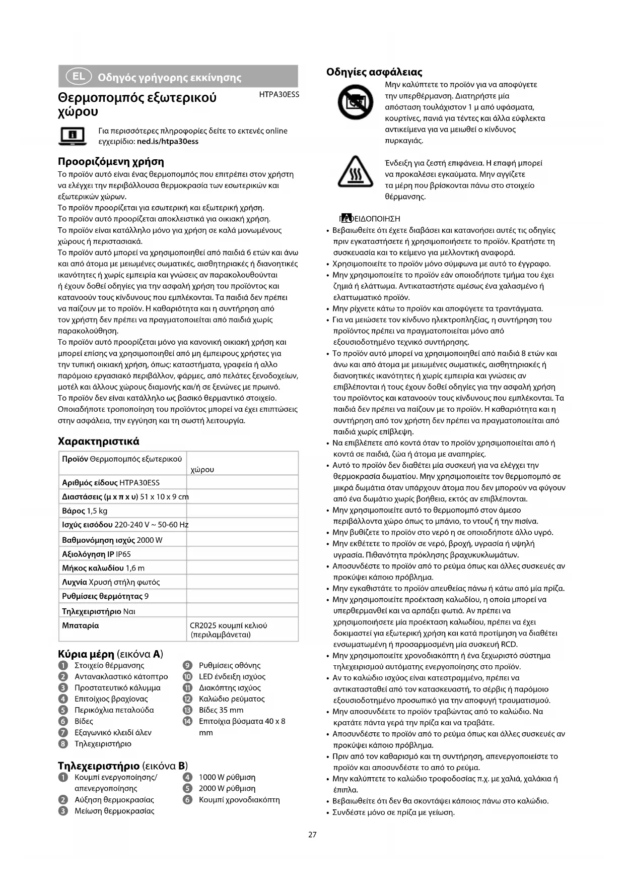 HTPA30ESSΓια περισσότερες πληροφορίες δείτε το εκτενές online εγχειρίδιο: ned.is/htpa30ess Προοριζόμενη χρήση Το προϊόν αυτό είναι ένας θερμοπομπός που επιτρέπει στον χρήστη να ελέγχει την περιβάλλουσα θερμοκρασία των εσωτερικών και εξωτερικών χώρων.Το προϊόν προορίζεται για εσωτερική και εξωτερική χρήση.Το προϊόν αυτό προορίζεται αποκλειστικά για οικιακή χρήση.Το προϊόν είναι κατάλληλο μόνο για χρήση σε καλά μονωμένους χώρους ή περιστασιακά.Το προϊόν αυτό μπορεί να χρησιμοποιηθεί από παιδιά 6 ετών και άνω και από άτομα με μειωμένες σωματικές, αισθητηριακές ή διανοητικές ικανότητες ή χωρίς εμπειρία και γνώσεις αν παρακολουθούνται ή έχουν δοθεί οδηγίες για την ασφαλή χρήση του προϊόντος και κατανοούν τους κίνδυνους που εμπλέκονται. Τα παιδιά δεν πρέπει να παίζουν με το προϊόν. Η καθαριότητα και η συντήρηση από τον χρήστη δεν πρέπει να πραγματοποιείται από παιδιά χωρίς παρακολούθηση.Το προϊόν αυτό προορίζεται μόνο για κανονική οικιακή χρήση και μπορεί επίσης να χρησιμοποιηθεί από μη έμπειρους χρήστες για την τυπική οικιακή χρήση, όπως: καταστήματα, γραφεία ή αλλo παρόμοιο εργασιακό περιβάλλον, φάρμες, από πελάτες ξενοδοχείων, μοτέλ και άλλους χώρους διαμονής και/ή σε ξενώνες με πρωινό.Το προϊόν δεν είναι κατάλληλο ως βασικό θερμαντικό στοιχείο.Οποιαδήποτε τροποποίηση του προϊόντος μπορεί να έχει επιπτώσεις στην ασφάλεια, την εγγύηση και τη σωστή λειτουργία. Χαρακτηριστικά Προϊόν Θερμοπομπός εξωτερικού χώρουΑριθμός είδους HTPA30ESSΔιαστάσεις (μ x π x υ) 51 x 10 x 9 cmΒάρος 1,5 kgΙσχύς εισόδου 220-240 V ~ 50-60 HzΒαθμονόμηση ισχύς 2000 WΑξιολόγηση IP IP65Μήκος καλωδίου 1,6 mΛυχνία Χρυσή στήλη φωτόςΡυθμίσεις θερμότητας 9Τηλεχειριστήριο ΝαιΜπαταρία CR2025 κουμπί κελιού (περιλαμβάνεται) Κύρια μέρη (εικόνα A) 1 Στοιχείο θέρμανσης 2 Αντανακλαστικό κάτοπτρο 3 Προστατευτικό κάλυμμα 4 Επιτοίχιος βραχίονας 5 Περικόχλια πεταλούδα 6 Βίδες 7 Εξαγωνικό κλειδί άλεν 8 Τηλεχειριστήριο 9 Ρυθμίσεις οθόνης q LED ένδειξη ισχύος w Διακόπτης ισχύος e Καλώδιο ρεύματος r Βίδες 35 mm t Επιτοίχια βύσματα 40 x 8