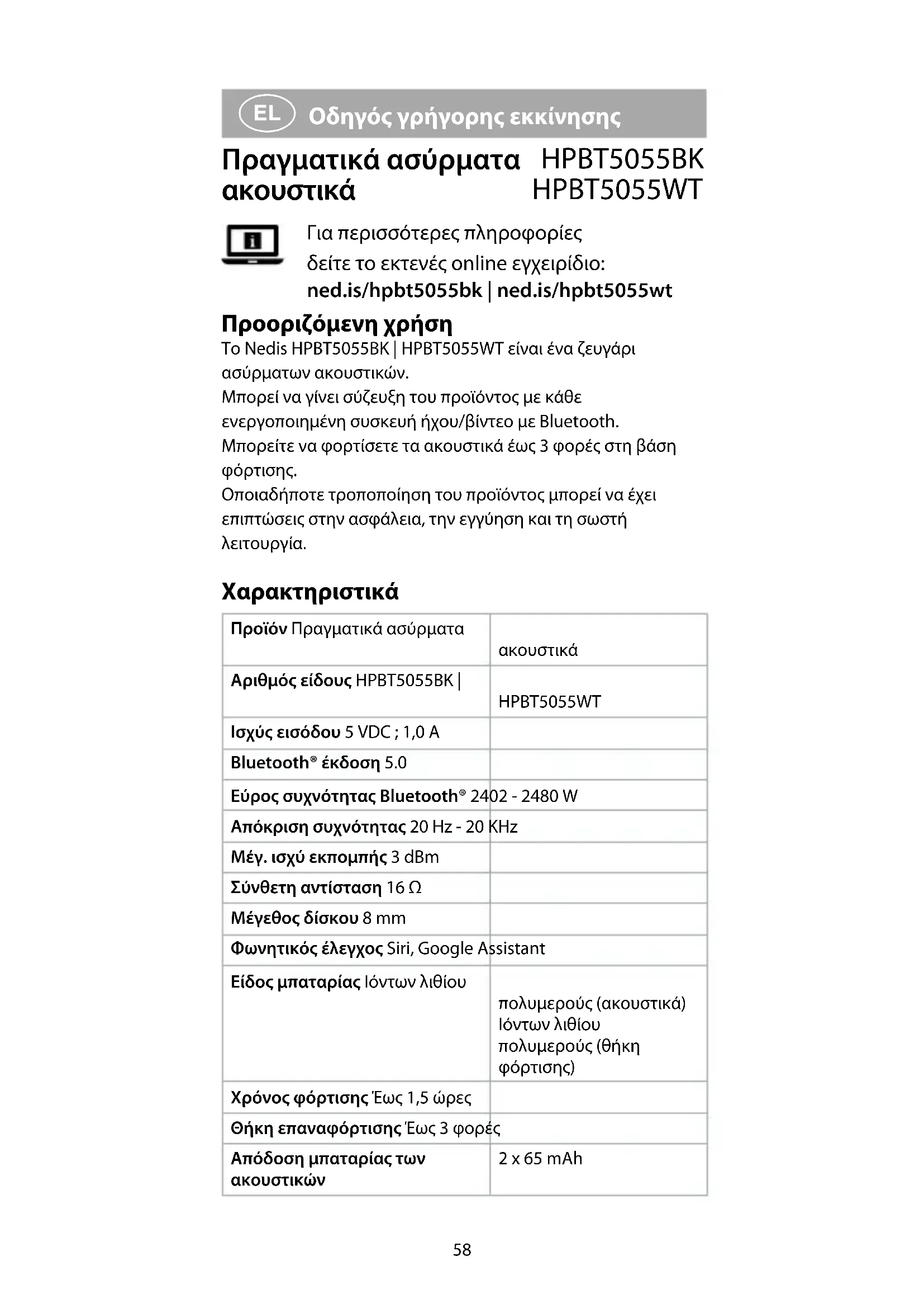 HPBT5055BK HPBT5055WT Για περισσότερες πληροφορίες δείτε το εκτενές online εγχειρίδιο: ned.is/hpbt5055bk | ned.is/hpbt5055wt Προοριζόμενη χρήση Το Nedis HPBT5055BK | HPBT5055WT είναι ένα ζευγάρι ασύρματων ακουστικών. Μπορεί να γίνει σύζευξη του προϊόντος με κάθε ενεργοποιημένη συσκευή ήχου/βίντεο με Bluetooth. Μπορείτε να φορτίσετε τα ακουστικά έως 3 φορές στη βάση