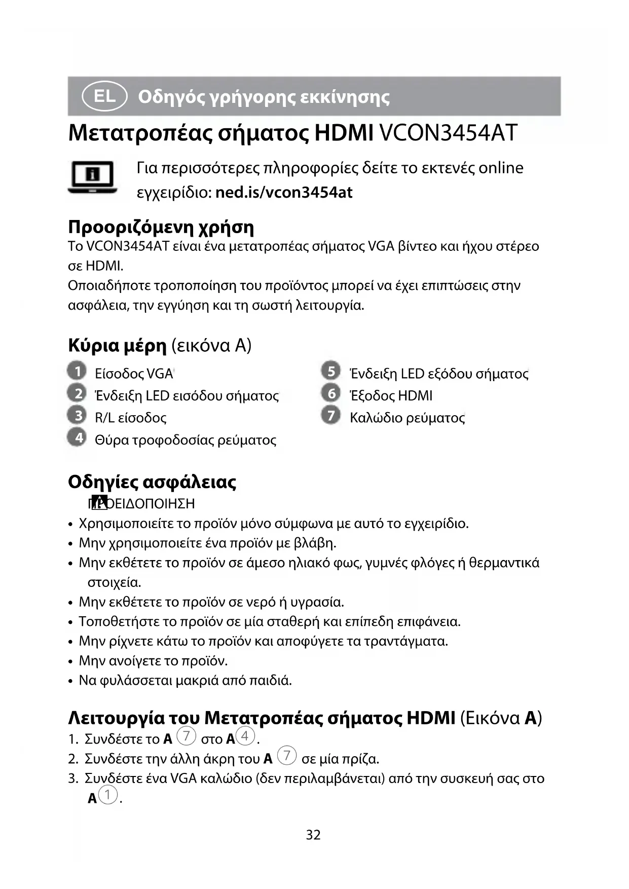 Οδηγός γρήγορης εκκίνησης Μετατροπέας σήματος HDMI VCON3454AT Για περισσότερες πληροφορίες δείτε το εκτενές online εγχειρίδιο: ned.is/vcon3454at Προοριζόμενη χρήση Το VCON3454AT είναι ένα μετατροπέας σήματος VGA βίντεο και ήχου στέρεο σε HDMI.Οποιαδήποτε τροποποίηση του προϊόντος μπορεί να έχει επιπτώσεις στην ασφάλεια, την εγγύηση και τη σωστή λειτουργία. Κύρια μέρη (εικόνα A)