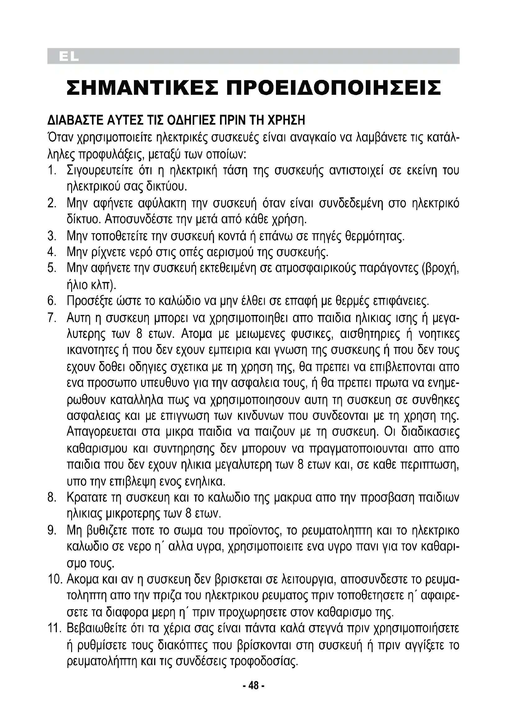 ΣΗΜΑΝΤΙΚΕΣ ΠΡΟΕΙΔΟΠΟΙΗΣΕΙΣ ΔΙΑΒΑΣΤΕ ΑΥΤΕΣ ΤΙΣ ΟΔΗΓΙΕΣ ΠΡΙΝ ΤΗ ΧΡΗΣΗ Όταν χρησιμοποιείτε ηλεκτρικές συσκευές είναι αναγκαίο να λαμβάνετε τις κατάλ- ληλες προφυλάξεις, μεταξύ των οποίων: Σιγουρευτείτε ότι η ηλεκτρική τάση της συσκευής αντιστοιχεί σε εκείνη του 1. ηλεκτρικού σας δικτύου. Μην αφήνετε αφύλακτη την συσκευή όταν είναι συνδεδεμένη στο ηλεκτρικό 2. δίκτυο. Αποσυνδέστε την μετά από κάθε χρήση. Μην τοποθετείτε την συσκευή κοντά ή επάνω σε πηγές θερμότητας.3. Μην ρίχνετε νερό στις οπές αερισμού της συσκευής.4. Μην αφήνετε την συσκευή εκτεθειμένη σε ατμοσφαιρικούς παράγοντες (βροχή, 5.