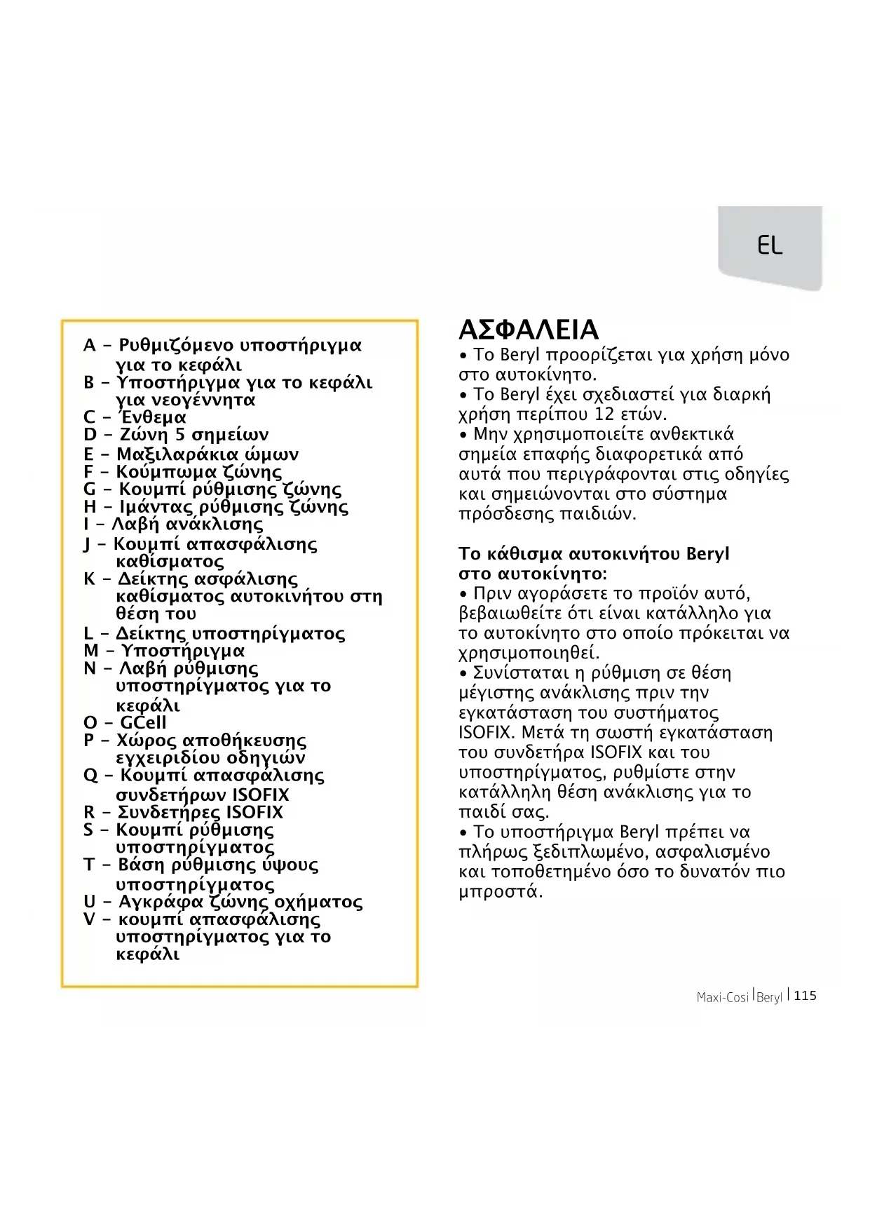 - Η βάση προορίζεται για χρήση μόνο με το κάθισμα αυτοκινήτου Beryl. ΜΗΝ τοποθετήσετε οποιοδήποτε άλλο κάθισμα αυτοκινήτου στη βάση Beryl.