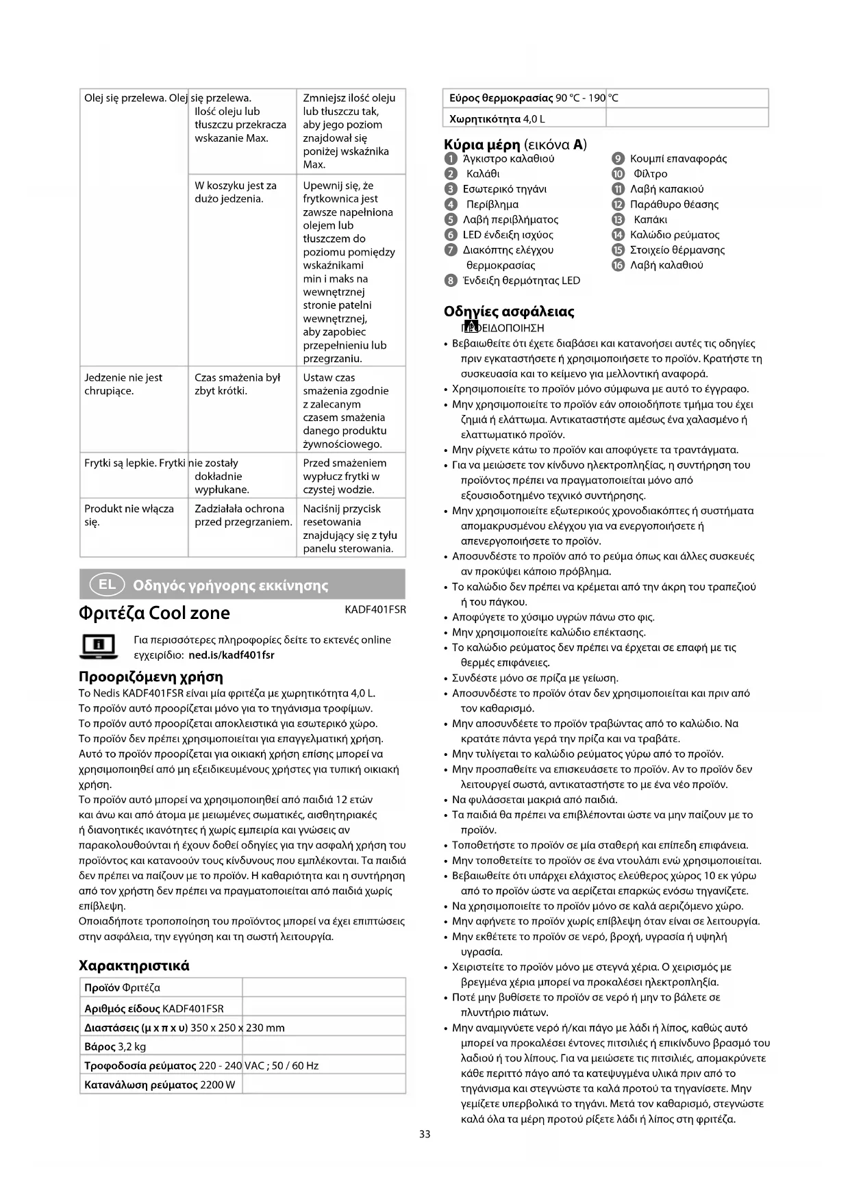 Οδηγός γρήγορης εκκίνησης Φριτέζα Cool zone KADF401FSRΓια περισσότερες πληροφορίες δείτε το εκτενές online εγχειρίδιο: ned.is/kadf401fsr Προοριζόμενη χρήση Το Nedis KADF401FSR είναι μία φριτέζα με χωρητικότητα 4,0 L.Το προϊόν αυτό προορίζεται μόνο για το τηγάνισμα τροφίμων.Το προϊόν αυτό προορίζεται αποκλειστικά για εσωτερικό χώρο.Το προϊόν δεν πρέπει χρησιμοποιείται για επαγγελματική χρήση.Αυτό το προϊόν προορίζεται για οικιακή χρήση επίσης μπορεί να χρησιμοποιηθεί από μη εξειδικευμένους χρήστες για τυπική οικιακή χρήση.Το προϊόν αυτό μπορεί να χρησιμοποιηθεί από παιδιά 12 ετών και άνω και από άτομα με μειωμένες σωματικές, αισθητηριακές ή διανοητικές ικανότητες ή χωρίς εμπειρία και γνώσεις αν παρακολουθούνται ή έχουν δοθεί οδηγίες για την ασφαλή χρήση του προϊόντος και κατανοούν τους κίνδυνους που εμπλέκονται. Τα παιδιά δεν πρέπει να παίζουν με το προϊόν. Η καθαριότητα και η συντήρηση από τον χρήστη δεν πρέπει να πραγματοποιείται από παιδιά χωρίς επίβλεψη.Οποιαδήποτε τροποποίηση του προϊόντος μπορεί να έχει επιπτώσεις στην ασφάλεια, την εγγύηση και τη σωστή λειτουργία. Χαρακτηριστικά Προϊόν ΦριτέζαΑριθμός είδους KADF401FSRΔιαστάσεις (μ x π x υ) 350 x 250 x 230 mmΒάρος 3,2 kgΤροφοδοσία ρεύματος 220 - 240 VAC ; 50 / 60 HzΚατανάλωση ρεύματος 2200 W34 Γέμισμα λαδιού στο εσωτερικό τηγάνι