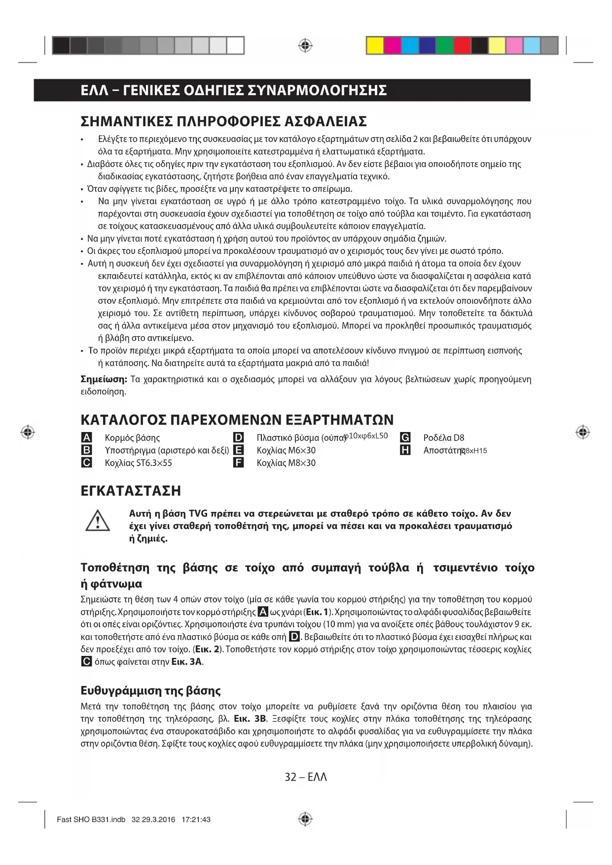 Σημειώστε τη θέση των 4 οπών στον τοίχο (μία σε κάθε γωνία του κορμού στήριξης) για την τοποθέτηση του κορμού στήριξης. Χρησιμοποιήστε τον κορμό στήριξης Aως χνάρι (Εικ. 1). Χρησιμοποιώντας το αλφάδι φυσαλίδας βεβαιωθείτε ότι οι οπές είναι οριζόντιες. Χρησιμοποιήστε ένα τρυπάνι τοίχου (10 mm) για να ανοίξετε οπές βάθους τουλάχιστον 9 εκ. και τοποθετήστε από ένα πλαστικό βύσμα σε κάθε οπή D. Βεβαιωθείτε ότι το πλαστικό βύσμα έχει εισαχθεί πλήρως και δεν προεξέχει από τον τοίχο. (Εικ. 2). Τοποθετήστε τον κορμό στήριξης στον τοίχο χρησιμοποιώντας τέσσερις κοχλίες Cόπως φαίνεται στην Εικ. 3Α. Ευθυγράμμιση της βάσης Μετά την τοποθέτηση της βάσης στον τοίχο μπορείτε να ρυθμίσετε ξανά την οριζόντια θέση του πλαισίου για την τοποθέτηση της τηλεόρασης, βλ. Εικ. 3Β. Ξεσφίξτε τους κοχλίες στην πλάκα τοποθέτησης της τηλεόρασης χρησιμοποιώντας ένα σταυροκατσάβιδο και χρησιμοποιήστε το αλφάδι φυσαλίδας για να ευθυγραμμίσετε την πλάκα στην οριζόντια θέση. Σφίξτε τους κοχλίες αφού ευθυγραμμίσετε την πλάκα (μην χρησιμοποιήσετε υπερβολική δύναμη). ΕΛΛ – ΓΕΝΙΚΕΣ ΟΔΗΓΙΕΣ ΣΥΝΑΡΜΟΛΟΓΗΣΗΣ Fast SHO B331.indb 32 29.3.2016 17:21:43 φ10xφ6xL50 D8xH1533 – EΛΛ Σημείωση: Αν ητηλεόραση δεν είναι πλήρως οριζόντια μετά την εγκατάσταση, αφαιρέστε την από τη βάση (εκτελέστε τα σημεία στην εικόνα 5 με αντίστροφη σειρά), επαναλάβετε τη διαδικασία της ευθυγράμμισης και στη συνέχεια τοποθετήστε ξανά την τηλεόραση. Τοποθέτηση των υποστηριγμάτων στην τηλεόραση Τηλεόραση με επίπεδη πλάτη (Εικ. 4Α) Πρώτα, βρείτε τους κοχλίες που είναι κατάλληλοι για την τοποθέτηση της τηλεόρασης (E/F): προσπαθήστε να τους βιδώσετε με το χέρι στις οπές στο πίσω μέρος της τηλεόρασης. Αν αισθανθείτε αντίσταση σταματήστε αμέσως το βίδωμα! Όταν βρείτε τον κοχλία με το σωστό σπείρωμα, συνεχίστε σύμφωνα με το σχέδιο 4A. Τοποθετήστε τη ροδέλα που ταιριάζει στον κοχλία (G) και στη συνέχεια βιδώστε τον στο υποστήριγμα Bκαι τέλος στην τηλεόραση. Ελέγξτε αν τα υποστηρίγματα είναι στερεωμένα κάθετα και είναι παράλληλα. Τηλεόραση με καμπύλη πλάτη (Εικ. 4Β) Πρώτα, βρείτε τους κοχλίες που είναι κατάλληλοι για την τοποθέτηση της τηλεόρασης (E/F): προσπαθήστε να τους βιδώσετε με το χέρι στις οπές στο πίσω μέρος της τηλεόρασης. Αν αισθανθείτε αντίσταση σταματήστε αμέσως το βίδωμα! Όταν βρείτε τον κοχλία με το σωστό σπείρωμα, συνεχίστε σύμφωνα με το σχέδιο 4B. Τοποθετήστε τη ροδέλα που ταιριάζει στον κοχλία (G), τον αποστάτη (H) και στη συνέχεια βιδώστε τον κοχλία στο υποστήριγμα Bκαι τέλος στην τηλεόραση. Ελέγξτε αν τα υποστηρίγματα είναι στερεωμένα κάθετα και είναι παράλληλα. Τοποθέτηση της τηλεόρασης στη βάση στήριξης Προειδοποίηση: Οχειρισμός ορισμένων τηλεοράσεων απαιτεί βοήθεια και από άλλα άτομα. Οκατασκευαστής δεν φέρει ευθύνη για τραυματισμούς ήζημιές σε περιουσιακά στοιχεία που προκαλούνται από ακατάλληλο χειρισμό! Πρώτα, αγκυρώστε τα υποστηρίγματα που είναι προσαρτημένα στην τηλεόραση στο πάνω άκρο του κορμού στήριξης. Στη συνέχεια αγκυρώστε το κάτω μέρος του υποστηρίγματος στο κάτω άκρο του κορμού στήριξης και σφίξτε τον κοχλία ασφάλισης στο κάτω μέρος του υποστηρίγματος (Εικ. 5). Ορίστε την απαιτούμενη κλίση της οθόνης χαλαρώνοντας τους κοχλίες στο πλαϊνό κάθε υποστηρίγματος, γέρνοντάς την και επανασφίγγοντας τους κοχλίες, βλ. εικ. 6. Συγχαρητήρια, ηεγκατάσταση έχει ολοκληρωθεί. Σας ευχόμαστε να έχετε μια ευχάριστη εμπειρία παρακο