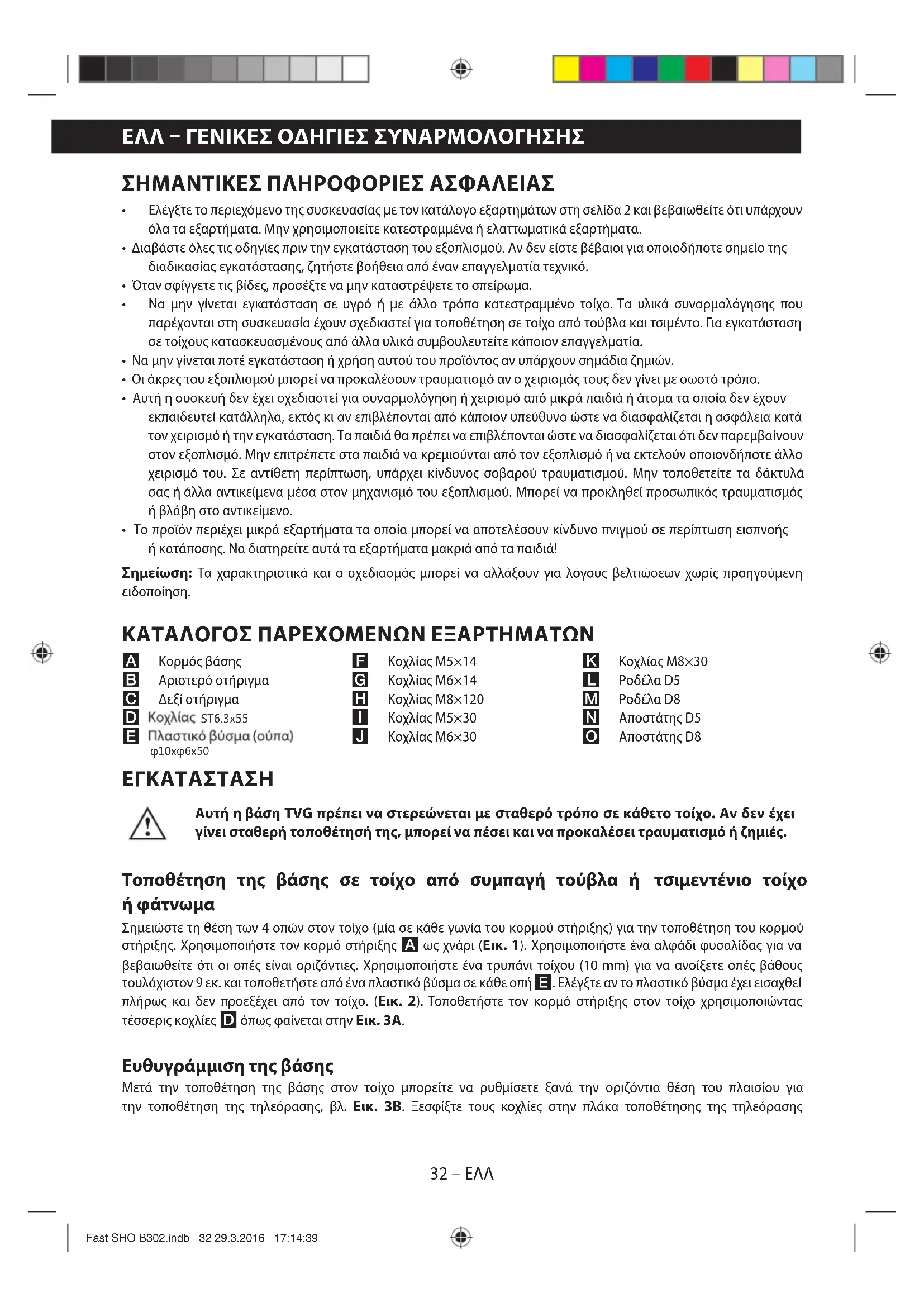 Σημειώστε τη θέση των 4 οπών στον τοίχο (μία σε κάθε γωνία του κορμού στήριξης) για την τοποθέτηση του κορμού στήριξης. Χρησιμοποιήστε τον κορμό στήριξης Aως χνάρι (Εικ. 1). Χρησιμοποιήστε ένα αλφάδι φυσαλίδας για να βεβαιωθείτε ότι οι οπές είναι οριζόντιες. Χρησιμοποιήστε ένα τρυπάνι τοίχου (10 mm) για να ανοίξετε οπές βάθους τουλάχιστον 9 εκ. και τοποθετήστε από ένα πλαστικό βύσμα σε κάθε οπή E. Ελέγξτε αν το πλαστικό βύσμα έχει εισαχθεί πλήρως και δεν προεξέχει από τον τοίχο. (Εικ. 2). Τοποθετήστε τον κορμό στήριξης στον τοίχο χρησιμοποιώντας τέσσερις κοχλίες Dόπως φαίνεται στην Εικ. 3Α. Ευθυγράμμιση της βάσης Μετά την τοποθέτηση της βάσης στον τοίχο μπορείτε να ρυθμίσετε ξανά την οριζόντια θέση του πλαισίου για την τοποθέτηση της τηλεόρασης, βλ. Εικ. 3Β. Ξεσφίξτε τους κοχλίες στην πλάκα τοποθέτησης της τηλεόρασης ΕΛΛ – ΓΕΝΙΚΕΣ ΟΔΗΓΙΕΣ ΣΥΝΑΡΜΟΛΟΓΗΣΗΣ Fast SHO B302.indb 32 29.3.2016 17:14:39 φ10xφ6x50 ST6.3x5533 – EΛΛ χρησιμοποιώντας ένα σταυροκατσάβιδο και χρησιμοποιήστε ένα αλφάδι φυσαλίδας για να ευθυγραμμίσετε την πλάκα στην οριζόντια θέση. Σφίξτε τους κοχλίες αφού ευθυγραμμίσετε την πλάκα (μην χρησιμοποιήσετε υπερβολική δύναμη). Σημείωση: Αν ητηλεόραση δεν είναι πλήρως οριζόντια μετά την εγκατάσταση στη βάση, αφαιρέστε την από τη βάση (εκτελέστε τα σημεία στις εικόνες 5 και 6 με αντίστροφη σειρά), επαναλάβετε τη διαδικασία της ευθυγράμμισης και στη συνέχεια τοποθετήστε ξανά την τηλεόραση. Τοποθέτηση των υποστηριγμάτων στην τηλεόραση Τηλεόραση με επίπεδη πλάτη (Εικ. 4Α) Πρώτα, βρείτε τους κοχλίες που είναι κατάλληλοι για την τοποθέτηση της τηλεόρασης (F/G/H/I/J/K): προσπαθήστε να τους βιδώσετε με το χέρι στις οπές στο πίσω μέρος της τηλεόρασης. Αν αισθανθείτε αντίσταση σταματήστε αμέσως το βίδωμα! Όταν βρείτε τον κοχλία με το σωστό σπείρωμα, συνεχίστε σύμφωνα με το σχέδιο 4A. Τοποθετήστε τη ροδέλα που ταιριάζει στον κοχλία (L/M) και στη συνέχεια βιδώστε τον στο υποστήριγμα B/C και τέλος στην τηλεόραση. Ελέγξτε αν τα υποστηρίγματα είναι στερεωμένα κάθετα και είναι παράλληλα. Τηλεόραση με καμπύλη πλάτη (Εικ. 4Β) Πρώτα, βρείτε τους κοχλίες που είναι κατάλληλοι για την τοποθέτηση της τηλεόρασης (F/G/H/I/J/K): προσπαθήστε να τους βιδώσετε με το χέρι στις οπές στο πίσω μέρος της τηλεόρασης. Αν αισθανθείτε αντίσταση σταματήστε αμέσως το βίδωμα! Όταν βρείτε τον κοχλία με το σωστό σπείρωμα, συνεχίστε σύμφωνα με το σχέδιο 4B. Τοποθετήστε τη ροδέλα που ταιριάζει στον κοχλία (L/M), ροδέλα αποστάτη (N/O) και στη συνέχεια βιδώστε τον στο υποστήριγμα B/C και τέλος στην τηλεόραση. Ελέγξτε αν τα υποστηρίγματα είναι στερεωμένα κάθετα και είναι παράλληλα. Τοποθέτηση της τηλεόρασης στη βάση στήριξης Προειδοποίηση: Οχειρισμός ορισμένων τηλεοράσεων απαιτεί βοήθεια και από άλλα άτομα. Οκατασκευαστής δεν φέρει ευθύνη για τραυματισμούς ήζημιές σε περιουσιακά στοιχεία που προκαλούνται από ακατάλληλο χειρισμό! Πρώτα, αγκυρώστε τα υποστηρίγματα που είναι προσαρτημένα στην τηλεόραση στο πάνω άκρο του κορμού στήριξης (Εικ. 5). Τραβήξτε και τις δύο άκρες των σχοινιών στα υποστηρίγματα και στερεώστε τα στο κάτω μέρος της βάσης (Εικ.6). Στη συνέχεια αφήστε τα σχοινιά. Συγχαρητήρια, ηεγκατάσταση έχει ολοκληρωθεί. Σας ευχόμαστε να έχετε μια ευχάριστη εμπειρία παρακολουθώντας την τηλεόραση που τοποθετήσατε στη βάση του τοίχου. ΟΔΗΓΙΕΣ ΚΑΙ ΠΛΗΡΟΦΟΡΙΕΣ ΣΧΕΤΙΚΑ ΜΕ ΤΗΝ ΑΠΟΡΡΙΨΗ ΤΗΣ ΧΡΗΣΙΜΟΠΟΙΗΜΕΝΗΣ ΣΥΣΚΕΥΑΣΙΑΣ Μετ