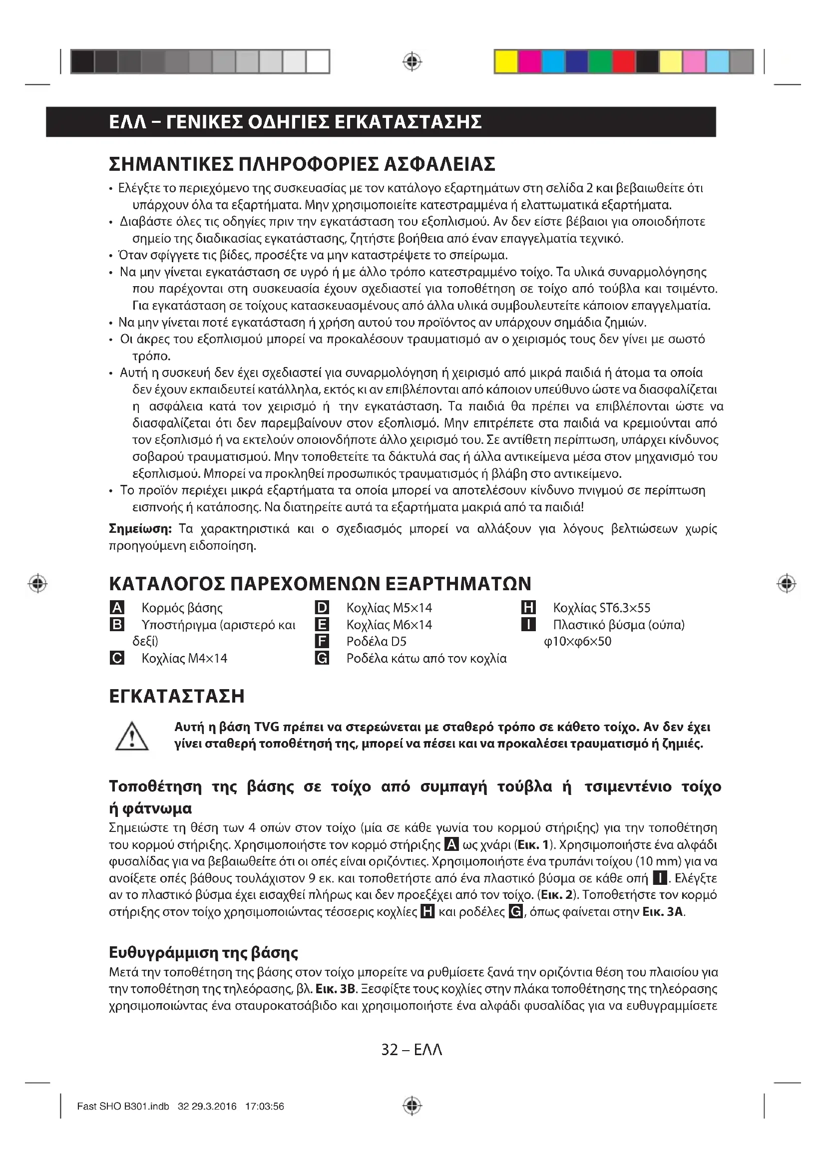 Σημειώστε τη θέση των 4 οπών στον τοίχο (μία σε κάθε γωνία του κορμού στήριξης) για την τοποθέτηση του κορμού στήριξης. Χρησιμοποιήστε τον κορμό στήριξης Aως χνάρι (Εικ. 1). Χρησιμοποιήστε ένα αλφάδι φυσαλίδας για να βεβαιωθείτε ότι οι οπές είναι οριζόντιες. Χρησιμοποιήστε ένα τρυπάνι τοίχου (10 mm) για να ανοίξετε οπές βάθους τουλάχιστον 9 εκ. και τοποθετήστε από ένα πλαστικό βύσμα σε κάθε οπή I. Ελέγξτε αν το πλαστικό βύσμα έχει εισαχθεί πλήρως και δεν προεξέχει από τον τοίχο. (Εικ. 2). Τοποθετήστε τον κορμό στήριξης στον τοίχο χρησιμοποιώντας τέσσερις κοχλίες Hκαι ροδέλες G, όπως φαίνεται στην Εικ. 3Α. Ευθυγράμμιση της βάσης Μετά την τοποθέτηση της βάσης στον τοίχο μπορείτε να ρυθμίσετε ξανά την οριζόντια θέση του πλαισίου για την τοποθέτηση της τηλεόρασης, βλ. Εικ. 3Β. Ξεσφίξτε τους κοχλίες στην πλάκα τοποθέτησης της τηλεόρασης χρησιμοποιώντας ένα σταυροκατσάβιδο και χρησιμοποιήστε ένα αλφάδι φυσαλίδας για να ευθυγραμμίσετε EΛΛ – ΓΕΝΙΚΕΣ ΟΔΗΓΙΕΣ ΕΓΚΑΤΑΣΤΑΣΗΣ Fast SHO B301.indb 32 29.3.2016 17:03:5633 – EΛΛ την πλάκα στην οριζόντια θέση. Σφίξτε τους κοχλίες αφού ευθυγραμμίσετε την πλάκα (μην χρησιμοποιήσετε υπερβολική δύναμη). Σημείωση: Αν ητηλεόραση δεν είναι πλήρως οριζόντια μετά την εγκατάσταση στη βάση, αφαιρέστε την από τη βάση (εκτελέστε τα σημεία στις εικόνες 5 και 6 με αντίστροφη σειρά), επαναλάβετε τη διαδικασία της ευθυγράμμισης και στη συνέχεια τοποθετήστε ξανά την τηλεόραση. Τοποθέτηση των υποστηριγμάτων στην τηλεόραση Τηλεόραση με επίπεδη πλάτη (Εικ. 4) Πρώτα, βρείτε τους κοχλίες που είναι κατάλληλοι για την τοποθέτηση της τηλεόρασης (C/D/E): προσπαθήστε να τους βιδώσετε με το χέρι στις οπές στο πίσω μέρος της τηλεόρασης. Αν αισθανθείτε αντίσταση σταματήστε αμέσως το βίδωμα! Όταν βρείτε έναν κοχλία με το σωστό σπείρωμα, συνεχίστε σύμφωνα με το σχέδιο 4. Αν χρησιμοποιήσετε τον κοχλία Cή D, τοποθετήστε σε αυτόν την αντίστοιχη ροδέλα (F) και στη συνέχεια βιδώστε τον κοχλία στο υποστήριγμα Bκαι τέλος στην τηλεόραση. Ελέγξτε αν τα υποστηρίγματα είναι στερεωμένα κάθετα και είναι παράλληλα. Τοποθέτηση της τηλεόρασης στο στήριγμα και ασφάλιση με μπουλόνια ασφαλείας Προειδοποίηση: Οχειρισμός ορισμένων τηλεοράσεων απαιτεί βοήθεια και από άλλα άτομα. Οκατασκευαστής δεν φέρει ευθύνη για τραυματισμούς ήζημιές σε περιουσιακά στοιχεία που προκαλούνται από ακατάλληλο