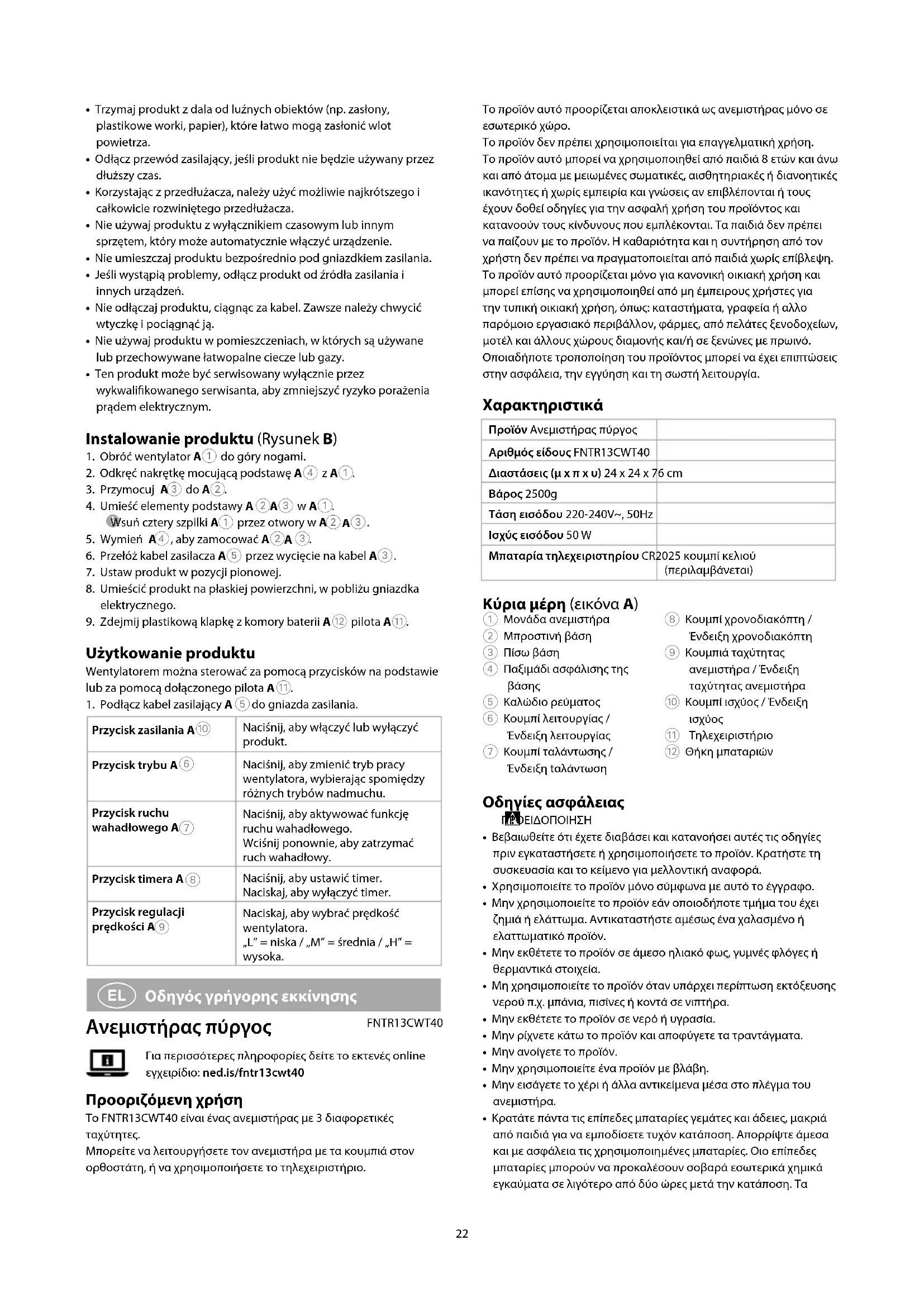 OSTRZEŻENIE• Przed zainstalowaniem lub użyciem produktu należy upewnić się, że instrukcje zawarte w niniejszym dokumencie zostały w pełni przeczytane i zrozumiane. Opakowanie oraz niniejszy dokument należy zachować na przyszłość.• Produktu należy używać wyłącznie w sposób opisany w niniejszym dokumencie.• Nie używaj produktu, jeśli jakakolwiek jego część jest zniszczona lub uszkodzona. Natychmiast wymień uszkodzony lub wadliwy produkt.22 Το προϊόν αυτό προορίζεται αποκλειστικά ως ανεμιστήρας μόνο σε εσωτερικό χώρο.Το προϊόν δεν πρέπει χρησιμοποιείται για επαγγελματική χρήση.Το προϊόν αυτό μπορεί να χρησιμοποιηθεί από παιδιά 8 ετών και άνω και από άτομα με μειωμένες σωματικές, αισθητηριακές ή διανοητικές ικανότητες ή χωρίς εμπειρία και γνώσεις αν επιβλέπονται ή τους έχουν δοθεί οδηγίες για την ασφαλή χρήση του προϊόντος και κατανοούν τους κίνδυνους που εμπλέκονται. Τα παιδιά δεν πρέπει να παίζουν με το προϊόν. Η καθαριότητα και η συντήρηση από τον χρήστη δεν πρέπει να πραγματοποιείται από παιδιά χωρίς επίβλεψη.Το προϊόν αυτό προορίζεται μόνο για κανονική οικιακή χρήση και μπορεί επίσης να χρησιμοποιηθεί από μη έμπειρους χρήστες για την τυπική οικιακή χρήση, όπως: καταστήματα, γραφεία ή αλλo παρόμοιο εργασιακό περιβάλλον, φάρμες, από πελάτες ξενοδοχείων, μοτέλ και άλλους χώρους διαμονής και/ή σε ξενώνες με πρωινό.Οποιαδήποτε τροποποίηση του προϊόντος μπορεί να έχει επιπτώσεις στην ασφάλεια, την εγγύηση και τη σωστή λειτουργία. Χαρακτηριστικά Προϊόν Ανεμιστήρας πύργοςΑριθμός είδους FNTR13CWT40Διαστάσεις (μ x π x υ) 24 x 24 x 76 cmΒάρος 2500gΤάση εισόδου 220-240V~, 50HzΙσχύς εισόδου 50 WΜπαταρία τηλεχειριστηρίου CR2025 κουμπί κελιού (περιλαμβάνεται) Κύρια μέρη (εικόνα A) 1 Μονάδα ανεμιστήρα2 Μπροστινή βάση3 Πίσω βάση4 Παξιμάδι ασφάλισης της βάσης5 Καλώδιο ρεύματος6 Κουμπί λειτουργίας / Ένδειξη λειτουργίας7 Κουμπί ταλάντωσης / Ένδειξη tαλάντωση8 Κουμπί χρονοδιακόπτη / Ένδειξη χρονοδιακόπτη9 Κουμπιά ταχύτητας ανεμιστήρα / Ένδειξη ταχύτητας ανεμιστήραq Κουμπί ισχύος / Ένδειξη ισχύοςw Τηλεχειριστήριοe Θήκη μπαταριών Οδηγίες ασφάλειας