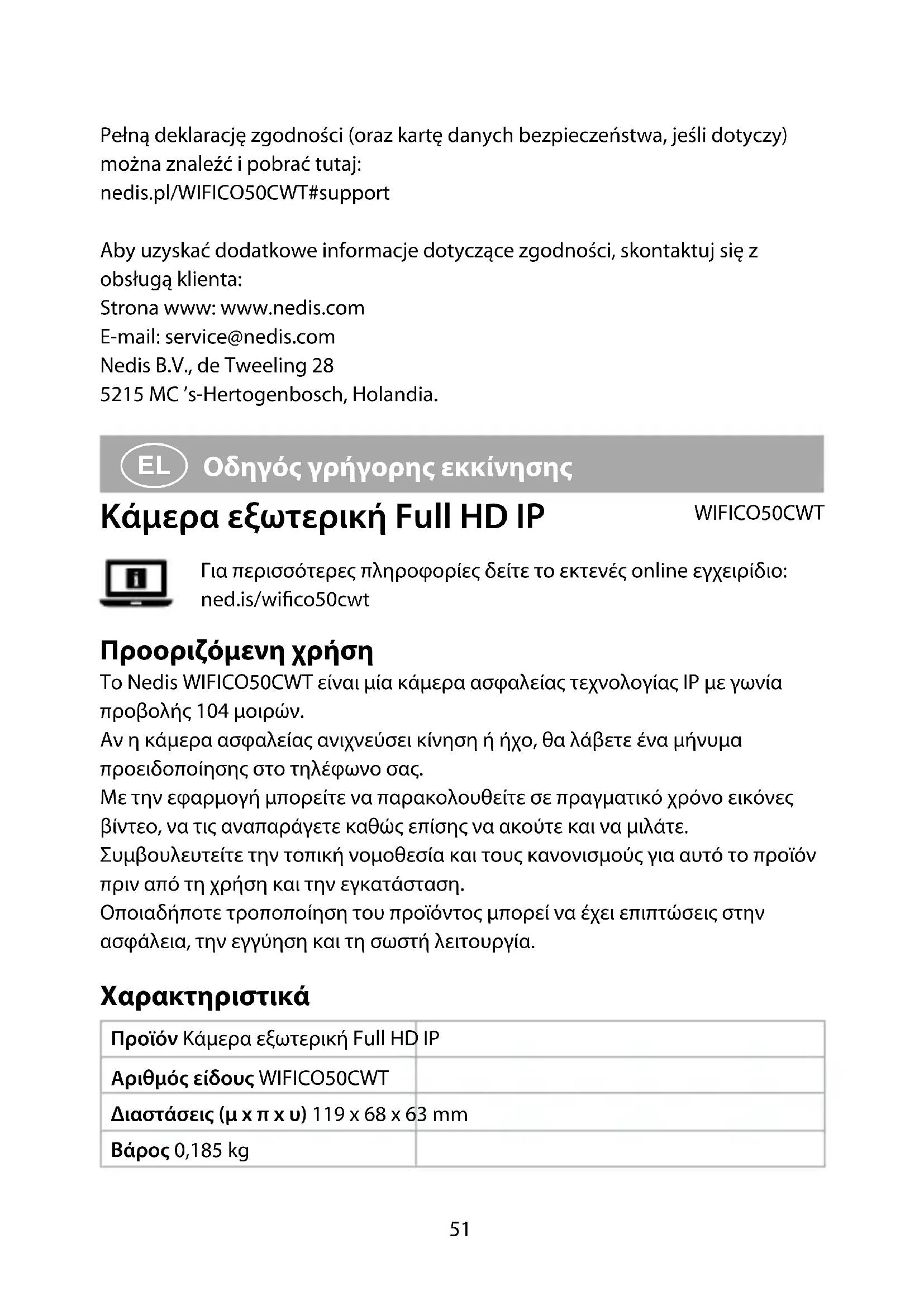 Οδηγός γρήγορης εκκίνησης Κάμερα εξωτερική Full HD IP WIFICO50CWT Για περισσότερες πληροφορίες δείτε το εκτενές online εγχειρίδιο: ned.is/wico50cwt Προοριζόμενη χρήση Το Nedis WIFICO50CWT είναι μία κάμερα ασφαλείας τεχνολογίας IP με γωνία προβολής 104 μοιρών. Αν η κάμερα ασφαλείας ανιχνεύσει κίνηση ή ήχο, θα λάβετε ένα μήνυμα προειδοποίησης στο τηλέφωνο σας. Με την εφαρμογή μπορείτε να παρακολουθείτε σε πραγματικό χρόνο εικόνες βίντεο, να τις αναπαράγετε καθώς επίσης να ακούτε και να μιλάτε. Συμβουλευτείτε την τοπική νομοθεσία και τους κανονισμούς για αυτό το προϊόν πριν από τη χρήση και την εγκατάσταση. Οποιαδήποτε τροποποίηση του προϊόντος μπορεί να έχει επιπτώσεις στην ασφάλεια, την εγγύηση και τη σωστή λειτουργία. Χαρακτηριστικά Προϊόν Κάμερα εξωτερική Full HD IP Αριθμός είδους WIFICO50CWT Διαστάσεις (μ x π x υ) 119 x 68 x 63 mm Βάρος 0,185 kg52 Θερμοκρασία περιβάλλοντος -20 °C – 50 °C Υγρασία λειτουργίας 10 - 95 % Ισχύς εισόδου 5 VDC ; 1 A Ασύρματη σύνδεση 2.4G Wi-Fi, AP Μνήμη Κάρτα SD (8 - 128 GB) (δεν περιλαμβάνεται) Ανάλυση 1920 x 1080p Ταχύτητα καρέ 20 fps Γωνία προβολής 104 μοίρες Μέγ. ισχύ εκπομπής 20 dBm Κεραία με απολαβή 2 dBi Εύρος συχνότητας 2412 - 2472 MHz Αδιάβροχη IP65 Κύρια μέρη (εικόνα A) 1 Μικρόφωνο 2 Φακός κάμερας 3 LED ένδειξη 4 Βίδες 5 Κάλυμμα κάρτας microSD 6 Ηχείο 7 Κουμπί επαναφοράς 8 Υποδοχή κάρτας Micro SD 9 Ισχύς εισόδου q Θύρα ethernet w Φορτιστής Οδηγίες ασφάλειας