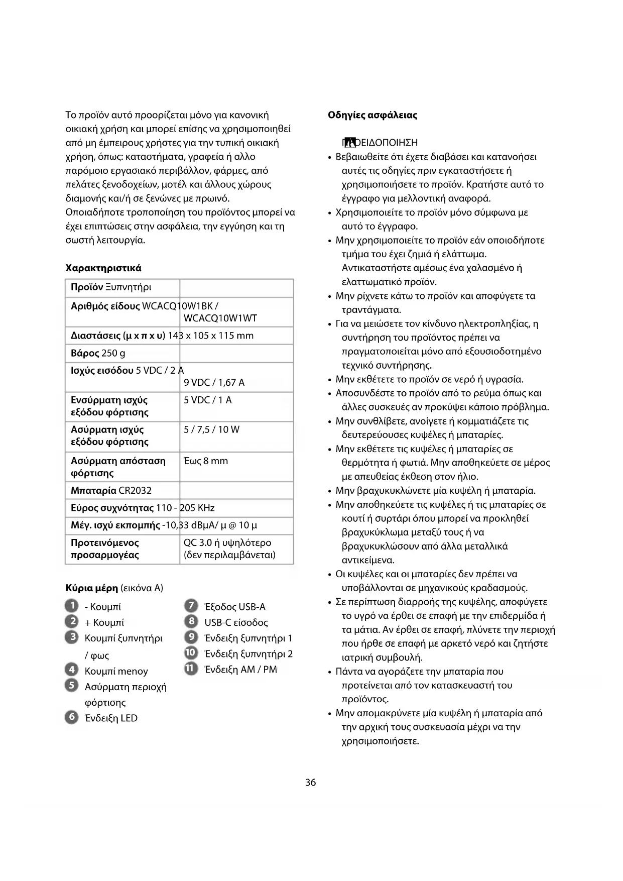 Έως 8 mm Μπαταρία CR2032 Εύρος συχνότητας 110 - 205 KHz Μέγ. ισχύ εκπομπής -10,33 dBµA/ µ @ 10 µ Προτεινόμενος προσαρμογέας QC 3.0 ή υψηλότερο (δεν περιλαμβάνεται) Κύρια μέρη (εικόνα A)