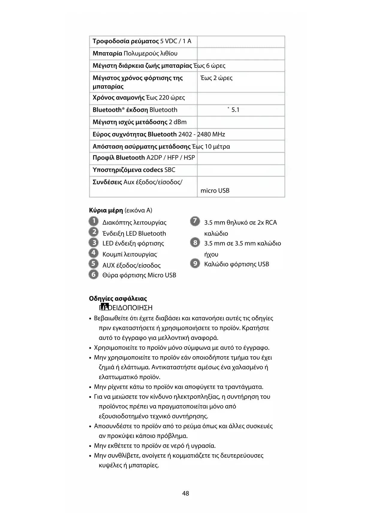 Μέγιστη ισχύς μετάδοσης 2 dBm Εύρος συχνότητας Bluetooth 2402 - 2480 MHz Απόσταση ασύρματης μετάδοσης Έως 10 μέτρα Προφίλ Bluetooth A2DP / HFP / HSP Υποστηριζόμενα codecs SBC Συνδέσεις Aux έξοδος/είσοδος/ micro USB Κύρια μέρη (εικόνα A)