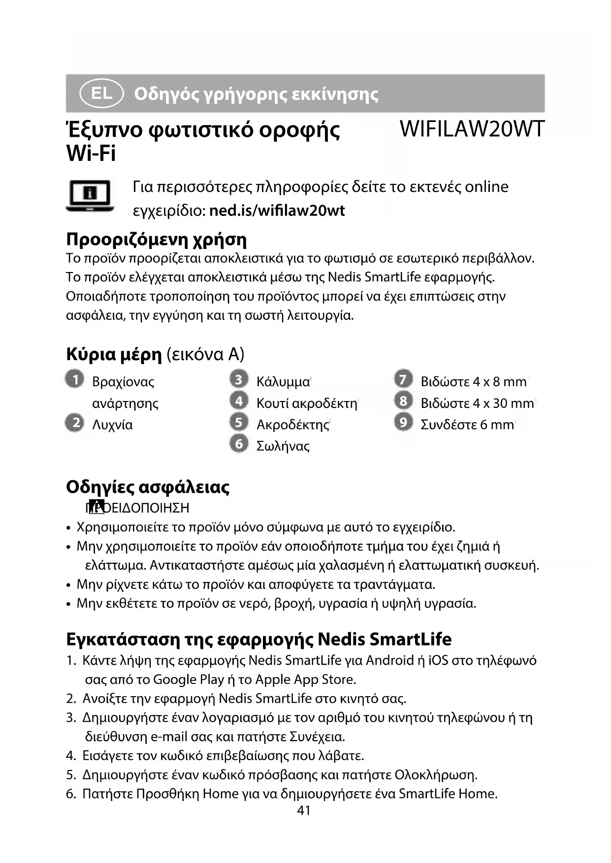 Οδηγός γρήγορης εκκίνησης Έξυπνο φωτιστικό οροφής Wi-Fi WIFILAW20WT Για περισσότερες πληροφορίες δείτε το εκτενές online εγχειρίδιο: ned.is/wilaw20wt Προοριζόμενη χρήση Το προϊόν προορίζεται αποκλειστικά για το φωτισμό σε εσωτερικό περιβάλλον.Το προϊόν ελέγχεται αποκλειστικά μέσω της Nedis SmartLife εφαρμογής.Οποιαδήποτε τροποποίηση του προϊόντος μπορεί να έχει επιπτώσεις στην ασφάλεια, την εγγύηση και τη σωστή λειτουργία. Κύρια μέρη (εικόνα A)