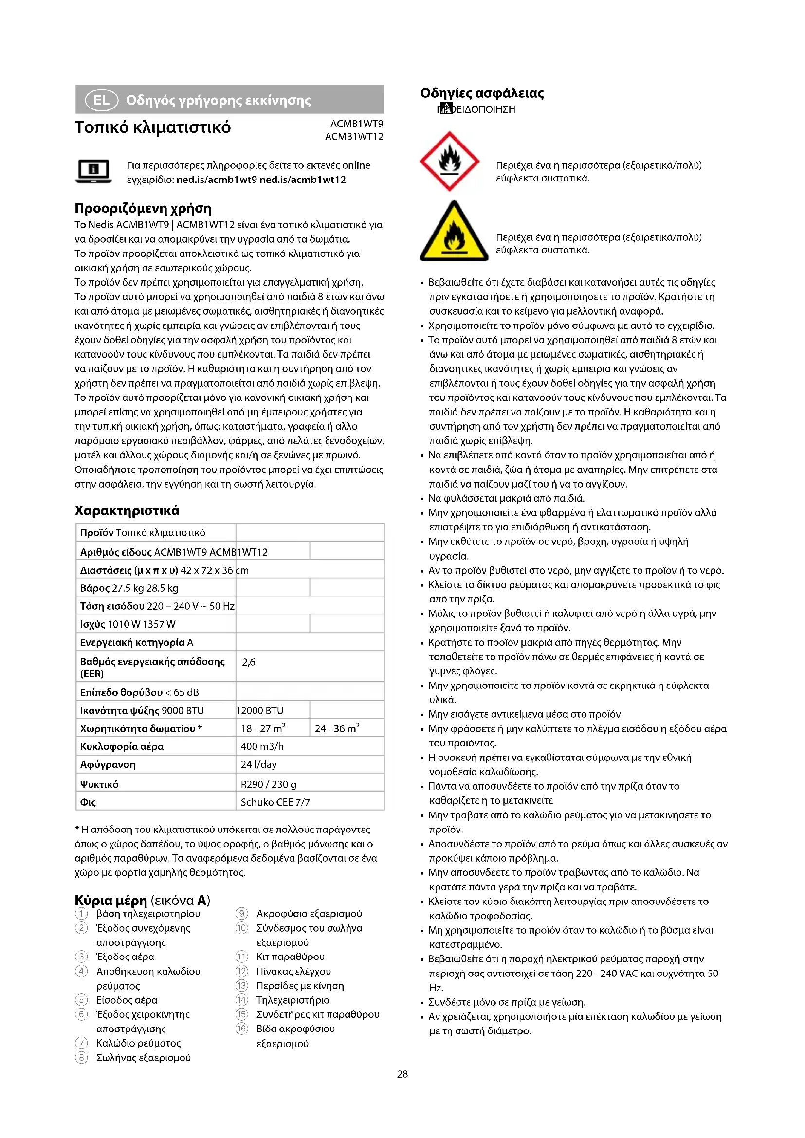 Οδηγός γρήγορης εκκίνησης Τοπικό κλιματιστικό ACMB1WT9 ACMB1WT12Για περισσότερες πληροφορίες δείτε το εκτενές online εγχειρίδιο: ned.is/acmb1wt9 ned.is/acmb1wt12 Προοριζόμενη χρήση Το Nedis ACMB1WT9 | ACMB1WT12 είναι ένα τοπικό κλιματιστικό για να δροσίζει και να απομακρύνει την υγρασία από τα δωμάτια.Το προϊόν προορίζεται αποκλειστικά ως τοπικό κλιματιστικό για οικιακή χρήση σε εσωτερικούς χώρους.Το προϊόν δεν πρέπει χρησιμοποιείται για επαγγελματική χρήση.Το προϊόν αυτό μπορεί να χρησιμοποιηθεί από παιδιά 8 ετών και άνω και από άτομα με μειωμένες σωματικές, αισθητηριακές ή διανοητικές ικανότητες ή χωρίς εμπειρία και γνώσεις αν επιβλέπονται ή τους έχουν δοθεί οδηγίες για την ασφαλή χρήση του προϊόντος και κατανοούν τους κίνδυνους που εμπλέκονται. Τα παιδιά δεν πρέπει να παίζουν με το προϊόν. Η καθαριότητα και η συντήρηση από τον χρήστη δεν πρέπει να πραγματοποιείται από παιδιά χωρίς επίβλεψη.Το προϊόν αυτό προορίζεται μόνο για κανονική οικιακή χρήση και μπορεί επίσης να χρησιμοποιηθεί από μη έμπειρους χρήστες για την τυπική οικιακή χρήση, όπως: καταστήματα, γραφεία ή αλλo παρόμοιο εργασιακό περιβάλλον, φάρμες, από πελάτες ξενοδοχείων, μοτέλ και άλλους χώρους διαμονής και/ή σε ξενώνες με πρωινό.Οποιαδήποτε τροποποίηση του προϊόντος μπορεί να έχει επιπτώσεις στην ασφάλεια, την εγγύηση και τη σωστή λειτουργία. Χαρακτηριστικά Προϊόν Τοπικό κλιματιστικόΑριθμός είδους ACMB1WT9 ACMB1WT12Διαστάσεις (μ x π x υ) 42 x 72 x 36 cmΒάρος 27.5 kg 28.5 kgΤάση εισόδου 220 – 240 V ~ 50 HzΙσχύς 1010 W 1357 WΕνεργειακή κατηγορία AΒαθμός ενεργειακής απόδοσης (EER) 2,6 Επίπεδο θορύβου < 65 dBΙκανότητα ψύξης 9000 BTU 12000 BTU Χωρητικότητα δωματίου * 18 - 27 m² 24 - 36 m² Κυκλοφορία αέρα 400 m3/hΑφύγρανση 24 l/dayΨυκτικό R290 / 230 gΦις Schuko CEE 7/7* Η απόδοση του κλιματιστικού υπόκειται σε πολλούς παράγοντες όπως ο χώρος δαπέδου, το ύψος οροφής, ο βαθμός μόνωσης και ο αριθμός παραθύρων. Τα αναφερόμενα δεδομένα βασίζονται σε ένα χώρο με φορτία χαμηλής θερμότητας. Κύρια μέρη (εικόνα A) 1 βάση τηλεχειριστηρίου 2 Έξοδος συνεχόμενης αποστράγγισης 3 Έξοδος αέρα 4 Αποθήκευση καλωδίου 5 Είσοδος αέρα 6 Έξοδος χειροκίνητης αποστράγγισης 7 Καλώδιο ρεύματος 8 Σωλήνας εξαερισμού 9 Ακροφύσιο εξαερισμού q Σύνδεσμος του σωλήνα w Κιτ παραθύρου e Πίνακας ελέγχου r Περσίδες με κίνηση t Τηλεχειριστήριο y Συνδετήρες κιτ παραθύρου u Βίδα ακροφύσιου εξαερισμού29