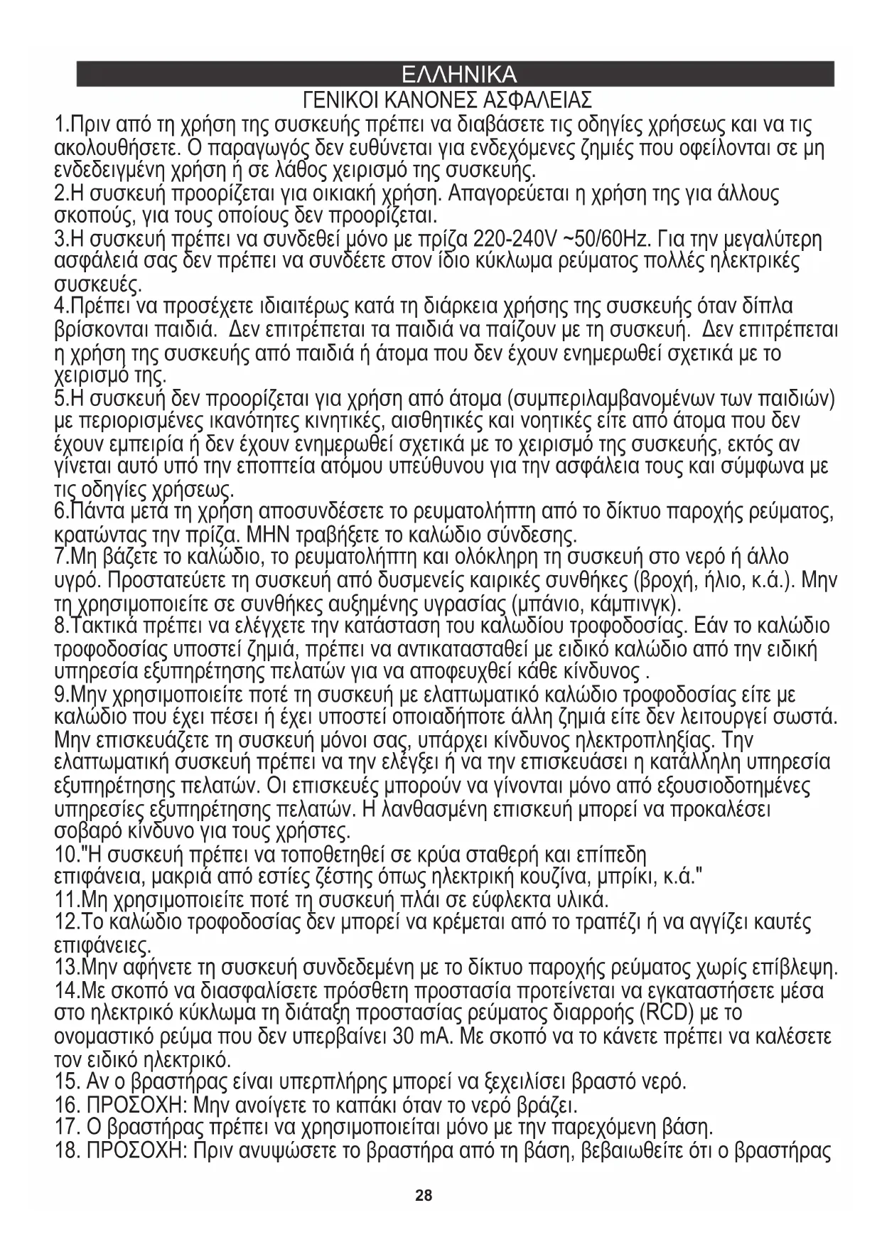 10."Η συσκευή πρέπει να τοποθετηθεί σε κρύα σταθερή και επίπεδη επιφάνεια, μακριά από εστίες ζέστης όπως ηλεκτρική κουζίνα, μπρίκι, κ.ά." 13.Μην αφήνετε τη συσκευή συνδεδεμένη με το δίκτυο παροχής ρεύματος χωρίς επίβλεψη. 14.Με σκοπό να διασφαλίσετε πρόσθετη προστασία προτείνεται να εγκαταστήσετε μέσα στο ηλεκτρικό κύκλωμα τη διάταξη προστασίας ρεύματος διαρροής (RCD) με το ονομαστικό ρεύμα που δεν υπερβαίνει 30 mA. Με σκοπό να το κάνετε πρέπει να καλέσετε τον ειδικό ηλεκτρικό.