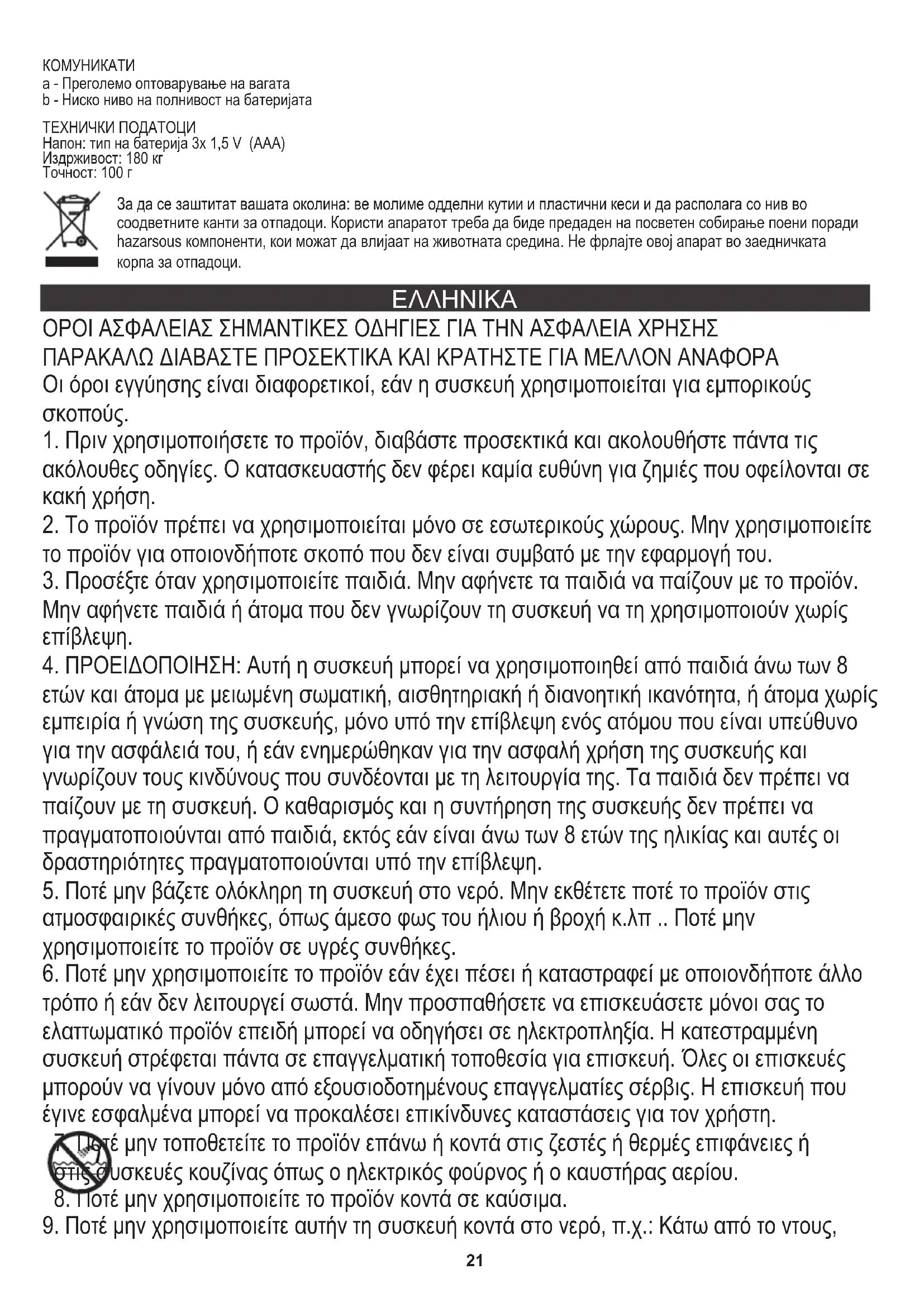 μεγάλο χρονικό διάστημα. Για την προστασία της συσκευής και της υγείας σας, αντικαταστήστε τακτικά και αποφύγετε την επαφή με το δέρμα με διαρροές μπαταριών. Ισχύς: Τύπος μπαταρίας 3x1,5V (AAA) ΚΑΘΑΡΙΣΜΟΣ ΚΑΙ ΣΥΝΤΗΡΗΣΗ - Σκουπίστε τη ζυγαριά με ένα ξηρό ή ελαφρώς υγρό πανί.