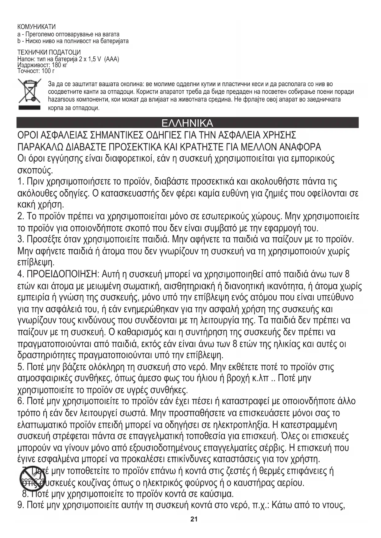 φροντίζουμε το φυσικό περιβάλλον. Παρακαλούμε να πετάτε τις συσκευασίες από χαρτόνι στον κάδο ανακύκλωσης απορριμμάτων χαρτιού. Τις σακούλες από πολυαιθυλένιο (ΡΕ), απορρίψτε τις στον κάδο ανακύκλωσης πλαστικών. Η φθαρμένη συσκευή πρέπει να απορρίπτεται στο κατάλληλο σημείο, εξαιτίας των επικίνδυνων στοιχείων που περιέχει και τα οποία μπορεί να αποτελέσουν απειλή για το περιβάλλον. Η ηλεκτρική συσκευή πρέπει να απορρίπτεται με τέτοιο τρόπο ώστε να περιοριστεί η επαναχρησιμοποίηση της. Εάν στη συσκευή βρίσκονται μπαταρίες, αυτές πρέπει να αφαιρεθούν και να πεταχτούν σε ξεχωριστό κάδο. SLOVENŠČINA VARNOSTNI POGOJI POMEMBNA NAVODILA O VARNOSTI UPORABEPROSIMO, DA PREBERITE POZORNO IN Hranite za prihodnjo referencoGarancijski pogoji se razlikujejo, če se naprava uporablja v komercialne namene.23