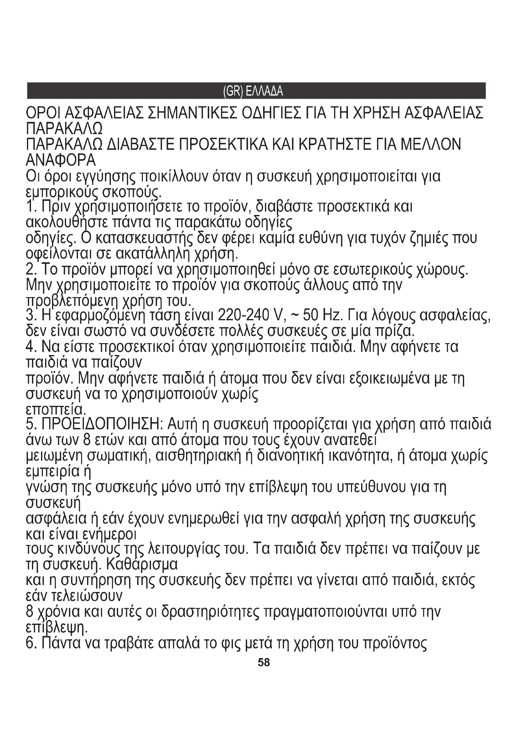 ασφάλεια ή εάν έχουν ενημερωθεί για την ασφαλή χρήση της συσκευής και είναι ενήμεροι τους κινδύνους της λειτουργίας του. Τα παιδιά δεν πρέπει να παίζουν με τη συσκευή. Καθάρισμα και η συντήρηση της συσκευής δεν πρέπει να γίνεται από παιδιά, εκτός εάν τελειώσουν59