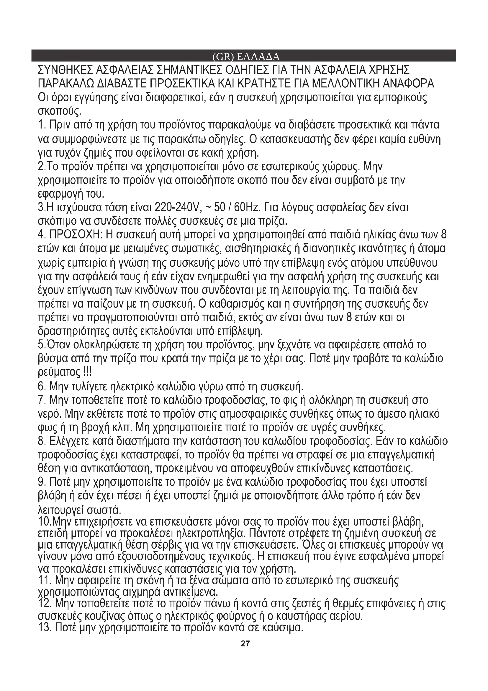 ετών και άτομα με μειωμένες σωματικές, αισθητηριακές ή διανοητικές ικανότητες ή άτομα χωρίς εμπειρία ή γνώση της συσκευής μόνο υπό την επίβλεψη ενός ατόμου υπεύθυνου για την ασφάλειά τους ή εάν είχαν ενημερωθεί για την ασφαλή χρήση της συσκευής και έχουν επίγνωση των κινδύνων που συνδέονται με τη λειτουργία της. Τα παιδιά δεν πρέπει να παίζουν με τη συσκευή. Ο καθαρισμός και η συντήρηση της συσκευής δεν πρέπει να πραγματοποιούνται από παιδιά, εκτός αν είναι άνω των 8 ετών και οι δραστηριότητες αυτές εκτελούνται υπό επίβλεψη. 5.Όταν ολοκληρώσετε τη χρήση του προϊόντος, μην ξεχνάτε να αφαιρέσετε απαλά το βύσμα από την πρίζα που κρατά την πρίζα με το χέρι σας. Ποτέ μην τραβάτε το καλώδιο ρεύματος !!!