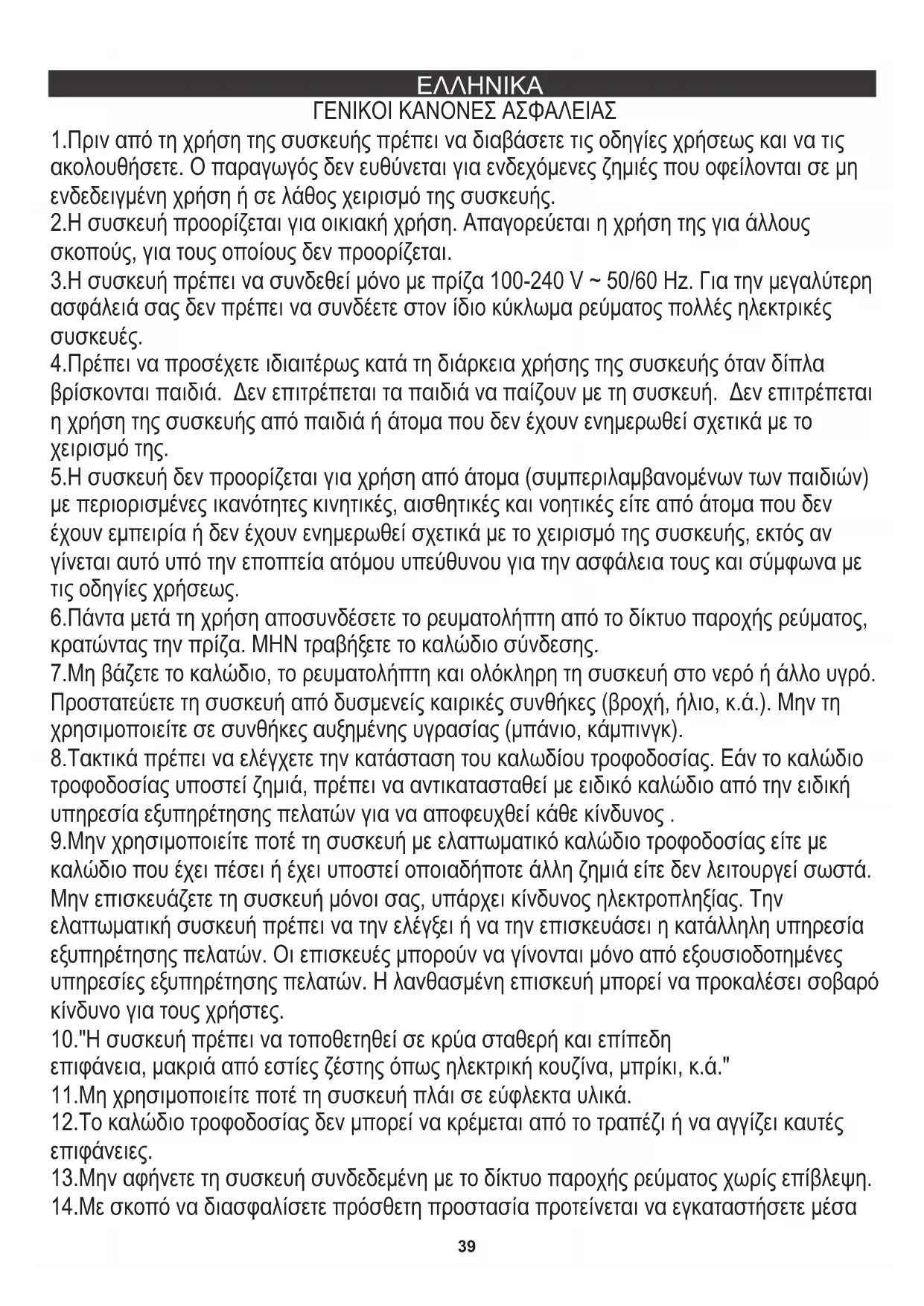 4.Πρέπει να προσέχετε ιδιαιτέρως κατά τη διάρκεια χρήσης της συσκευής όταν δίπλα βρίσκονται παιδιά. Δεν επιτρέπεται τα παιδιά να παίζουν με τη συσκευή. Δεν επιτρέπεται η χρήση της συσκευής από παιδιά ή άτομα που δεν έχουν ενημερωθεί σχετικά με το χειρισμό της. 5.Η συσκευή δεν προορίζεται για χρήση από άτομα (συμπεριλαμβανομένων των παιδιών) με περιορισμένες ικανότητες κινητικές, αισθητικές και νοητικές είτε από άτομα που δεν έχουν εμπειρία ή δεν έχουν ενημερωθεί σχετικά με το χειρισμό της συσκευής, εκτός αν γίνεται αυτό υπό την εποπτεία ατόμου υπεύθυνου για την ασφάλεια τους και σύμφωνα με τις οδηγίες χρήσεως. 6.Πάντα μετά τη χρήση αποσυνδέσετε το ρευματολήπτη από το δίκτυο παροχής ρεύματος, κρατώντας την πρίζα. ΜΗΝ τραβήξετε το καλώδιο σύνδεσης. 7.Μη βάζετε το καλώδιο, το ρευματολήπτη και ολόκληρη τη συσκευή στο νερό ή άλλο υγρό. Προστατεύετε τη συσκευή από δυσμενείς καιρικές συνθήκες (βροχή, ήλιο, κ.ά.). Μην τη χρησιμοποιείτε σε συνθήκες αυξημένης υγρασίας (μπάνιο, κάμπινγκ). 8.Τακτικά πρέπει να ελέγχετε την κατάσταση του καλωδίου τροφοδοσίας. Εάν το καλώδιο τροφοδοσίας υποστεί ζημιά, πρέπει να αντικατασταθεί με ειδικό καλώδιο από την ειδική υπηρεσία εξυπηρέτησης πελατών για να αποφευχθεί κάθε κίνδυνος . 9.Μην χρησιμοποιείτε ποτέ τη συσκευή με ελαττωματικό καλώδιο τροφοδοσίας είτε με καλώδιο που έχει πέσει ή έχει υποστεί οποιαδήποτε άλλη ζημιά είτε δεν λειτουργεί σωστά. Μην επισκευάζετε τη συσκευή μόνοι σας, υπάρχει κίνδυνος ηλεκτροπληξίας. Την ελαττωματική συσκευή πρέπει να την ελέγξει ή να την επισκευάσει η κατάλληλη υπηρεσία εξυπηρέτησης πελατών. Οι επισκευές μπορούν να γίνονται μόνο από εξουσιοδοτημένες υπηρεσίες εξυπηρέτησης πελατών. Η λανθασμένη επισκευή μπορεί να προκαλέσει σοβαρό κίνδυνο για τους χρήστες. 10."Η συσκευή πρέπει να τοποθετηθεί σε κρύα σταθερή και επίπεδη επιφάνεια, μακριά από εστίες ζέστης όπως ηλεκτρική κουζίνα, μπρίκι, κ.ά." 11.Μη χρησιμοποιείτε ποτέ τη συσκευή πλάι σε εύφλεκτα υλικά. 12.Το καλώδιο τροφοδοσίας δεν μπορεί να κρέμεται από το τραπέζι ή να αγγίζει καυτές επιφάνειες. 13.Μην αφήνετε τη συσκευή συνδεδεμένη με το δίκτυο παροχής ρεύματος χωρίς επίβλεψη. 14.Με σκοπό να διασφαλίσετε πρόσθετη προστασία προτείνεται να εγκαταστήσετε μέσα ΕΛΛΗΝΙΚΑ40 στο ηλεκτρικό κύκλωμα τη διάταξη προστασίας ρεύματος διαρροής (RCD) με το ονομαστικό ρεύμα που δεν υπερβαίνει 30 mA. Με σκοπό να το κάνετε πρέπει να καλέσετε τον ειδικό ηλεκτρικό.