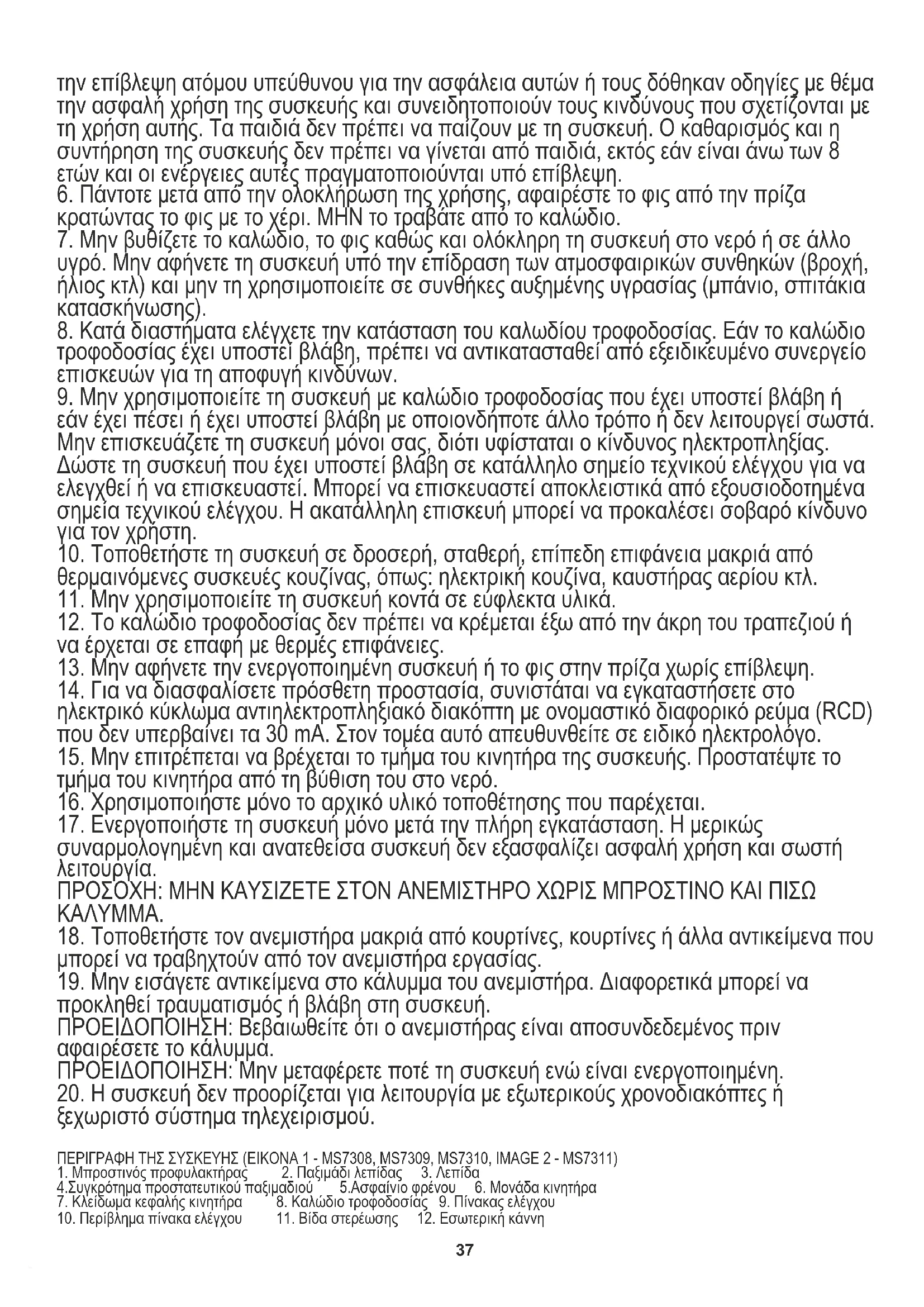 μεντεσέδων στο εξωτερικό μέρος της πρόσοψης. ΧΡΗΣΗ ΤΗΣ ΣΥΣΚΕΥΗΣ 1. Πατήστε το πλήκτρο '0' στον πίνακα ελέγχου (9) και, στη συνέχεια, συνδέστε το καλώδιο ρεύματος σε μια ηλεκτρική πρίζα. 2. Ενεργοποιήστε τον ανεμιστήρα πιέζοντας το πλήκτρο '1' ή '2' (MS7308)) ή '1', '2' ή '3' (MS7309, MS7310, MS7311). Μετά από λίγα δευτερόλεπτα οι λεπίδες του ανεμιστήρα θα αρχίσουν να περιστρέφονται με τη μέγιστη ταχύτητα της επιλεγμένης ταχύτητας 3. Για να ενεργοποιήσετε την κίνηση ταλάντωσης της μονάδας ανεμιστήρα (οριζόντια), πατήστε το κουμπί ασφάλισης κινητήρα (7). Αν τραβήξετε το κουμπί προς τα πάνω, η ταλάντωση θα σβήσει (οριζόντια).