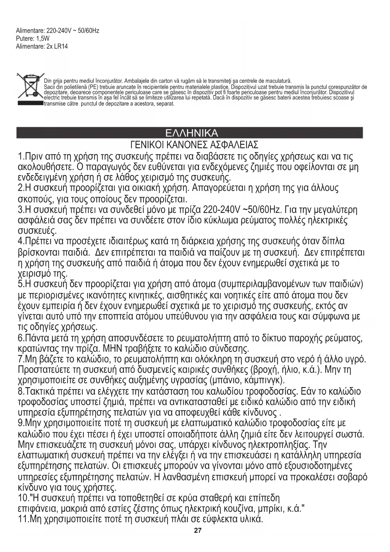 Din grija pentru mediul înconjurător. Ambalajele din carton vă rugăm să le transmiteţi şa centrele de maculatură. Sacii din polietilenă (PE) trebuie aruncate în recipientele pentru materialele plastice. Dispozitivul uzat trebuie transmis la punctul corespunzător de depozitare, deoarece componentele periculoase care se găsesc în dispozitiv pot fi foarte periculoase pentru mediul înconjurător. Dispozitivul electric trebuie transmis în aşa fel încât să se limiteze utilizarea lui repetată. Dacă în dispozitiv se găsesc baterii acestea trebuiesc scoase şi transmise către punctul de depozitare a acestora, separat. 6.Πάντα μετά τη χρήση αποσυνδέσετε το ρευματολήπτη από το δίκτυο παροχής ρεύματος, κρατώντας την πρίζα. ΜΗΝ τραβήξετε το καλώδιο σύνδεσης. 5.Η συσκευή δεν προορίζεται για χρήση από άτομα (συμπεριλαμβανομένων των παιδιών) με περιορισμένες ικανότητες κινητικές, αισθητικές και νοητικές είτε από άτομα που δεν έχουν εμπειρία ή δεν έχουν ενημερωθεί σχετικά με το χειρισμό της συσκευής, εκτός αν γίνεται αυτό υπό την εποπτεία ατόμου υπεύθυνου για την ασφάλεια τους και σύμφωνα με τις οδηγίες χρήσεως. 7.Μη βάζετε το καλώδιο, το ρευματολήπτη και ολόκληρη τη συσκευή στο νερό ή άλλο υγρό. Προστατεύετε τη συσκευή από δυσμενείς καιρικές συνθήκες (βροχή, ήλιο, κ.ά.). Μην τη χρησιμοποιείτε σε συνθήκες αυξημένης υγρασίας (μπάνιο, κάμπινγκ). 8.Τακτικά πρέπει να ελέγχετε την κατάσταση του καλωδίου τροφοδοσίας. Εάν το καλώδιο τροφοδοσίας υποστεί ζημιά, πρέπει να αντικατασταθεί με ειδικό καλώδιο από την ειδική υπηρεσία εξυπηρέτησης πελατών για να αποφευχθεί κάθε κίνδυνος . 9.Μην χρησιμοποιείτε ποτέ τη συσκευή με ελαττωματικό καλώδιο τροφοδοσίας είτε με καλώδιο που έχει πέσει ή έχει υποστεί οποιαδήποτε άλλη ζημιά είτε δεν λειτουργεί σωστά. Μην επισκευάζετε τη συσκευή μόνοι σας, υπάρχει κίνδυνος ηλεκτροπληξίας. Την ελαττωματική συσκευή πρέπει να την ελέγξει ή να την επισκευάσει η κατάλληλη υπηρεσία εξυπηρέτησης πελατών. Οι επισκευές μπορούν να γίνονται μόνο από εξουσιοδοτημένες υπηρεσίες εξυπηρέτησης πελατών. Η λανθασμένη επισκευή μπορεί να προκαλέσει σοβαρό κίνδυνο για τους χρήστες. ΓΕΝΙΚΟΙ ΚΑΝΟΝΕΣ ΑΣΦΑΛΕΙΑΣ 2.Η συσκευή προορίζεται για οικιακή χρήση. Απαγορεύεται η χρήση της για άλλους σκοπούς, για τους οποίους δεν προορίζεται. 3.Η συσκευή πρέπει να συνδεθεί μόνο με πρίζα 220-240V ~50/60Hz. Για την μεγαλύτερη ασφάλειά σας δεν πρέπει να συνδέετε στον ίδιο κύκλωμα ρεύματος πολλές ηλεκτρικές