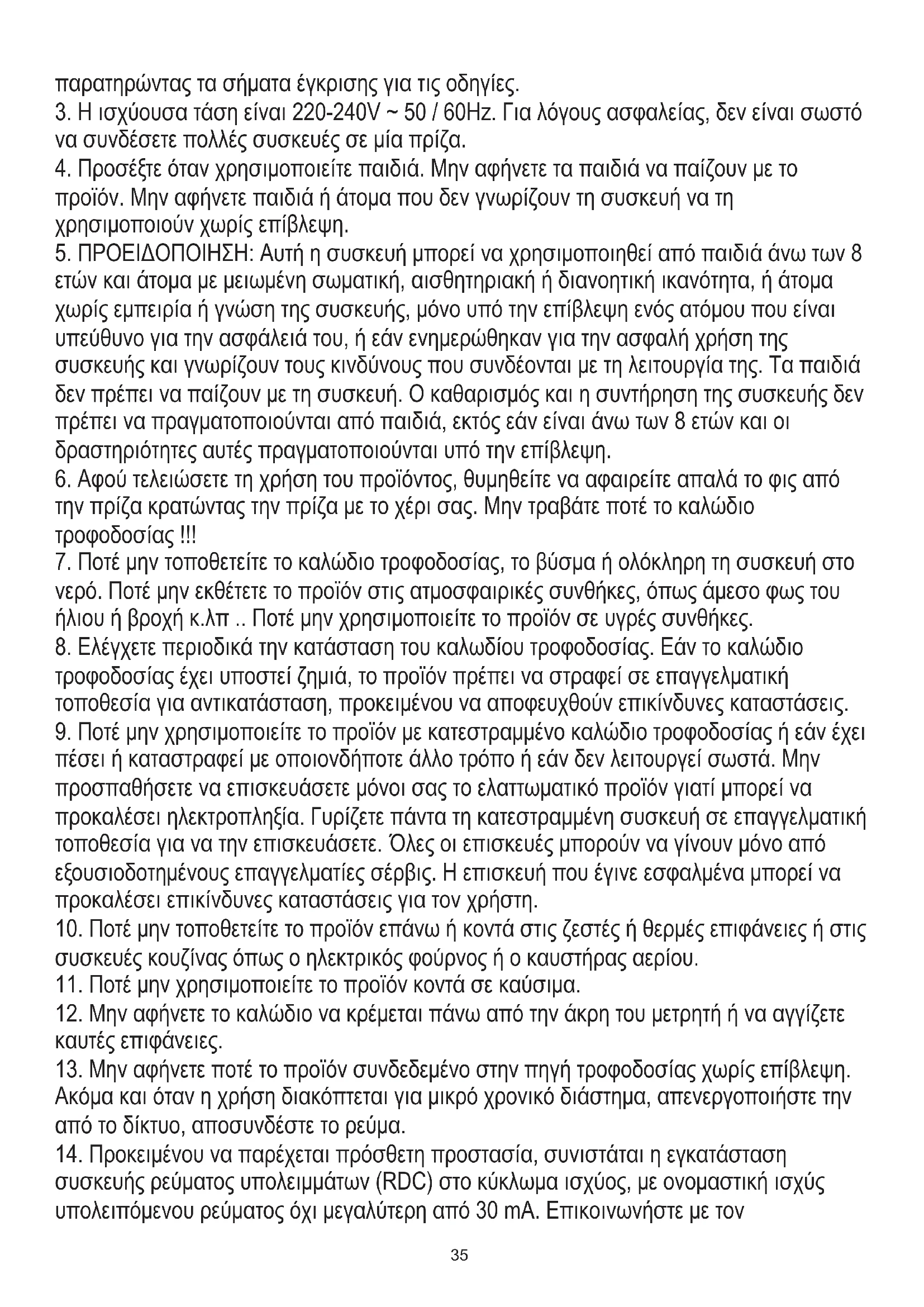 ακόλουθες οδηγίες. Ο κατασκευαστής δεν φέρει καμία ευθύνη για τυχόν ζημιές λόγω κακής χρήσης. ΟΡΟΙ ΑΣΦΑΛΕΙΑΣ ΣΗΜΑΝΤΙΚΕΣ ΟΔΗΓΙΕΣ ΓΙΑ ΤΗΝ ΑΣΦΑΛΕΙΑ ΧΡΗΣΗΣ ΠΑΡΑΚΑΛΩ Οι όροι εγγύησης είναι διαφορετικοί, εάν η συσκευή χρησιμοποιείται για εμπορικούς