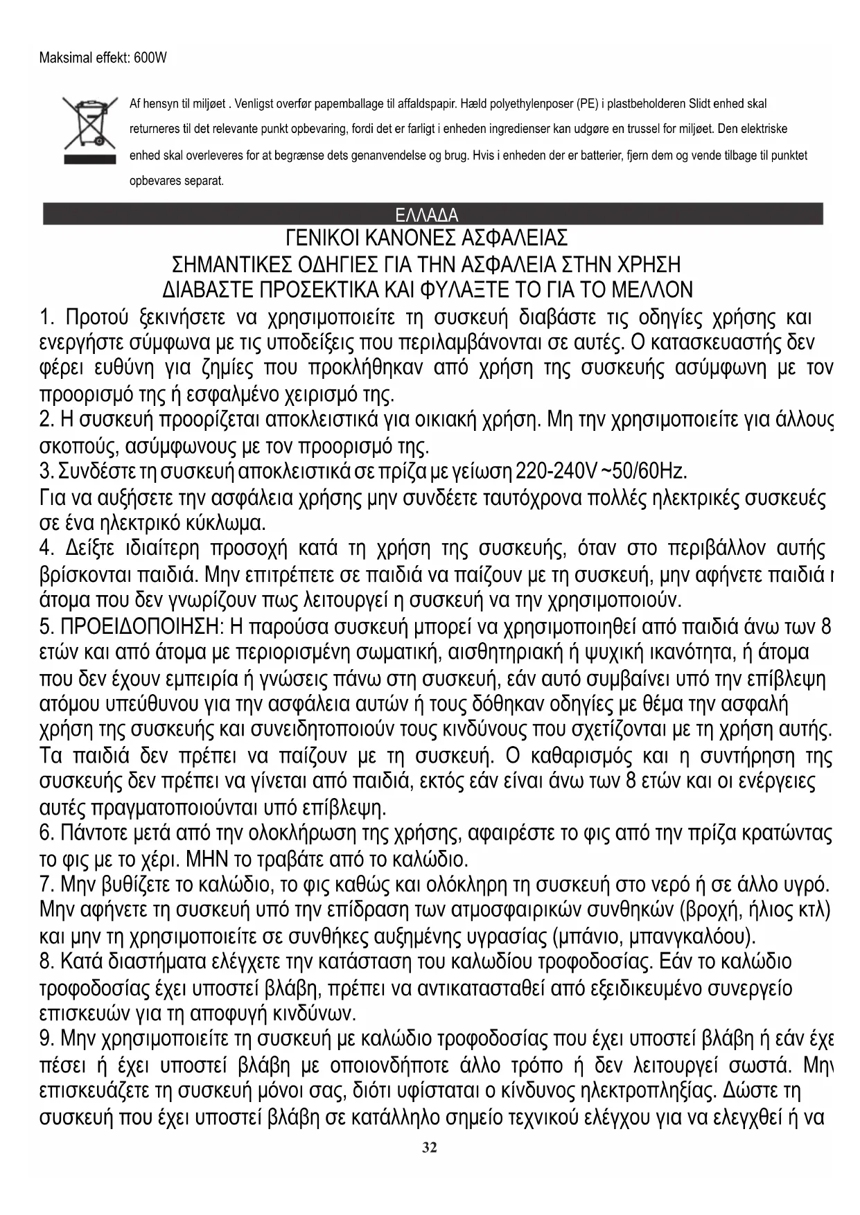3. Συνδέστε τη συσκευή αποκλειστικά σε πρίζα με γείωση 220-240V ~50/60Hz.