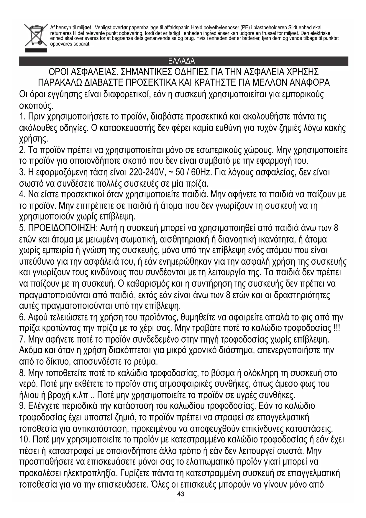 πέσει ή καταστραφεί με οποιονδήποτε άλλο τρόπο ή εάν δεν λειτουργεί σωστά. Μην προσπαθήσετε να επισκευάσετε μόνοι σας το ελαττωματικό προϊόν γιατί μπορεί να προκαλέσει ηλεκτροπληξία. Γυρίζετε πάντα τη κατεστραμμένη συσκευή σε επαγγελματική τοποθεσία για να την επισκευάσετε. Όλες οι επισκευές μπορούν να γίνουν μόνο από Af hensyn til miljøet . Venligst overfør papemballage til affaldspapir. Hæld polyethylenposer (PE) i plastbeholderen Slidt enhed skal returneres til det relevante punkt opbevaring, fordi det er farligt i enheden ingredienser kan udgøre en trussel for miljøet. Den elektriske enhed skal overleveres for at begrænse dets genanvendelse og brug. Hvis i enheden der er batterier, fjern dem og vende tilbage til punktet opbevares separat. ΕΛΛΑΔΑ44 εξουσιοδοτημένους επαγγελματίες σέρβις. Η επισκευή που έγινε εσφαλμένα μπορεί να προκαλέσει επικίνδυνες καταστάσεις για τον χρήστη.