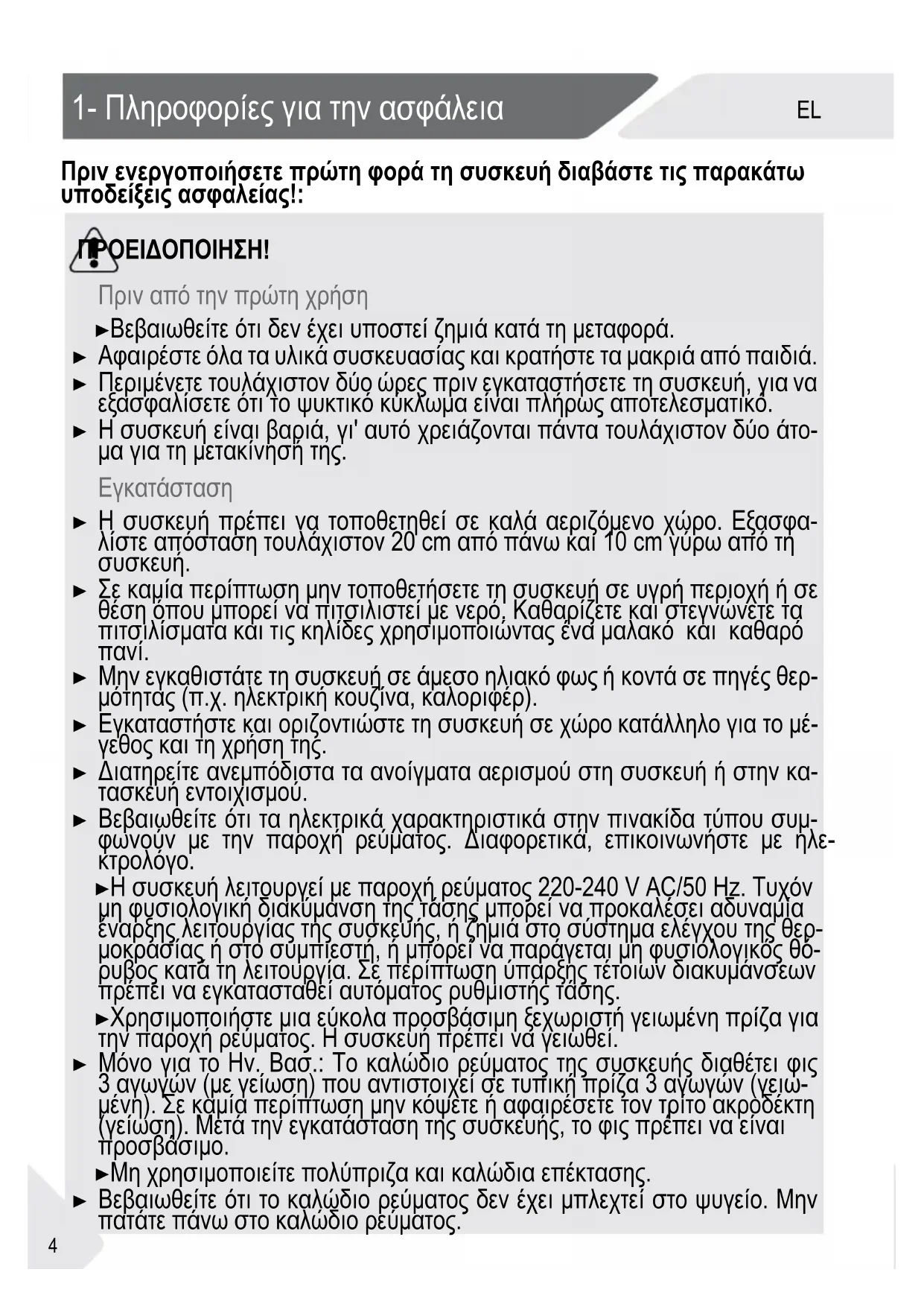 ΠΡΟΕΙΔΟΠΟΙΗΣΗ! Για να αποφύγετε τυχόν κινδύνους, πρέπει να ζητάτε η αντικατάσταση καλωδίων ρεύματος που έχει υποστεί ζημιά να γίνει από την εξυπηρέτηση πελατών (βλ. κάρτα εγγύησης).