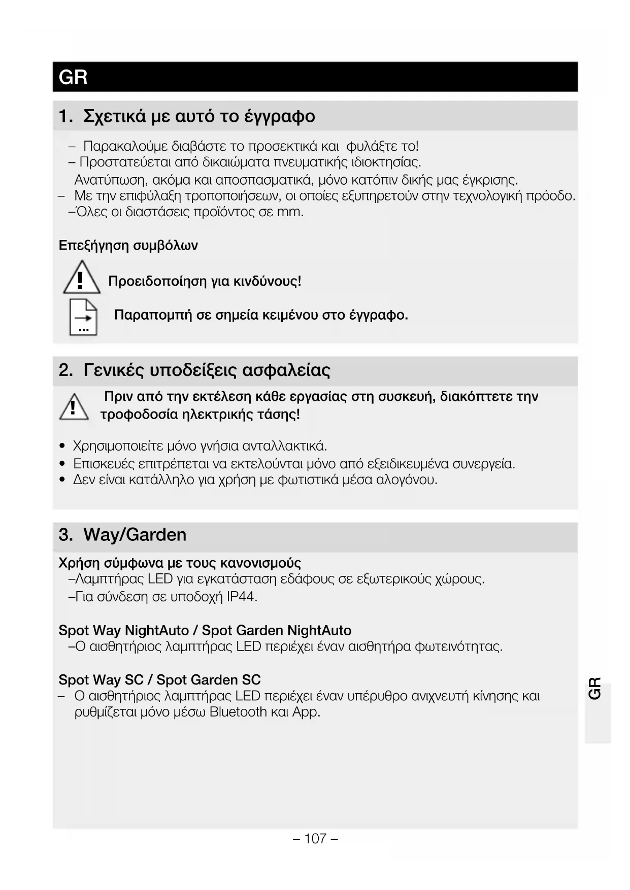 Χρήση σύμφωνα με τους κανονισμούς – Λαμπτήρας LED για εγκατάσταση εδάφους σε εξωτερικούς χώρους. – Για σύνδεση σε υποδοχή IP44.Spot Way NightAuto / Spot Garden NightAuto – Ο αισθητήριος λαμπτήρας LED περιέχει έναν αισθητήρα φωτεινότητας. Spot Way SC / Spot Garden SC – Ο αισθητήριος λαμπτήρας LED περιέχει έναν υπέρυθρο ανιχνευτή κίνησης και ρυθμίζεται μόνο μέσω Bluetooth και App. GRGR– 108 – Χρήση όχι σύμφωνα με τους κανονισμούς – Ο προβολέας LED δεν διαθέτει ρεοστατική ρύθμιση. Χωρίς ρεοστατική