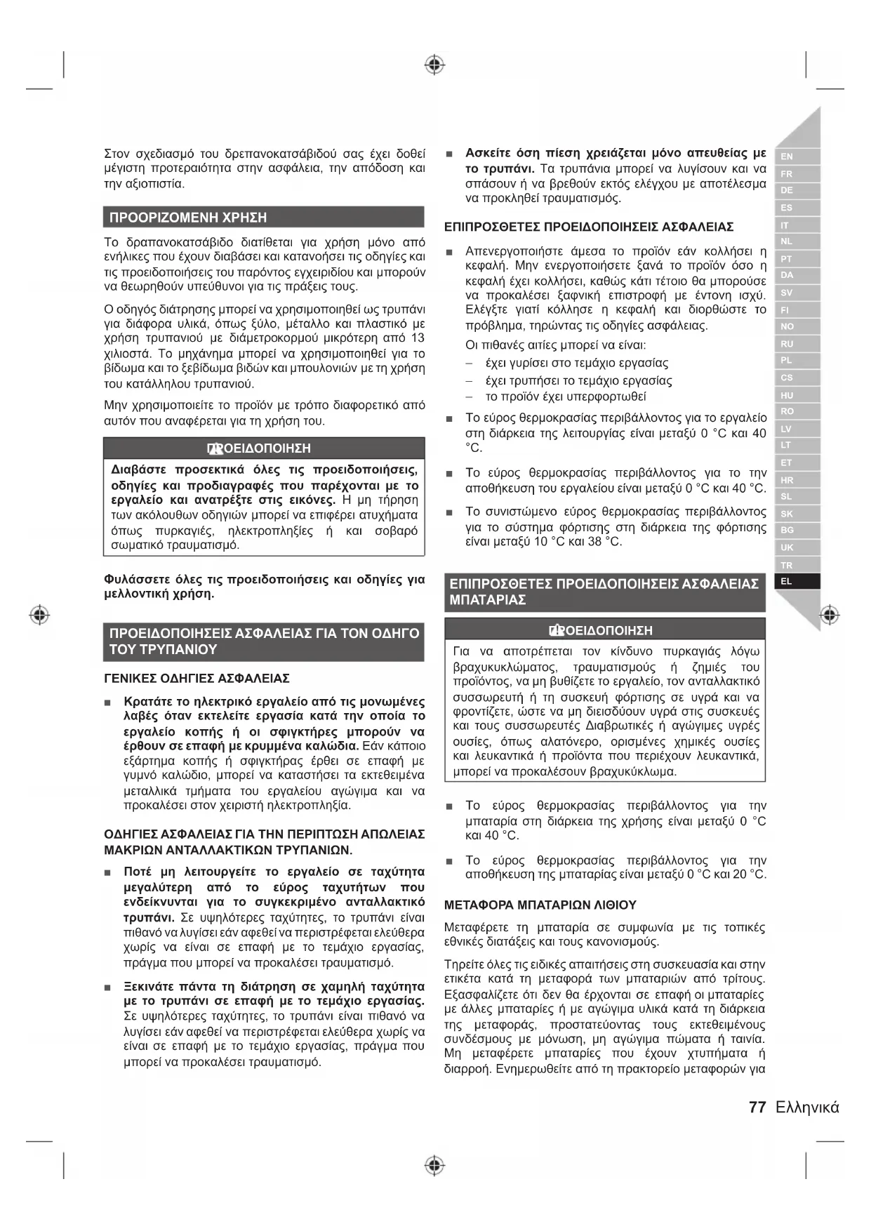 Στον σχεδιασμό του δρεπανοκατσάβιδού σας έχει δοθεί μέγιστη προτεραιότητα στην ασφάλεια, την απόδοση και την αξιοπιστία. ΠΡΟΟΡΙΖΟΜΕΝΗ ΧΡΗΣΗ Το δραπανοκατσάβιδο διατίθεται για χρήση μόνο από ενήλικες που έχουν διαβάσει και κατανοήσει τις οδηγίες και τις προειδοποιήσεις του παρόντος εγχειριδίου και μπορούν να θεωρηθούν υπεύθυνοι για τις πράξεις τους. Ο οδηγός διάτρησης μπορεί να χρησιμοποιηθεί ως τρυπάνι για διάφορα υλικά, όπως ξύλο, μέταλλο και πλαστικό με χρήση τρυπανιού με διάμετρο κορμού μικρότερη από 13 χιλιοστά. Το μηχάνημα μπορεί να χρησιμοποιηθεί για το βίδωμα και το ξεβίδωμα βιδών και μπουλονιών με τη χρήση του κατάλληλου τρυπανιού. Μην χρησιμοποιείτε το προϊόν με τρόπο διαφορετικό από αυτόν που αναφέρεται για τη χρήση του. ΠΡΟΕΙΔΟΠΟΙΗΣΗ Διαβάστε προσεκτικά όλες τις προειδοποιήσεις, οδηγίες και προδιαγραφές που παρέχονται με το εργαλείο και ανατρέξτε στις εικόνες. Η μη τήρηση των ακόλουθων οδηγιών μπορεί να επιφέρει ατυχήματα όπως πυρκαγιές, ηλεκτροπληξίες ή και σοβαρό σωματικό τραυματισμό. Φυλάσσετε όλες τις προειδοποιήσεις και οδηγίες για μελλοντική χρήση. ΠΡΟΕΙΔΟΠΟΙΗΣΕΙΣ ΑΣΦΑΛΕΙΑΣ ΓΙΑ ΤΟΝ ΟΔΗΓΟ ΤΟΥ ΤΡΥΠΑΝΙΟΥ ΓΕΝΙΚΕΣ ΟΔΗΓΙΕΣ ΑΣΦΑΛΕΙΑΣ ■ Κρατάτε το ηλεκτρικό εργαλείο από τις μονωμένες λαβές όταν εκτελείτε εργασία κατά την οποία το εργαλείο κοπής ή οι σφιγκτήρες μπορούν να έρθουν σε επαφή με κρυμμένα καλώδια. Εάν κάποιο εξάρτημα κοπής ή σφιγκτήρας έρθει σε επαφή με γυμνό καλώδιο, μπορεί να καταστήσει τα εκτεθειμένα μεταλλικά τμήματα του εργαλείου αγώγιμα και να προκαλέσει στον χειριστή ηλεκτροπληξία. ΟΔΗΓΙΕΣ ΑΣΦΑΛΕΙΑΣ ΓΙΑ ΤΗΝ ΠΕΡΙΠΤΩΣΗ ΑΠΩΛΕΙΑΣ ΜΑΚΡΙΩΝ ΑΝΤΑΛΛΑΚΤΙΚΩΝ ΤΡΥΠΑΝΙΩΝ. ■ Ποτέ μη λειτουργείτε το εργαλείο σε ταχύτητα μεγαλύτερη από το εύρος ταχυτήτων που ενδείκνυνται για το συγκεκριμένο ανταλλακτικό τρυπάνι. Σε υψηλότερες ταχύτητες, το τρυπάνι είναι πιθανό να λυγίσει εάν αφεθεί να περιστρέφεται ελεύθερα χωρίς να είναι σε επαφή με το τεμάχιο εργασίας, πράγμα που μπορεί να προκαλέσει τραυματισμό. ■ Ξεκινάτε πάντα τη διάτρηση σε χαμηλή ταχύτητα με το τρυπάνι σε επαφή με το τεμάχιο εργασίας. Σε υψηλότερες ταχύτητες, το τρυπάνι είναι πιθανό να λυγίσει εάν αφεθεί να περιστρέφεται ελεύθερα χωρίς να είναι σε επαφή με το τεμάχιο εργασίας, πράγμα που μπορεί να προκαλέσει τραυματισμό. ■ Ασκείτε όση πίεση χρειάζεται μόνο απευθείας με το τρυπάνι. Τα τρυπάνια μπορεί να λυγίσουν και να σπάσουν ή να βρεθούν εκτός ελέγχου με αποτέλεσμα να προκληθεί τραυματισμός. ΕΠΙΠΡΟΣΘΕΤΕΣ ΠΡΟΕΙΔΟΠΟΙΗΣΕΙΣ ΑΣΦΑΛΕΙΑΣ ■ Απενεργοποιήστε άμεσα το προϊόν εάν κολλήσει η κεφαλή. Μην ενεργοποιήσετε ξανά το προϊόν όσο η κεφαλή έχει κολλήσει, καθώς κάτι τέτοιο θα μπορούσε να προκαλέσει ξαφνική επιστροφή με έντονη ισχύ. Ελέγξτε γιατί κόλλησε η κεφαλή και διορθώστε το πρόβλημα, τηρώντας τις οδηγίες ασφάλειας. Οι πιθανές αιτίες μπορεί να είναι: – έχει γυρίσει στο τεμάχιο εργασίας – έχει τρυπήσει το τεμάχιο εργασίας – το προϊόν έχει υπερφορτωθεί ■ Το εύρος θερμοκρασίας περιβάλλοντος για το εργαλείο στη διάρκεια της λειτουργίας είναι μεταξύ 0 °C και 40 °C. ■ Το εύρος θερμοκρασίας περιβάλλοντος για το την αποθήκευση του εργαλείου είναι μεταξύ 0 °C και 40 °C. ■ Το συνιστώμενο εύρος θερμοκρασίας περιβάλλοντος για το σύστημα φόρτισης στη διάρκεια της φόρτισης είναι μεταξύ 10 °C και 38 °C. ΕΠΙΠΡΟΣΘΕΤΕΣ ΠΡΟΕΙΔΟΠΟΙΗΣΕΙΣ ΑΣΦΑΛΕΙΑΣ