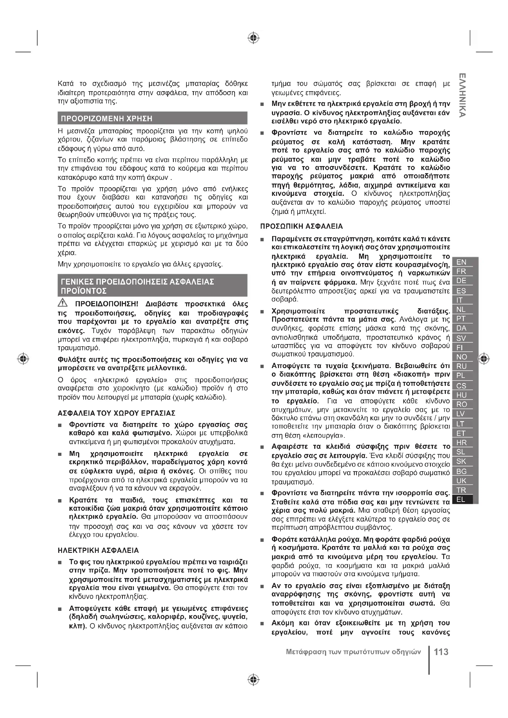 ΠΡΟΕΙΔΟΠΟΙΗΣΗ! Διαβάστε προσεκτικά όλες τις προειδοποιήσεις, οδηγίες και προδιαγραφές που παρέχονται με το εργαλείο και ανατρέξτε στις εικόνες. Τυχόν παράβλεψη των παρακάτω οδηγιών μπορεί να επιφέρει ηλεκτροπληξία, πυρκαγιά ή και σοβαρό τραυματισμό. Φυλάξτε αυτές τις προειδοποιήσεις και οδηγίες για να μπορέσετε να ανατρέξετε μελλοντικά. Ο όρος «ηλεκτρικό εργαλείο» στις προειδοποιήσεις αναφέρεται στο χειροκίνητο (με καλώδιο) προϊόν ή στο προϊόν που λειτουργεί με μπαταρία (χωρίς καλώδιο). ΑΣΦΑΛΕΙΑ ΤΟΥ ΧΩΡΟΥ ΕΡΓΑΣΙΑΣ ■ Φροντίστε να διατηρείτε το χώρο εργασίας σας καθαρό και καλά φωτισμένο. Χώροι με υπερβολικά αντικείμενα ή μη φωτισμένοι προκαλούν ατυχήματα. ■ Μη χρησιμοποιείτε ηλεκτρικά εργαλεία σε εκρηκτικό περιβάλλον, παραδείγματος χάρη κοντά σε εύφλεκτα υγρά, αέρια ή σκόνες. Οι σπίθες που προέρχονται από τα ηλεκτρικά εργαλεία μπορούν να τα αναφλέξουν ή να τα κάνουν να εκραγούν. ■ Κρατάτε τα παιδιά, τους επισκέπτες και τα κατοικίδια ζώα μακριά όταν χρησιμοποιείτε κάποιο ηλεκτρικό εργαλείο. Θα μπορούσαν να αποσπάσουν την προσοχή σας και να σας κάνουν να χάσετε τον έλεγχο του εργαλείου. ΗΛΕΚΤΡΙΚΗ ΑΣΦΑΛΕΙΑ ■ Το φις του ηλεκτρικού εργαλείου πρέπει να ταιριάζει στην πρίζα. Μην τροποποιήσετε ποτέ το φις. Μην χρησιμοποιείτε ποτέ μετασχηματιστές με ηλεκτρικά εργαλεία που είναι γειωμένα. Θα αποφύγετε έτσι τον κίνδυνο ηλεκτροπληξίας. ■ Αποφεύγετε κάθε επαφή με γειωμένες επιφάνειες (δηλαδή σωληνώσεις, καλοριφέρ, κουζίνες, ψυγεία, κλπ). Ο κίνδυνος ηλεκτροπληξίας αυξάνεται αν κάποιο τμήμα του σώματός σας βρίσκεται σε επαφή με γειωμένες επιφάνειες. ■ Μην εκθέτετε τα ηλεκτρικά εργαλεία στη βροχή ή την υγρασία. Ο κίνδυνος ηλεκτροπληξίας αυξάνεται εάν εισέλθει νερό στο ηλεκτρικό εργαλείο. ■ Φροντίστε να διατηρείτε το καλώδιο παροχής ρεύματος σε καλή κατάσταση. Μην κρατάτε ποτέ το εργαλείο σας από το καλώδιο παροχής ρεύματος και μην τραβάτε ποτέ το καλώδιο για να το αποσυνδέσετε. Κρατάτε το καλώδιο παροχής ρεύματος μακριά από οποιαδήποτε πηγή θερμότητας, λάδια, αιχμηρά αντικείμενα και κινούμενα στοιχεία. Ο κίνδυνος ηλεκτροπληξίας αυξάνεται αν το καλώδιο παροχής ρεύματος υποστεί ζημιά ή μπλεχτεί. ΠΡΟΣΩΠΙΚΗ ΑΣΦΑΛΕΙΑ ■ Παραμένετε σε επαγρύπνηση, κοιτάτε καλά τι κάνετε και επικαλεστείτε τη λογική σας όταν χρησιμοποιείτε ηλεκτρικά εργαλεία. Μη χρησιμοποιείτε το ηλεκτρικό εργαλείο σας όταν είστε κουρασμένος/η, υπό την επήρεια οινοπνεύματος ή ναρκωτικών ή αν παίρνετε φάρμακα. Μην ξεχνάτε ποτέ πως ένα δευτερόλεπτο απροσεξίας αρκεί για να τραυματιστείτε
