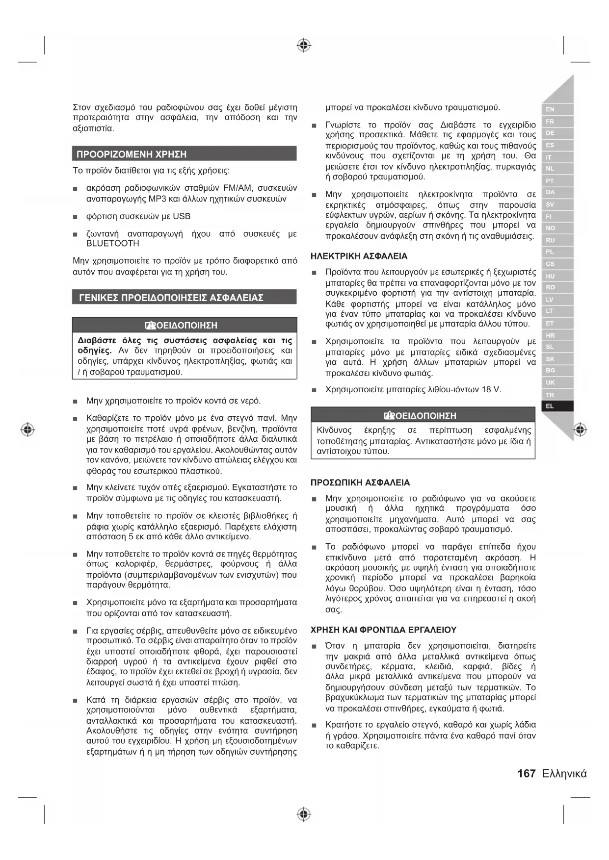 Στον σχεδιασμό του ραδιοφώνου σας έχει δοθεί μέγιστη προτεραιότητα στην ασφάλεια, την απόδοση και την αξιοπιστία. ΠΡΟΟΡΙΖΟΜΕΝΗ ΧΡΗΣΗ Το προϊόν διατίθεται για τις εξής χρήσεις: ■ ακρόαση ραδιοφωνικών σταθμών FM/AM, συσκευών αναπαραγωγής MP3 και άλλων ηχητικών συσκευών ■ φόρτιση συσκευών με USB ■ ζωντανή αναπαραγωγή ήχου από συσκευές με BLUETOOTH Μην χρησιμοποιείτε το προϊόν με τρόπο διαφορετικό από αυτόν που αναφέρεται για τη χρήση του. ΓΕΝΙΚΕΣ ΠΡΟΕΙΔΟΠΟΙΗΣΕΙΣ ΑΣΦΑΛΕΙΑΣ ΠΡΟΕΙΔΟΠΟΙΗΣΗ Διαβάστε όλες τις συστάσεις ασφαλείας και τις οδηγίες. Αν δεν τηρηθούν οι προειδοποιήσεις και οδηγίες, υπάρχει κίνδυνος ηλεκτροπληξίας, φωτιάς και / ή σοβαρού τραυματισμού. ■ Μην χρησιμοποιείτε το προϊόν κοντά σε νερό. ■ Καθαρίζετε το προϊόν μόνο με ένα στεγνό πανί. Μην χρησιμοποιείτε ποτέ υγρά φρένων, βενζίνη, προϊόντα με βάση το πετρέλαιο ή οποιαδήποτε άλλα διαλυτικά για τον καθαρισμό του εργαλείου. Ακολουθώντας αυτόν τον κανόνα, μειώνετε τον κίνδυνο απώλειας ελέγχου και φθοράς του εσωτερικού πλαστικού. ■ Μην κλείνετε τυχόν οπές εξαερισμού. Εγκαταστήστε το προϊόν σύμφωνα με τις οδηγίες του κατασκευαστή. ■ Μην τοποθετείτε το προϊόν σε κλειστές βιβλιοθήκες ή ράφια χωρίς κατάλληλο εξαερισμό. Παρέχετε ελάχιστη απόσταση 5 εκ από κάθε άλλο αντικείμενο. ■ Μην τοποθετείτε το προϊόν κοντά σε πηγές θερμότητας όπως καλοριφέρ, θερμάστρες, φούρνους ή άλλα προϊόντα (συμπεριλαμβανομένων των ενισχυτών) που παράγουν θερμότητα. ■ Χρησιμοποιείτε μόνο τα εξαρτήματα και προσαρτήματα που ορίζονται από τον κατασκευαστή. ■ Για εργασίες σέρβις, απευθυνθείτε μόνο σε ειδικευμένο προσωπικό. Το σέρβις είναι απαραίτητο όταν το προϊόν έχει υποστεί οποιαδήποτε φθορά, έχει παρουσιαστεί διαρροή υγρού ή τα αντικείμενα έχουν ριφθεί στο έδαφος, το προϊόν έχει εκτεθεί σε βροχή ή υγρασία, δεν λειτουργεί σωστά ή έχει υποστεί πτώση. ■ Κατά τη διάρκεια εργασιών σέρβις στο προϊόν, να χρησιμοποιούνται μόνο αυθεντικά εξαρτήματα, ανταλλακτικά και προσαρτήματα του κατασκευαστή. Ακολουθήστε τις οδηγίες στην ενότητα συντήρηση αυτού του εγχειριδίου. Η χρήση μη εξουσιοδοτημένων εξαρτημάτων ή η μη τήρηση των οδηγιών συντήρησης μπορεί να προκαλέσει κίνδυνο τραυματισμού. ■ Γνωρίστε το προϊόν σας Διαβάστε το εγχειρίδιο χρήσης προσεκτικά. Μάθετε τις εφαρμογές και τους περιορισμούς του προϊόντος, καθώς και τους πιθανούς κινδύνους που σχετίζονται με τη χρήση του. Θα μειώσετε έτσι τον κίνδυνο ηλεκτροπληξίας, πυρκαγιάς ή σοβαρού τραυματισμού. ■ Μην χρησιμοποιείτε ηλεκτροκίνητα προϊόντα σε εκρηκτικές ατμόσφαιρες, όπως στην παρουσία εύφλεκτων υγρών, αερίων ή σκόνης. Τα ηλεκτροκίνητα εργαλεία δημιουργούν σπινθήρες που μπορεί να προκαλέσουν ανάφλεξη στη σκόνη ή τις αναθυμιάσεις. ΗΛΕΚΤΡΙΚΗ ΑΣΦ