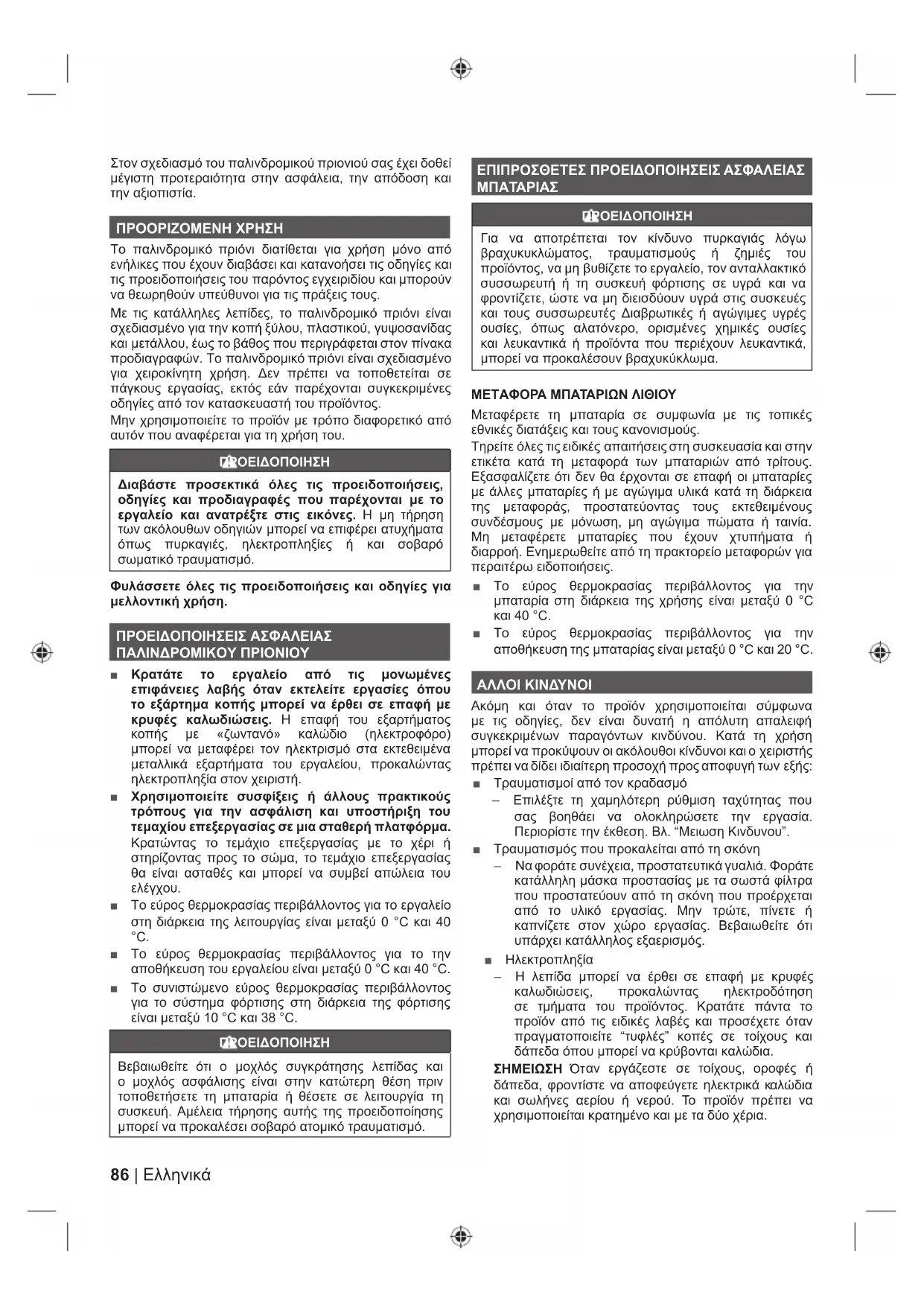 ELΣτον σχεδιασμό του παλινδρομικού πριονιού σας έχει δοθεί μέγιστη προτεραιότητα στην ασφάλεια, την απόδοση και την αξιοπιστία. ΠΡΟΟΡΙΖΟΜΕΝΗ ΧΡΗΣΗ Το παλινδρομικό πριόνι διατίθεται για χρήση μόνο από ενήλικες που έχουν διαβάσει και κατανοήσει τις οδηγίες και τις προειδοποιήσεις του παρόντος εγχειριδίου και μπορούν να θεωρηθούν υπεύθυνοι για τις πράξεις τους. Με τις κατάλληλες λεπίδες, το παλινδρομικό πριόνι είναι σχεδιασμένο για την κοπή ξύλου, πλαστικού, γυψοσανίδας και μετάλλου, έως το βάθος που περιγράφεται στον πίνακα προδιαγραφών. Το παλινδρομικό πριόνι είναι σχεδιασμένο για χειροκίνητη χρήση. Δεν πρέπει να τοποθετείται σε πάγκους εργασίας, εκτός εάν παρέχονται συγκεκριμένες οδηγίες από τον κατασκευαστή του προϊόντος. Μην χρησιμοποιείτε το προϊόν με τρόπο διαφορετικό από αυτόν που αναφέρεται για τη χρήση του. ΠΡΟΕΙΔΟΠΟΙΗΣΗ Διαβάστε προσεκτικά όλες τις προειδοποιήσεις, οδηγίες και προδιαγραφές που παρέχονται με το εργαλείο και ανατρέξτε στις εικόνες. Η μη τήρηση των ακόλουθων οδηγιών μπορεί να επιφέρει ατυχήματα όπως πυρκαγιές, ηλεκτροπληξίες ή και σοβαρό σωματικό τραυματισμό. Φυλάσσετε όλες τις προειδοποιήσεις και οδηγίες για μελλοντική χρήση. ΠΡΟΕΙΔΟΠΟΙΗΣΕΙΣ ΑΣΦΑΛΕΙΑΣ ΠΑΛΙΝΔΡΟΜΙΚΟΥ ΠΡΙΟΝΙΟΥ ■ Κρατάτε το εργαλείο από τις μονωμένες επιφάνειες λαβής όταν εκτελείτε εργασίες όπου το εξάρτημα κοπής μπορεί να έρθει σε επαφή με κρυφές καλωδιώσεις. Η επαφή του εξαρτήματος κοπής με «ζωντανό» καλώδιο (ηλεκτροφόρο) μπορεί να μεταφέρει τον ηλεκτρισμό στα εκτεθειμένα μεταλλικά εξαρτήματα του εργαλείου, προκαλώντας ηλεκτροπληξία στον χειριστή. ■ Χρησιμοποιείτε συσφίξεις ή άλλους πρακτικούς τρόπους για την ασφάλιση και υποστήριξη του τεμαχίου επεξεργασίας σε μια σταθερή πλατφόρμα. Κρατώντας το τεμάχιο επεξεργασίας με το χέρι ή στηρίζοντας προς το σώμα, το τεμάχιο επεξεργασίας θα είναι ασταθές και μπορεί να συμβεί απώλεια του