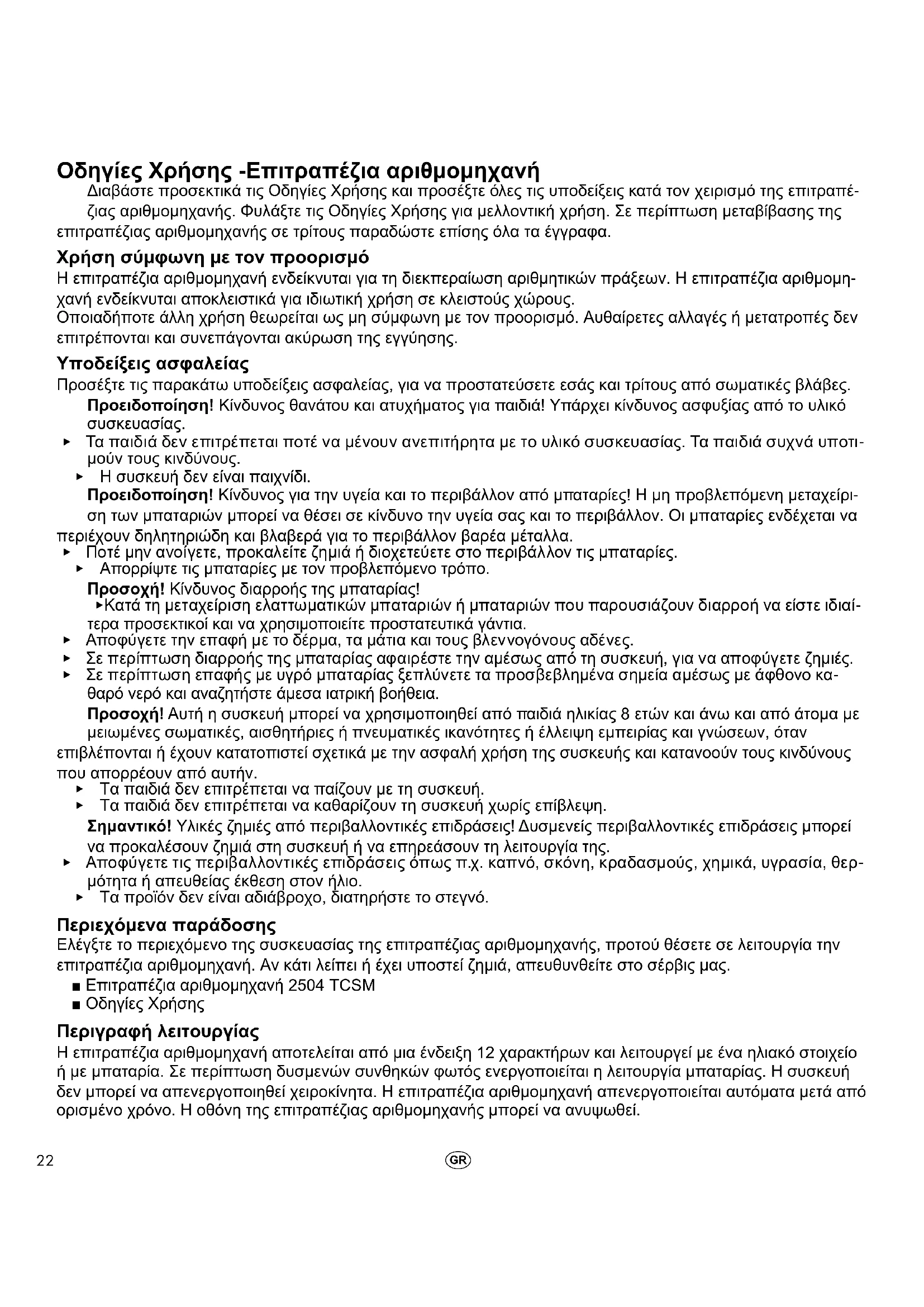 - Τα προϊόν δεν είναι αδιάβροχο, διατηρήστε το στεγνό. Περιεχόμενα παράδοσης Ελέγξτε το περιεχόμενο της συσκευασίας της επιτραπέζιας αριθμομηχανής, προτού θέσετε σε λειτουργία την επιτραπέζια αριθμομηχανή. Αν κάτι λείπει ή έχει υποστεί ζημιά, απευθυνθείτε στο σέρβις μας. ■ Επιτραπέζια αριθμομηχανή 2504 TCSM ■ Οδηγίες Χρήσης Περιγραφή λειτουργίας Η επιτραπέζια αριθμομηχανή αποτελείται από μια ένδειξη 12 χαρακτήρων και λειτουργεί με ένα ηλιακό στοιχείο ή με μπαταρία. Σε περίπτωση δυσμενών συνθηκών φωτός ενεργοποιείται η λειτουργία μπαταρίας. Η συσκευή δεν μπορεί να απενεργοποιηθεί χειροκίνητα. Η επιτραπέζια αριθμομηχανή απενεργοποιείται αυτόματα μετά από ορισμένο χρόνο. Η οθόνη της επιτραπέζιας αριθμομηχανής μπορεί να ανυψωθεί.23