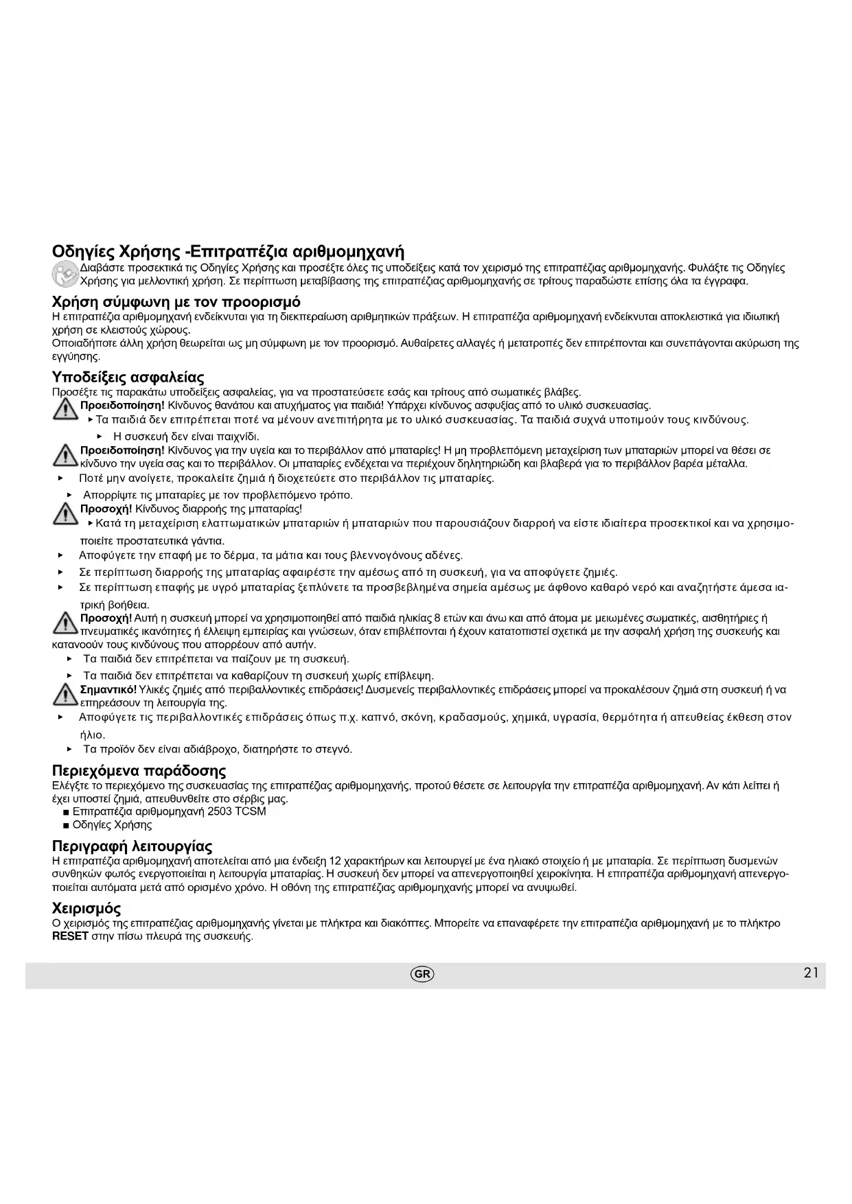 Οδηγίες Χρήσης -Επιτραπέζια αριθμομηχανή Διαβάστε προσεκτικά τις Οδηγίες Χρήσης και προσέξτε όλες τις υποδείξεις κατά τον χειρισμό της επιτραπέζιας αριθμομηχανής. Φυλάξτε τις Οδηγίες Χρήσης για μελλοντική χρήση. Σε περίπτωση μεταβίβασης της επιτραπέζιας αριθμομηχανής σε τρίτους παραδώστε επίσης όλα τα έγγραφα. Χρήση σύμφωνη με τον προορισμό Η επιτραπέζια αριθμομηχανή ενδείκνυται για τη διεκπεραίωση αριθμητικών πράξεων. Η επιτραπέζια αριθμομηχανή ενδείκνυται αποκλειστικά για ιδιωτική χρήση σε κλειστούς χώρους. Οποιαδήποτε άλλη χρήση θεωρείται ως μη σύμφωνη με τον προορισμό. Αυθαίρετες αλλαγές ή μετατροπές δεν επιτρέπονται και συνεπάγονται ακύρωση της