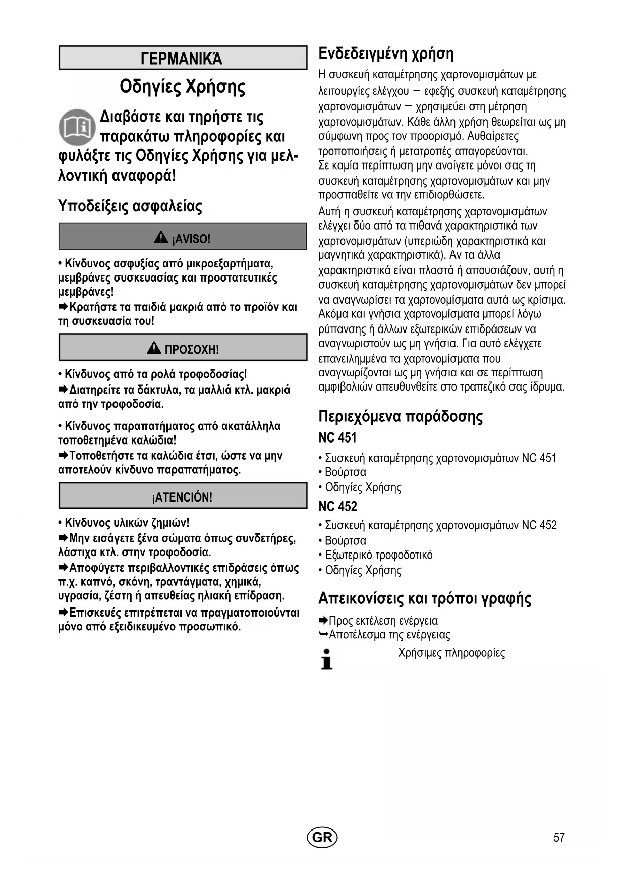 - Κίνδυνος υλικών ζημιών! Æ Μην εισάγετε ξένα σώματα όπως συνδετήρες, λάστιχα κτλ. στην τροφοδοσία. Æ Αποφύγετε περιβαλλοντικές επιδράσεις όπως π.χ. καπνό, σκόνη, τραντάγματα, χημικά, υγρασία, ζέστη ή απευθείας ηλιακή επίδραση. Æ Επισκευές επιτρέπεται να πραγματοποιούνται μόνο από εξειδικευμένο προσωπικό. Ενδεδειγμένη χρήση Η συσκευή καταμέτρησης χαρτονομισμάτων με λειτουργίες ελέγχου – εφεξής συσκευή καταμέτρησης χαρτονομισμάτων – χρησιμεύει στη μέτρηση χαρτονομισμάτων. Κάθε άλλη χρήση θεωρείται ως μη σύμφωνη προς τον προορισμό. Αυθαίρετες τροποποιήσεις ή μετατροπές απαγορεύονται. Σε καμία περίπτωση μην ανοίγετε μόνοι σας τη συσκευή καταμέτρησης χαρτονομισμάτων και μην προσπαθείτε να την επιδιορθώσετε. Αυτή η συσκευή καταμέτρησης χαρτονομισμάτων ελέγχει δύο από τα πιθανά χαρακτηριστικά των χαρτονομισμάτων (υπεριώδη χαρακτηριστικά και μαγνητικά χαρακτηριστικά). Αν τα άλλα χαρακτηριστικά είναι πλαστά ή απουσιάζουν, αυτή η συσκευή καταμέτρησης χαρτονομισμάτων δεν μπορεί να αναγνωρίσει τα χαρτονομίσματα αυτά ως κρίσιμα. Ακόμα και γνήσια χαρτονομίσματα μπορεί λόγω ρύπανσης ή άλλων εξωτερικών επιδράσεων να αναγνωριστούν ως μη γνήσια. Για αυτό ελέγχετε επανειλημμένα τα χαρτονομίσματα που αναγνωρίζονται ως μη γνήσια και σε περίπτωση αμφιβολιών απευθυνθείτε στο τραπεζικό σας ίδρυμα. Περιεχόμενα παράδοσης NC 451