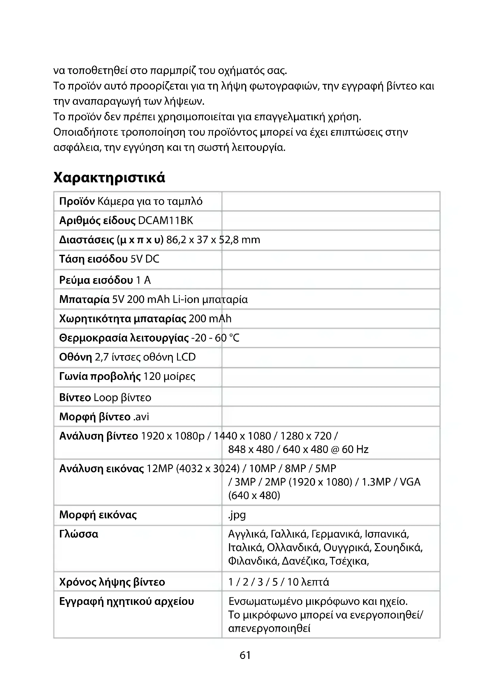 Οδηγός γρήγορης εκκίνησης Κάμερα για το ταμπλό DCAM11BK Για περισσότερες πληροφορίες δείτε το εκτενές online εγχειρίδιο: ned.is/dcam11bk Προοριζόμενη χρήση Το DCAM11BK είναι μία κάμερα για το ταμπλό του αυτοκινήτου η οποία μπορεί61 να τοποθετηθεί στο παρμπρίζ του οχήματός σας. Το προϊόν αυτό προορίζεται για τη λήψη φωτογραφιών, την εγγραφή βίντεο και την αναπαραγωγή των λήψεων. Το προϊόν δεν πρέπει χρησιμοποιείται για επαγγελματική χρήση. Οποιαδήποτε τροποποίηση του προϊόντος μπορεί να έχει επιπτώσεις στην ασφάλεια, την εγγύηση και τη σωστή λειτουργία. Χαρακτηριστικά Προϊόν Κάμερα για το ταμπλό Αριθμός είδους DCAM11BK Διαστάσεις (μ x π x υ) 86,2 x 37 x 52,8 mm Τάση εισόδου 5V DC Ρεύμα εισόδου 1 A Μπαταρία 5V 200 mAh Li-ion μπαταρία Χωρητικότητα μπαταρίας 200 mAh Θερμοκρασία λειτουργίας -20 - 60 °C Οθόνη 2,7 ίντσες οθόνη LCD Γωνία προβολής 120 μοίρες Βίντεο Loop βίντεο Μορφή βίντεο .avi Ανάλυση βίντεο 1920 x 1080p / 1440 x 1080 / 1280 x 720 / 848 x 480 / 640 x 480 @ 60 Hz Ανάλυση εικόνας 12MP (4032 x 3024) / 10MP / 8MP / 5MP / 3MP / 2MP (1920 x 1080) / 1.3MP / VGA (640 x 480) Μορφή εικόνας .jpg Γλώσσα Αγγλικά, Γαλλικά, Γερμανικά, Ισπανικά, Ιταλικά, Ολλανδικά, Ουγγρικά, Σουηδικά, Φιλανδικά, Δανέζικα, Τσέχικα, Χρόνος λήψης βίντεο 1 / 2 / 3 / 5 / 10 λεπτά Εγγραφή ηχητικού αρχείου Ενσωματωμένο μικρόφωνο και ηχείο. Το μικρόφωνο μπορεί να ενεργοποιηθεί/ απενεργοποιηθεί62 Κάρτα μνήμης Κάρτα microSD Χωρητικότητα κάρτα μνήμης 1 - 32 GB Διεπαφή USB USB 2.0 Κύρια μέρη (εικόνα A)