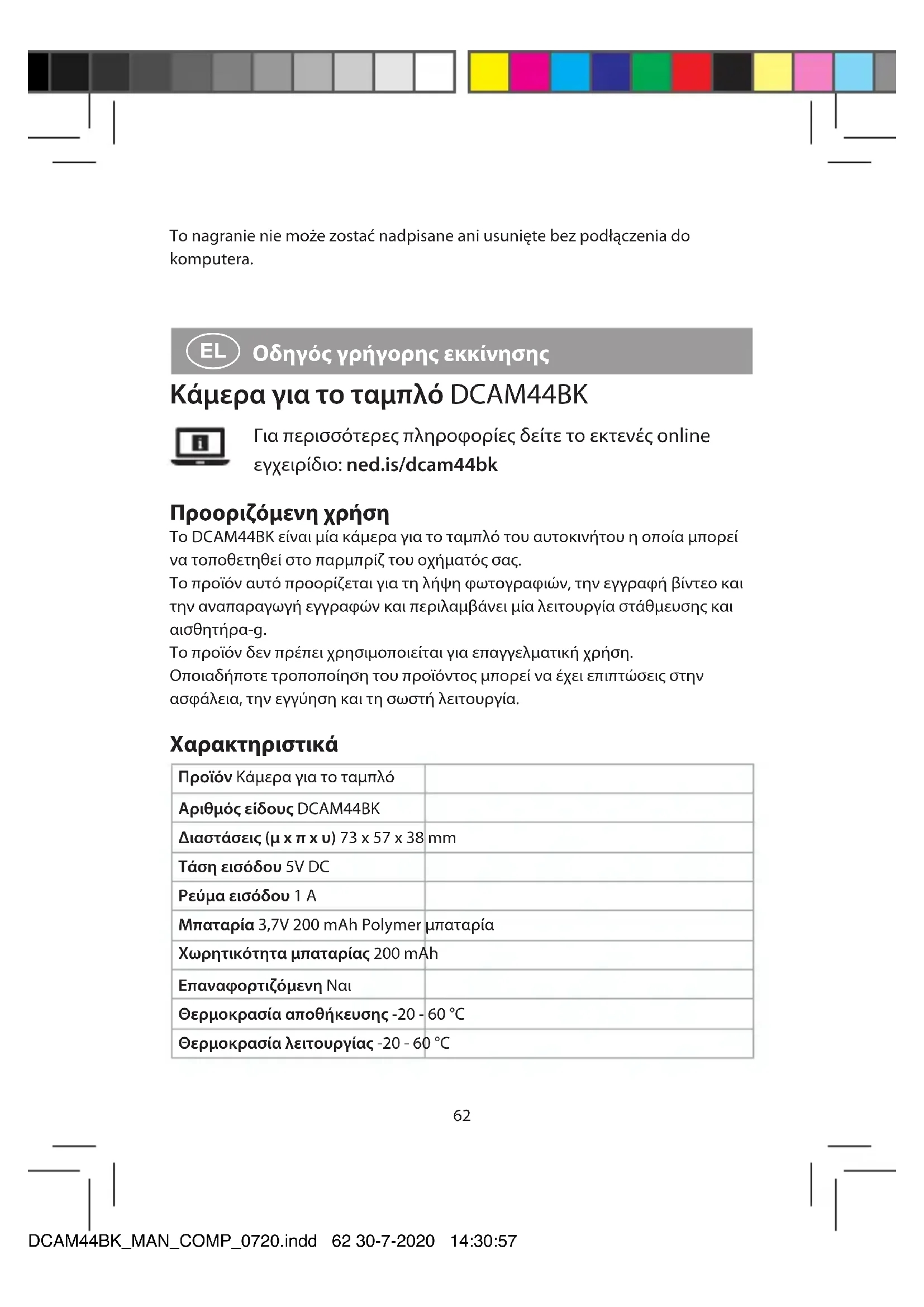 Οδηγός γρήγορης εκκίνησης Κάμερα για το ταμπλό DCAM44BK Για περισσότερες πληροφορίες δείτε το εκτενές online εγχειρίδιο: ned.is/dcam44bk Προοριζόμενη χρήση Το DCAM44BK είναι μία κάμερα για το ταμπλό του αυτοκινήτου η οποία μπορεί να τοποθετηθεί στο παρμπρίζ του οχήματός σας. Το προϊόν αυτό προορίζεται για τη λήψη φωτογραφιών, την εγγραφή βίντεο και την αναπαραγωγή εγγραφών και περιλαμβάνει μία λειτουργία στάθμευσης και αισθητήρα-g. Το προϊόν δεν πρέπει χρησιμοποιείται για επαγγελματική χρήση. Οποιαδήποτε τροποποίηση του προϊόντος μπορεί να έχει επιπτώσεις στην ασφάλεια, την εγγύηση και τη σωστή λειτουργία. Χαρακτηριστικά Προϊόν Κάμερα για το ταμπλό Αριθμός είδους DCAM44BK Διαστάσεις (μ x π x υ) 73 x 57 x 38 mm Τάση εισόδου 5V DC Ρεύμα εισόδου 1 A Μπαταρία 3,7V 200 mAh Polymer μπαταρία Χωρητικότητα μπαταρίας 200 mAh Επαναφορτιζόμενη Ναι Θερμοκρασία αποθήκευσης -20 - 60 °C Θερμοκρασία λειτουργίας -20 - 60 °C DCAM44BK_MAN_COMP_0720.indd 62 30-7-2020 14:30:5763 Οθόνη 2,45 ίντσες οθόνη LCD Γωνία προβολής 140 μοίρες Χρόνος λήψης βίντεο 1 / 3 / 5 λεπτά Μορφή βίντεο .mp4 Κωδικοποίηση βίντεο H.264 / H.265 Ανάλυση βίντεο 3840 x 2160 P30 / 2560 x 1440 P30 / 1920 x 1080 P60 / 1920 x 1080 P30 Ανάλυση εικόνας 12M / 10M / 8M / 5M / 3M / VGA Γλώσσα Αγγλικά, Γαλλικά, Γερμανικά, Ιταλικά, Ολλανδικά, Σουηδικά, Φιλανδικά, Ρουμανικά, Ουγγρικά, Τσέχικα, , Εγγραφή ηχητικού αρχείου Ενσωματωμένο μικρόφωνο Κάρτα μνήμης Κάρτα microSD Χωρητικότητα κάρτα μνήμης 4 - 128 GB Διεπαφή USB Micro USB Αυτόματη απενεργοποίηση 1 / 3 / 5 λεπτά Προφύλαξη οθόνης 1 / 3 / 5 λεπτά Κύρια μέρη (εικόνα A)