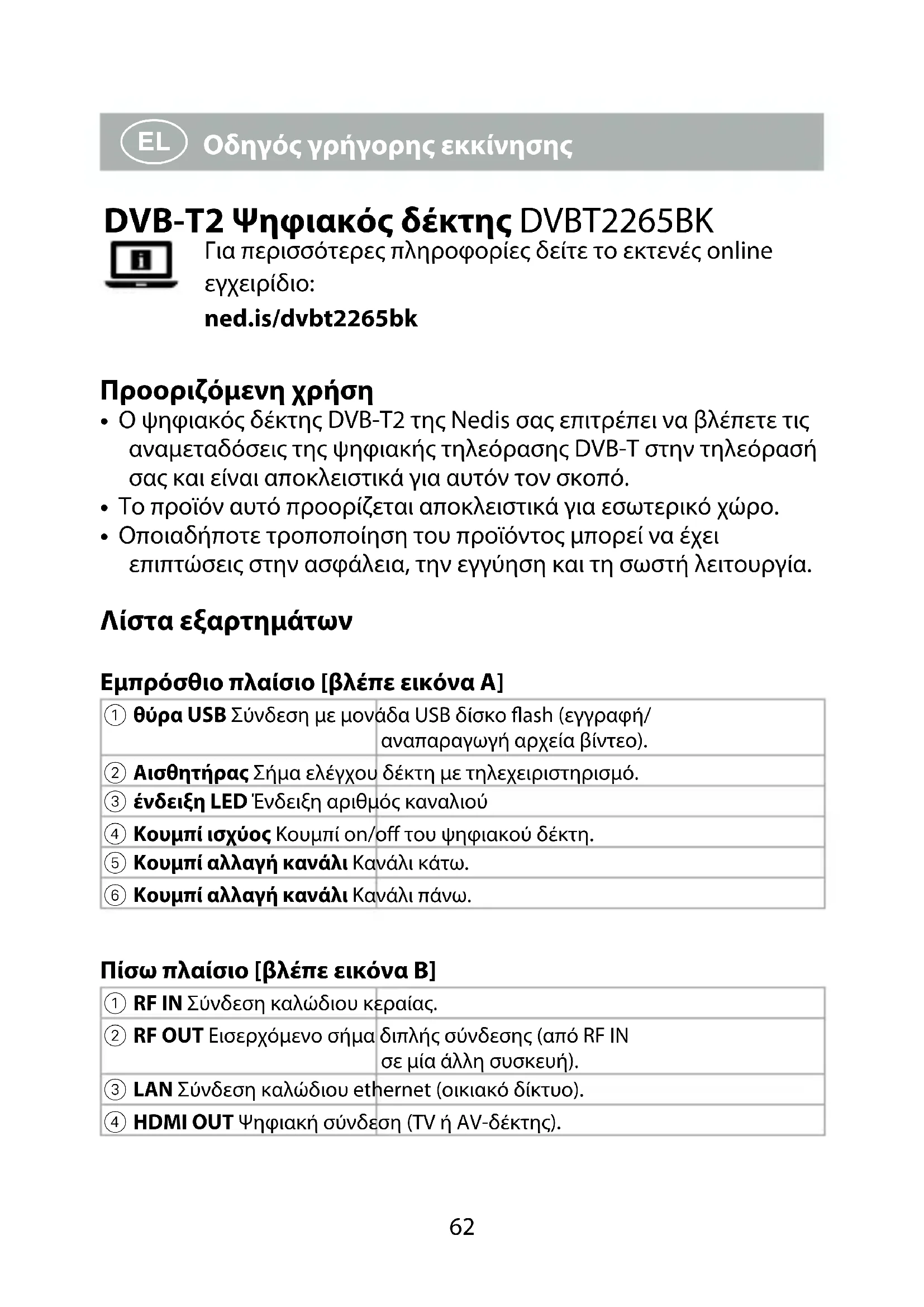 Οδηγός γρήγορης εκκίνησης DVB-T2 Ψηφιακός δέκτης DVBT2265BK Για περισσότερες πληροφορίες δείτε το εκτενές online εγχειρίδιο: ned.is/dvbt2265bk Προοριζόμενη χρήση